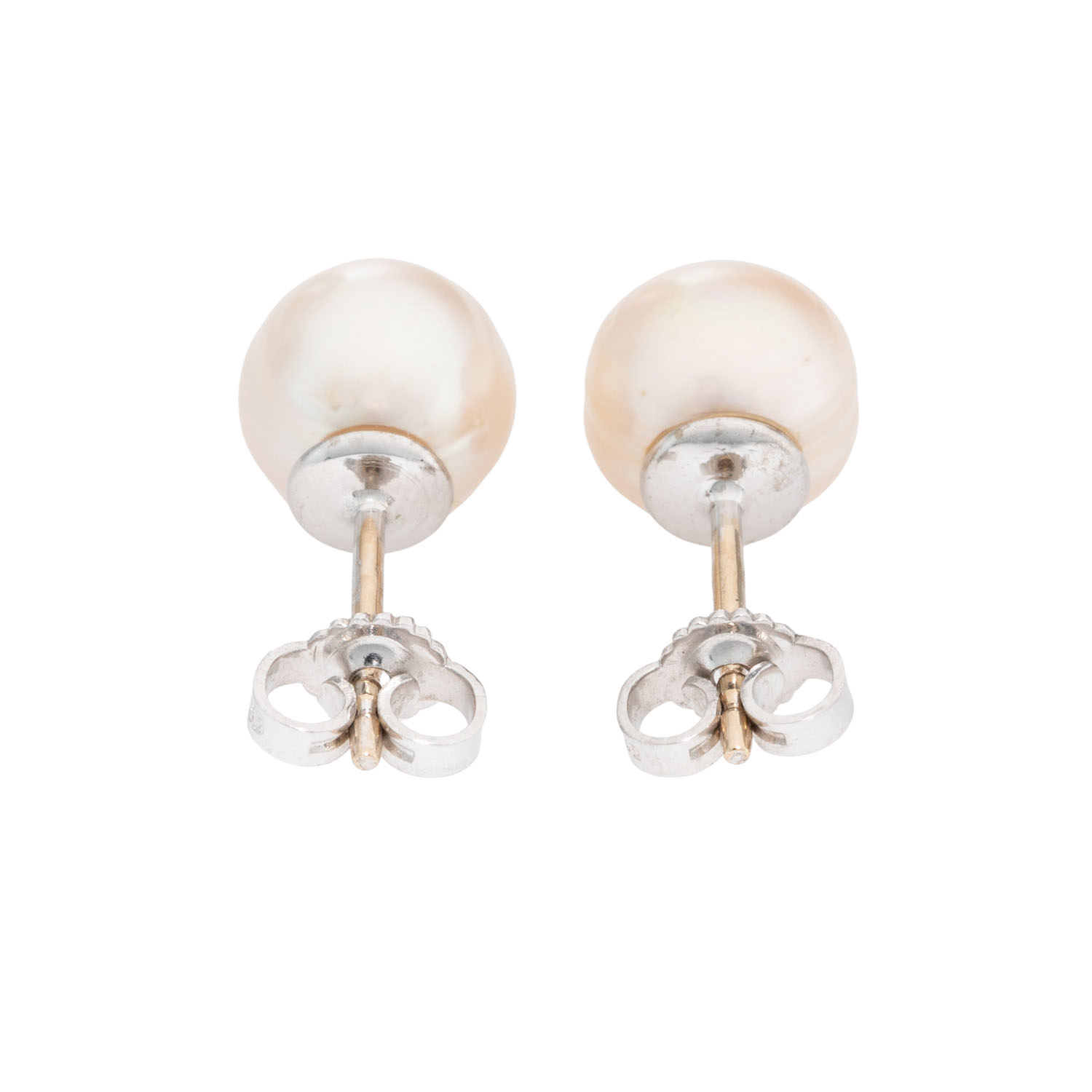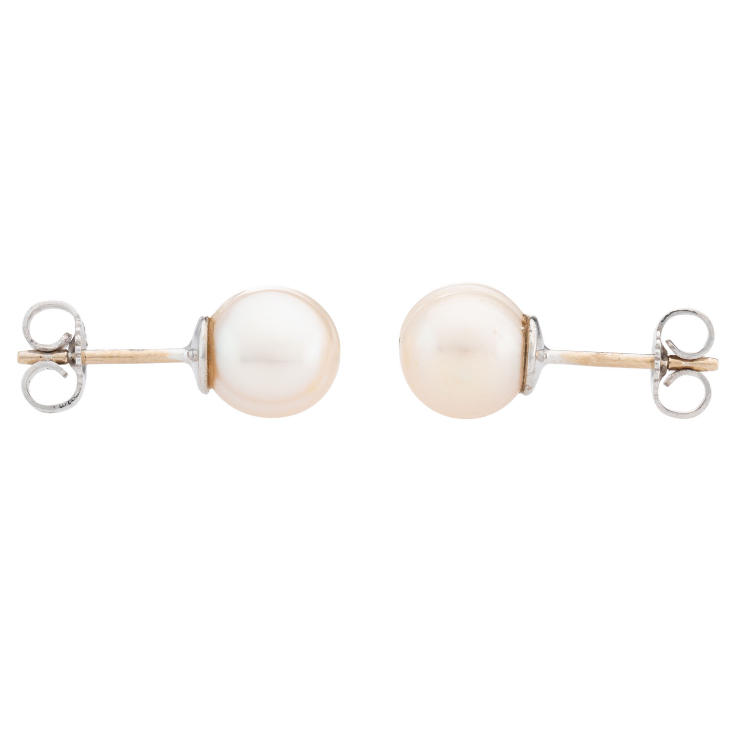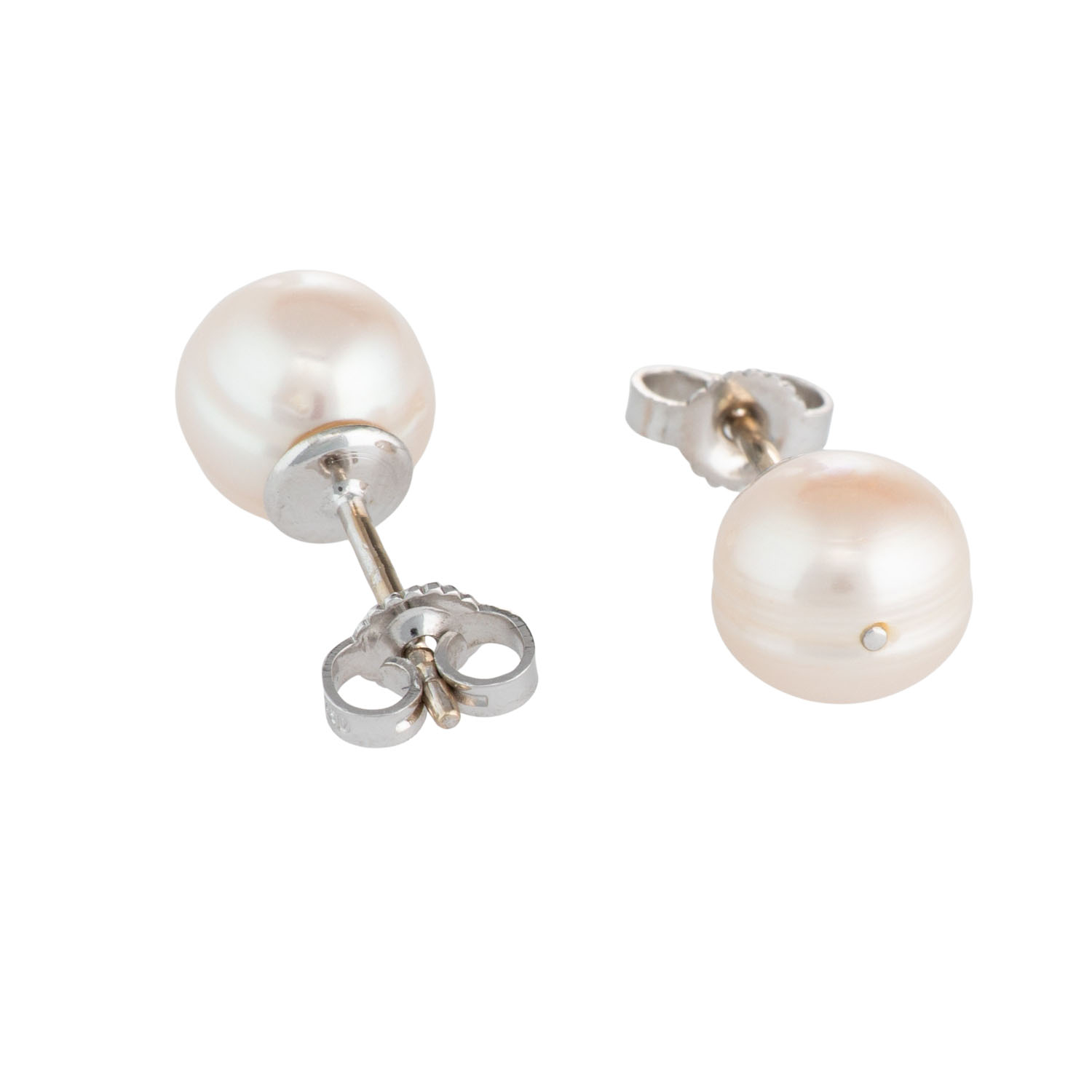 weiß-rosé farbig, leicht barockförmig, D: ca. 8,1- 8,6 mm, schöner Lüster, mit natürlichen WMM, WG 18K, 3 g, 21. Jh., minimale Tragespuren.