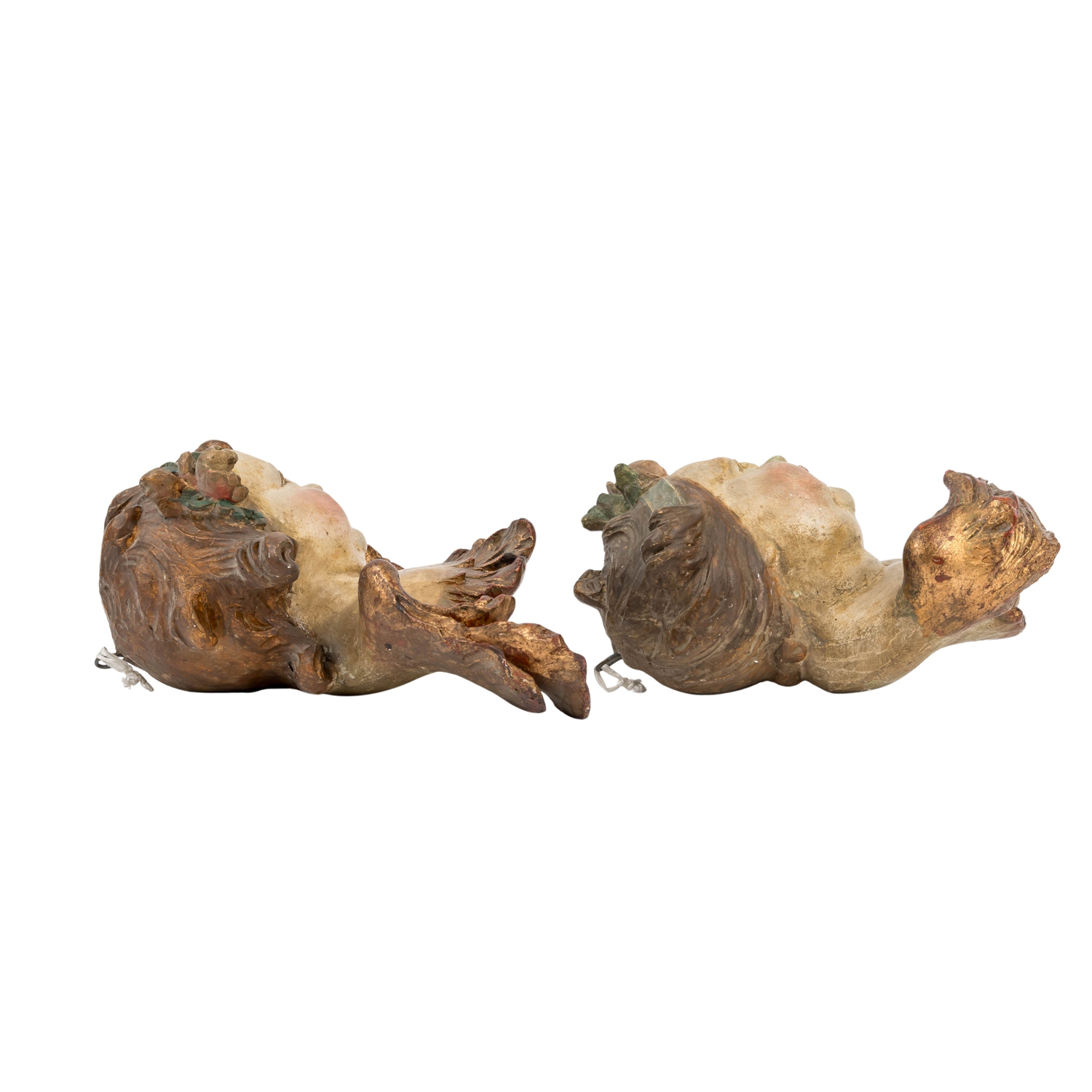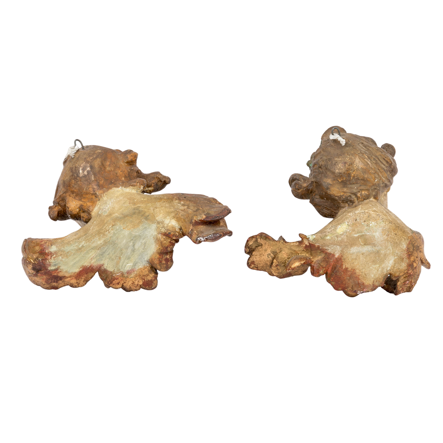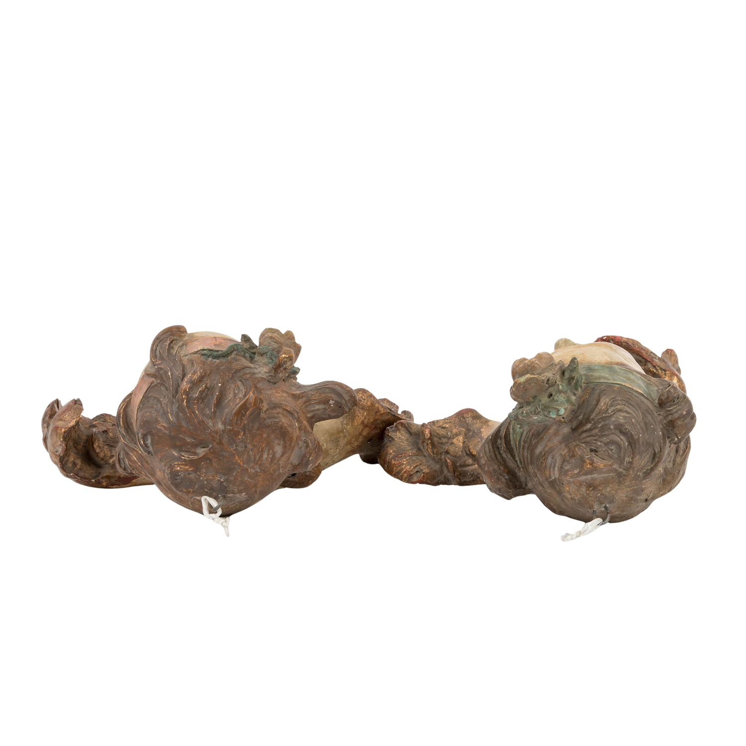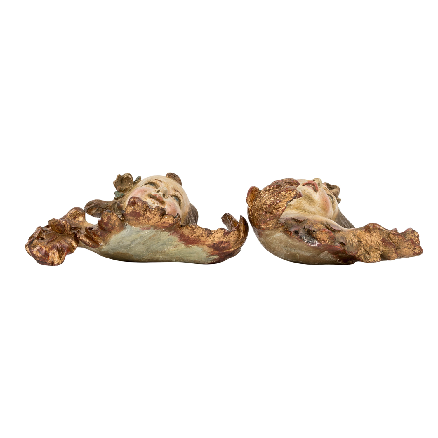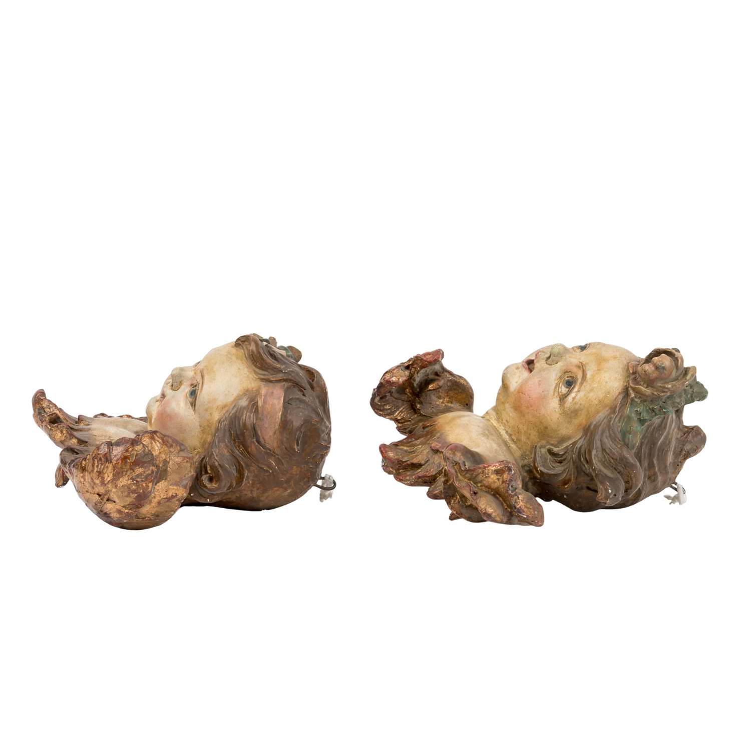Stuck, polychrom gefasst, zwei vollplastische Engelsköpfe mit Flügeln, je Band mit Blüte im Haar tragend, H: ca. 22 cm und 24 cm. Altersspuren, Fassung part. berieben, teilw. bestoßen und kaschiert.