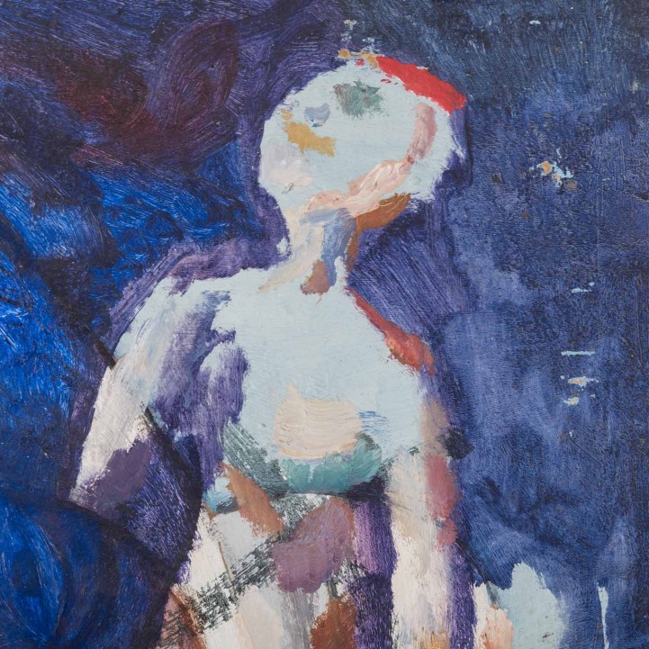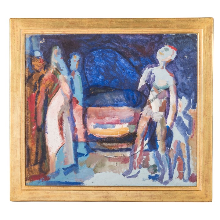 wohl eine Theaterszene, Öl/Karton, HxB: ca. 50x57 cm (61x66 cm mit Rahmen). Altersspuren, part. Berieb. Mit Rahmen (verso Etikett Kunsthaus Schaller, Stuttgart). PROVENIENZ: aus dem Umkreis der Künstlers.