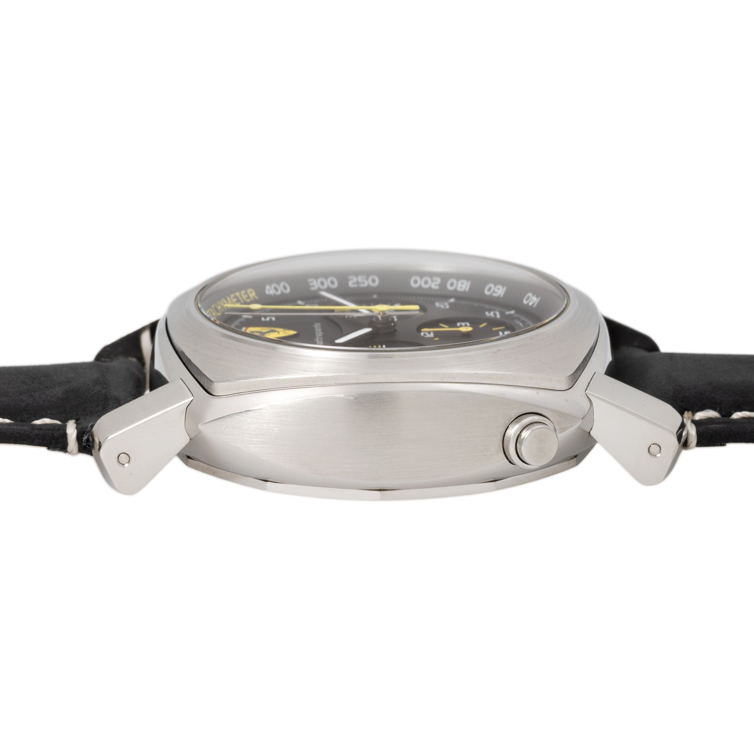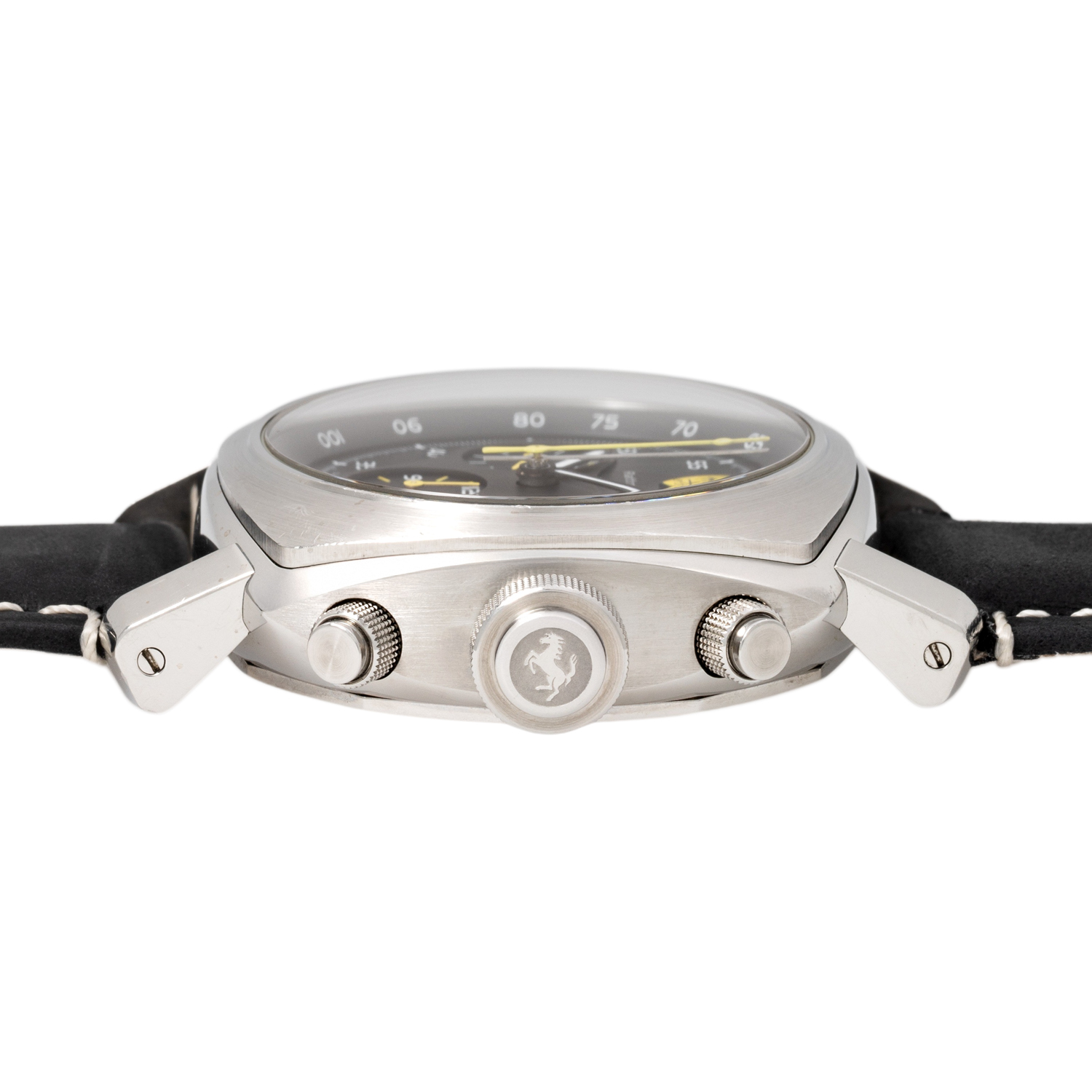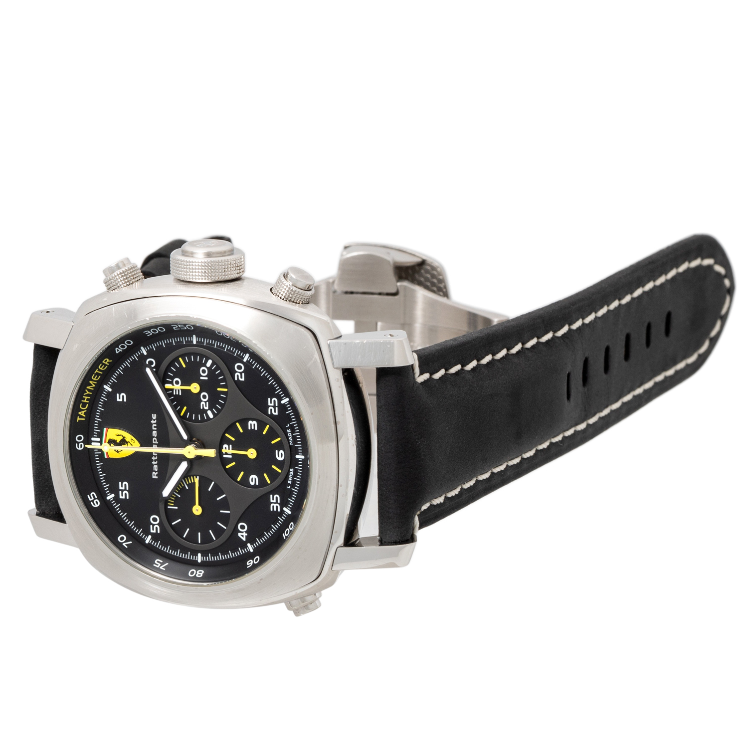 Edelstahl, verschraubte Krone und Drücker. Automatic-Werk Basis Kal. ETA 7750, modifiziert mit Säulenrad-Chronograph und Rattrapante, sehr gute Gangwerte (-10s/d, 283°). Schwarz-graues Zifferblatt mit arabischen Ziffern und Ferrari-Logo, Leuchtzeiger. Neues Lederband mit originaler Butterfly Faltschließe in Edelstahl. Sichtbare Gebrauchsspuren an Gehäuse und Schließe. Durchmesser ca. 45mm gemessen ohne Krone.