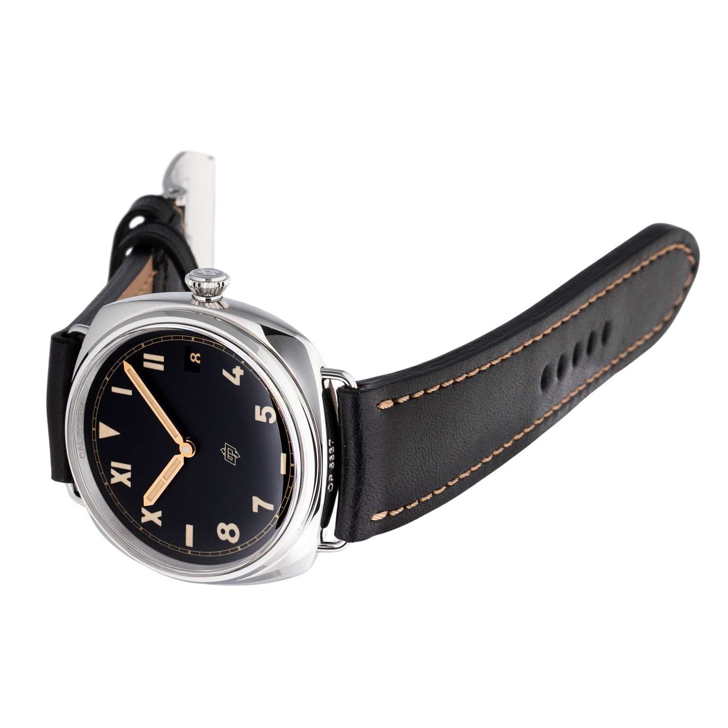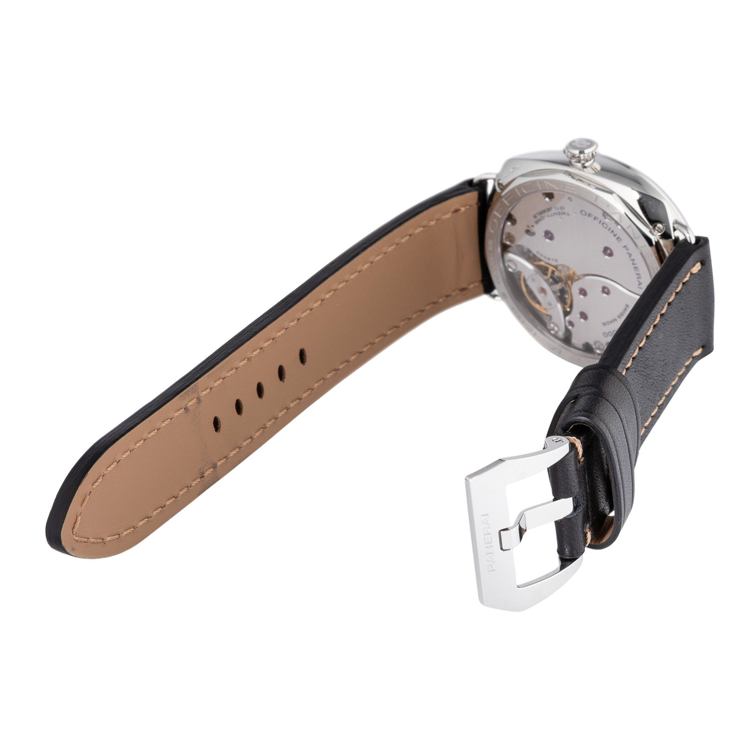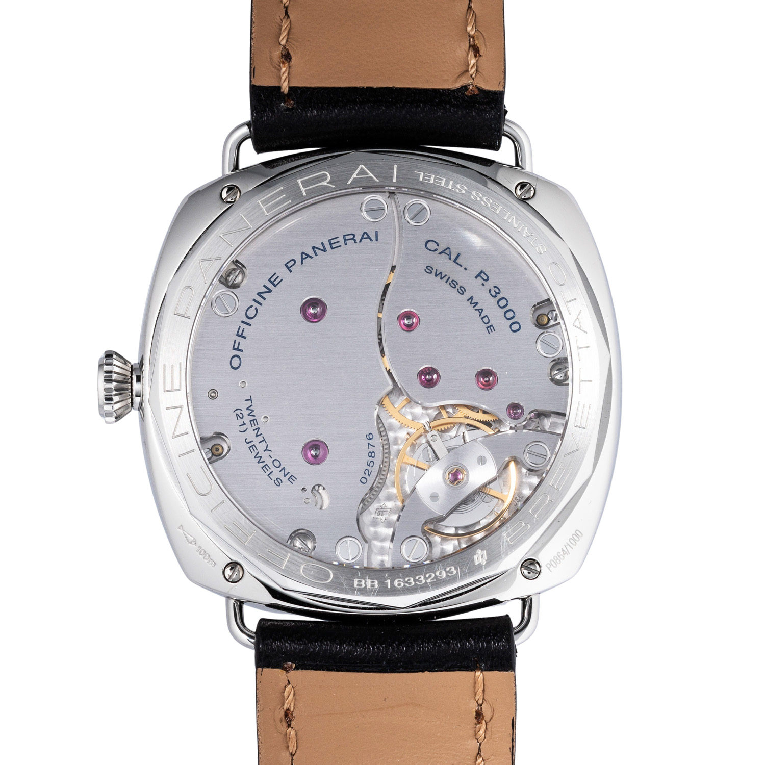 Edelstahl. Glasboden. Seriennummer BB1633293. Handaufzugswerk P.3000 mit sehr guten Gangwerten (+8 s/d. 318° Amplitude). Schwarzes Zifferblatt mit römischen und arabischen Ziffern, Eisenbahnminuterie und Datumsanzeige. Neues Lederband mit der Originalen Panerai Dornschließe aus Edelstahl. Guter Zustand mit leichten Tragespuren. Original Box, Anleitung, Etiketten mit Ref.Nr. und UVP und Garantieheft inkl. Garantiezertifikat anbei. Gekauft im März 2014 in der Panerai Boutique in München. Durchmesser ca. 47 mm (gemessen ohne Krone).