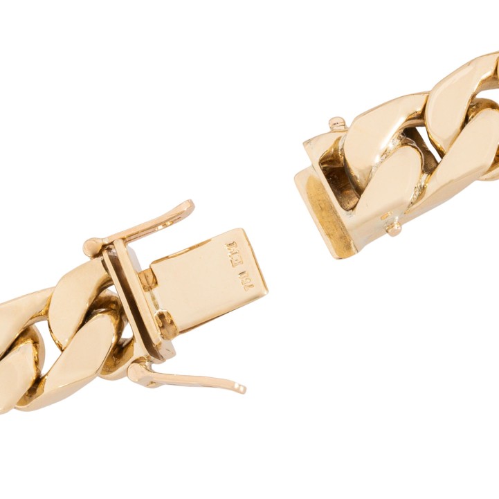 GG 18K, 64,7 g, L: 19 cm, B x H: 9 x 3,5 mm, Kastenschloß mit 2 Sicherungsachten, Ende 20. Jh., sehr guter Zustand. Handarbeit.