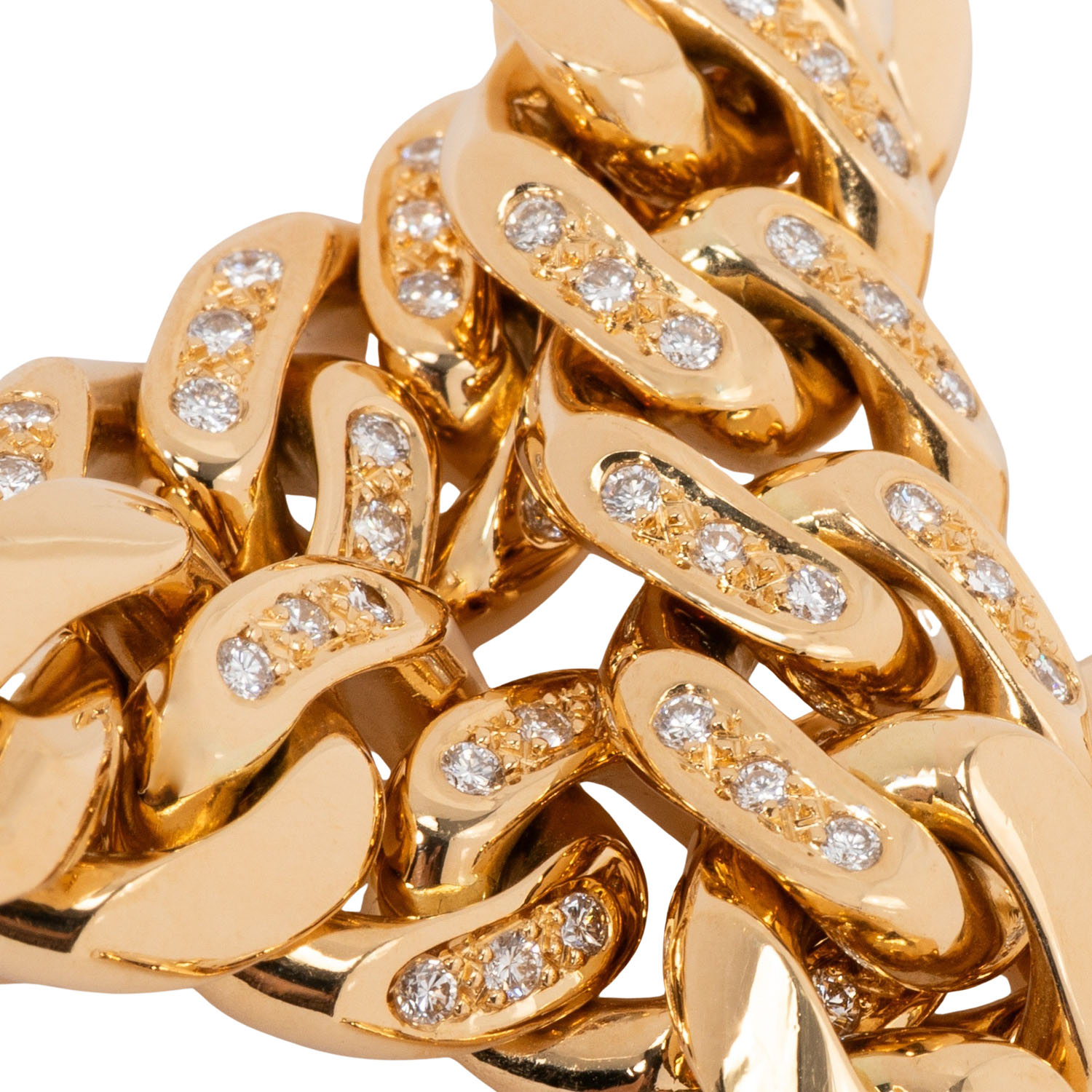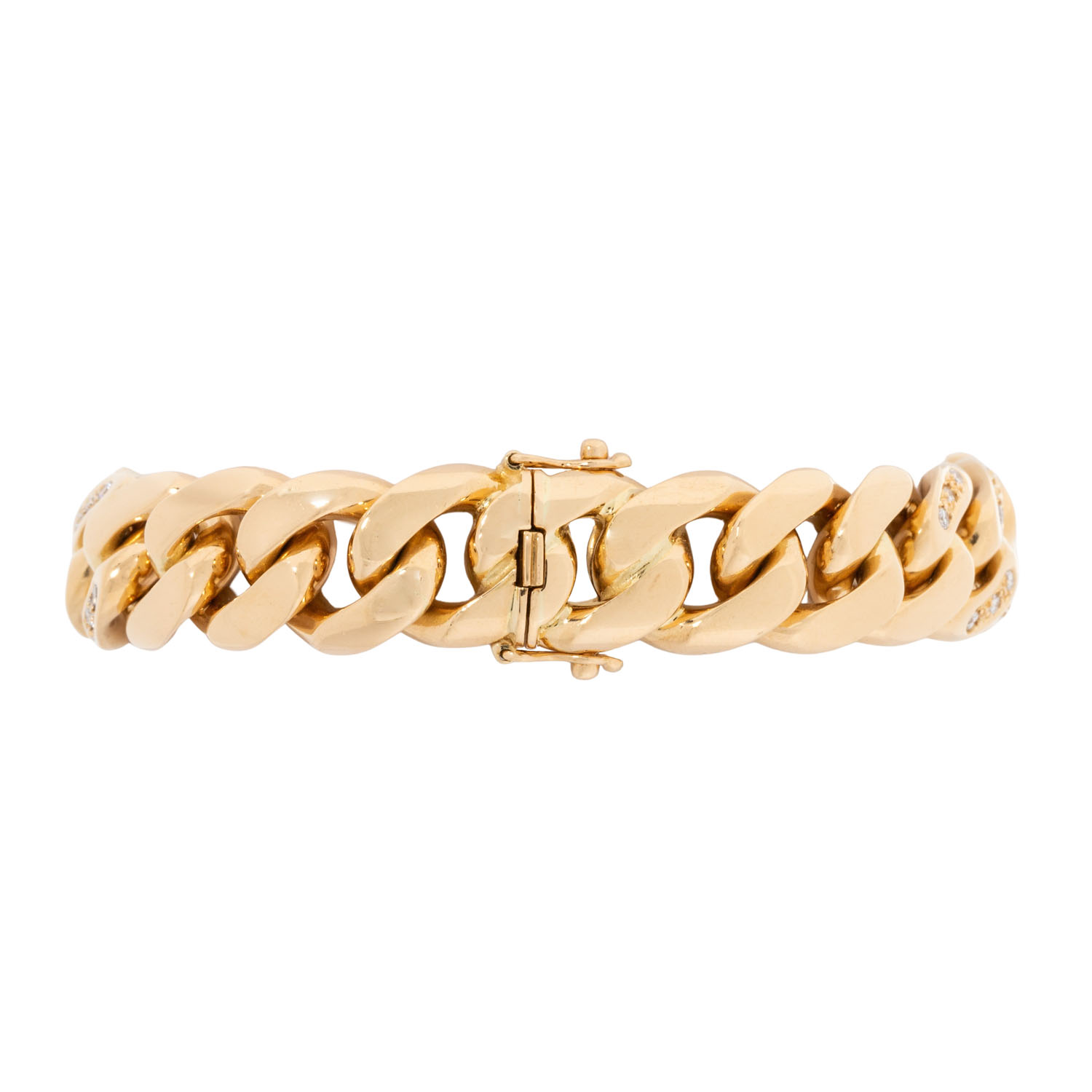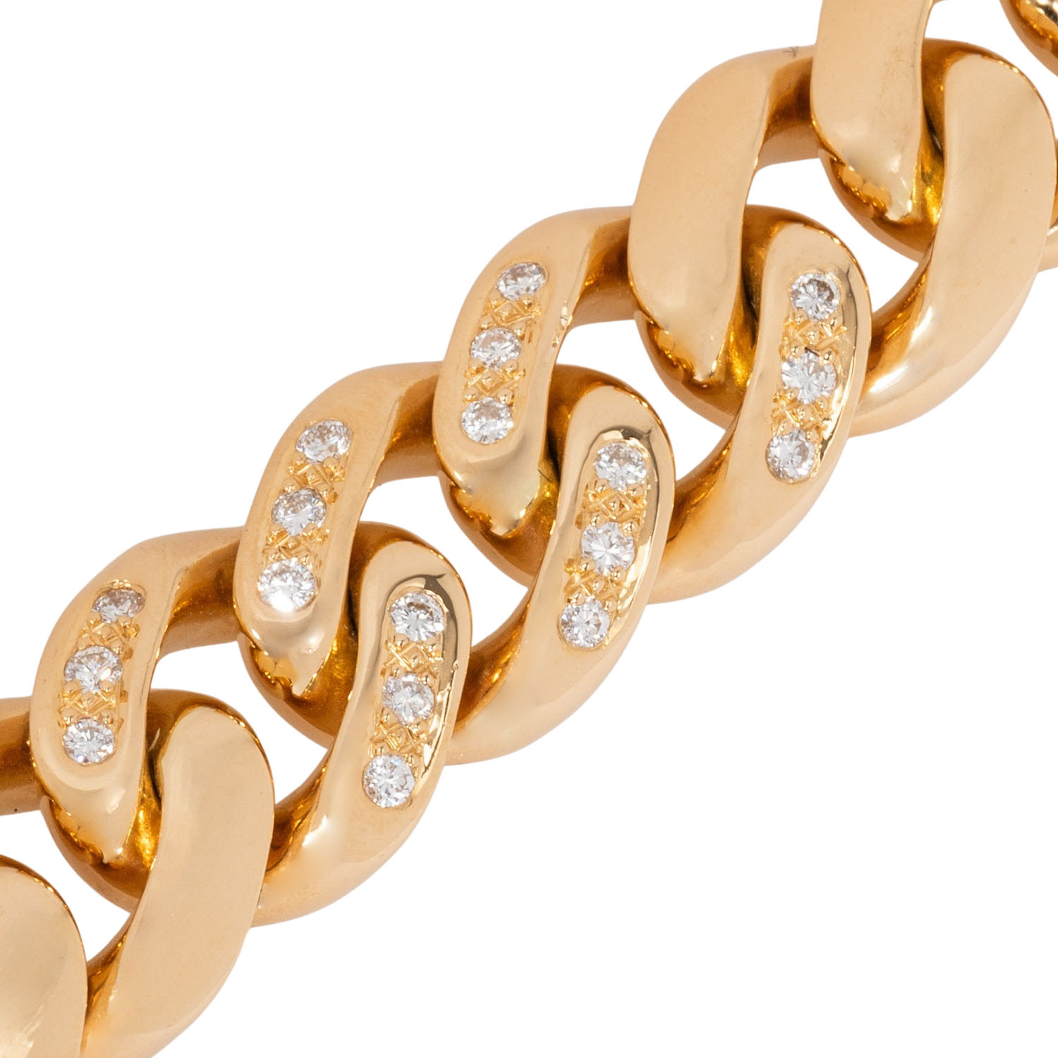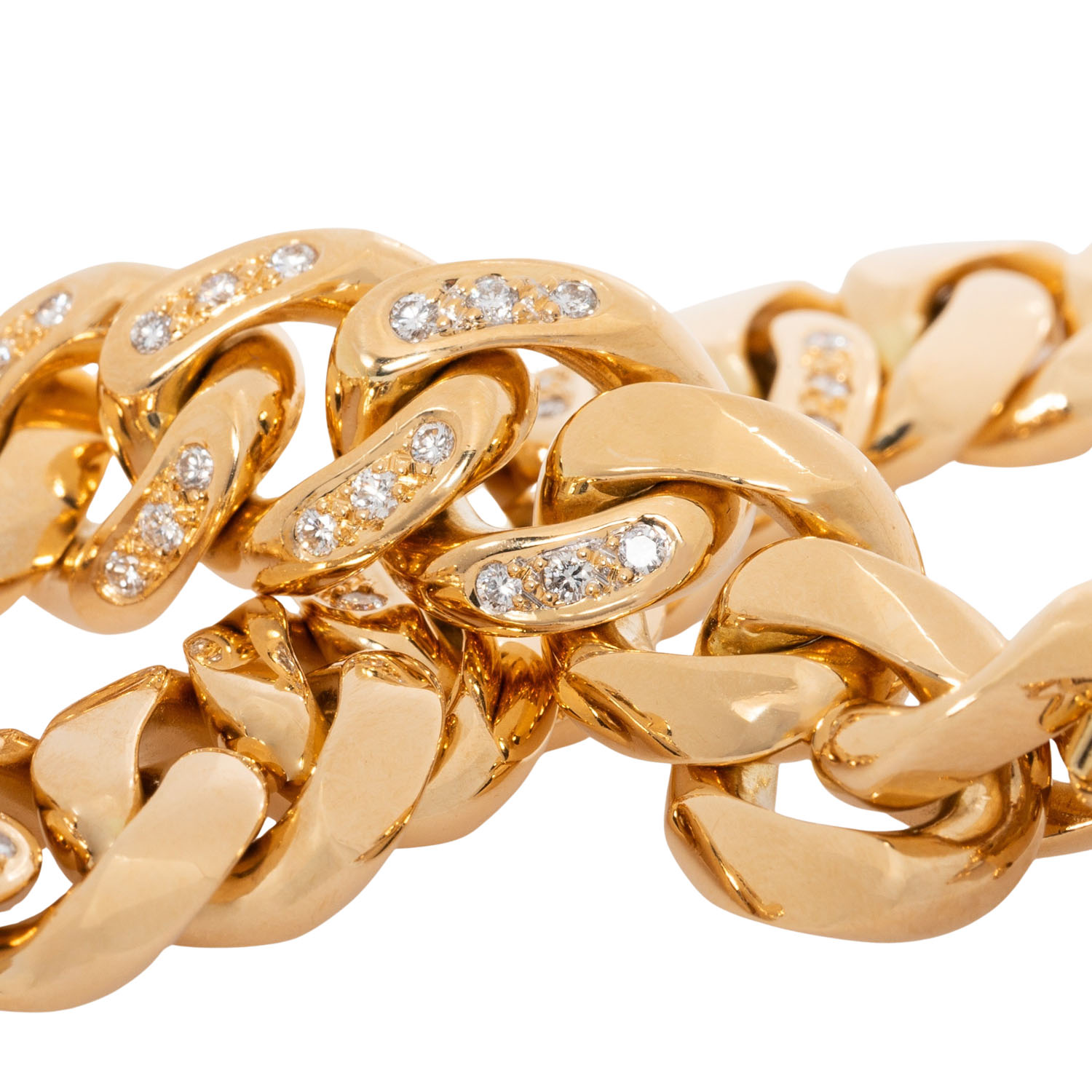 insges. 54 Brillanten, ges. ca. 0,8 ct, gute Farbe und Reinheit, GG 18K, 94,0 g, L: 19 cm, B: 12,8 mm, Kastenschloß, 2 Sicherheitsachten, Ende 20. Jh., minimale Tragespuren. Handarbeit.