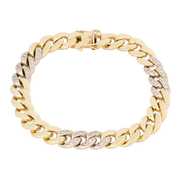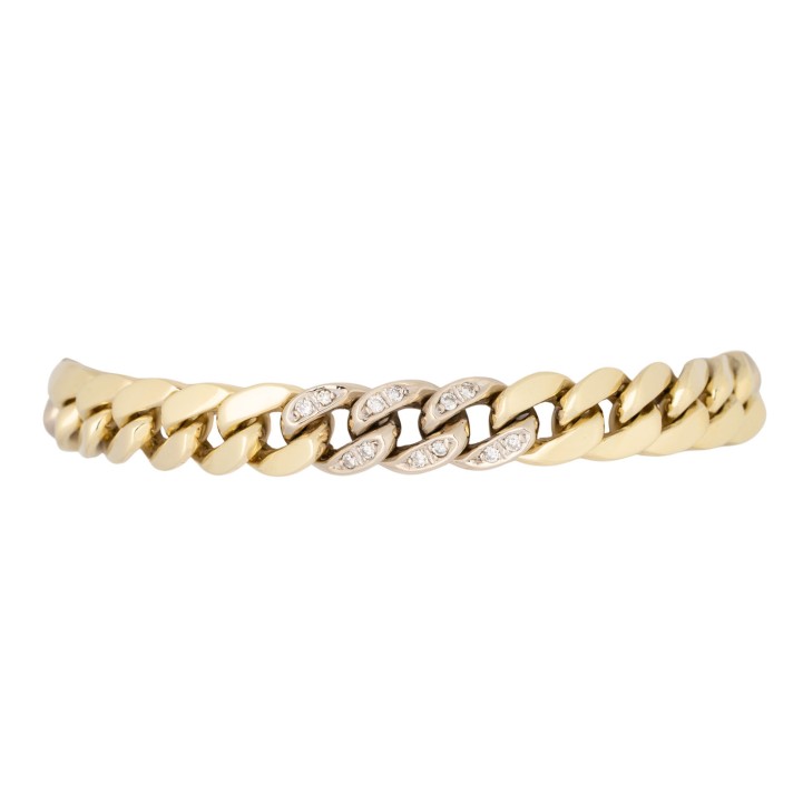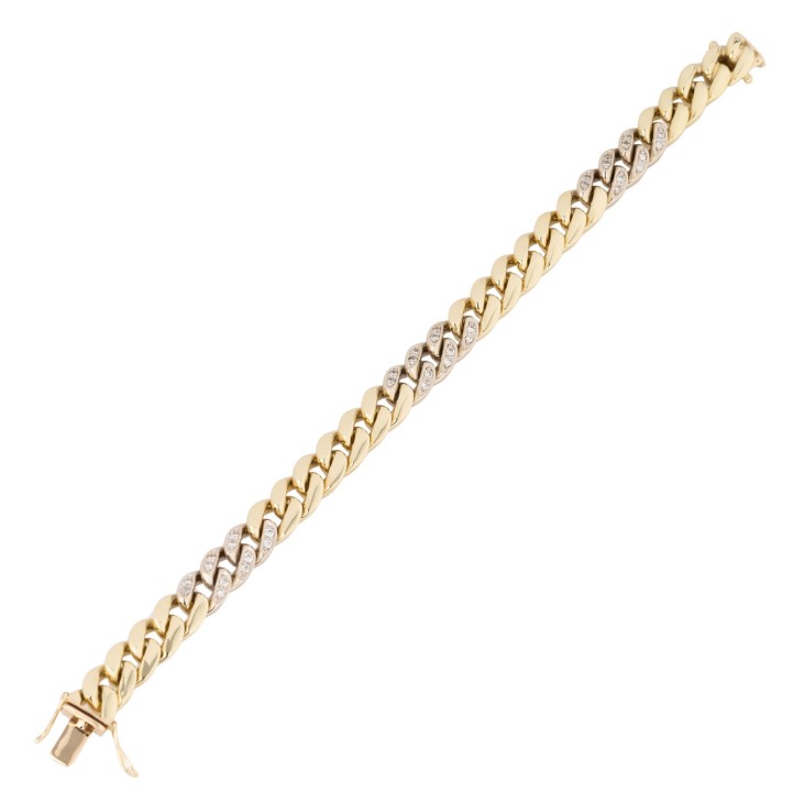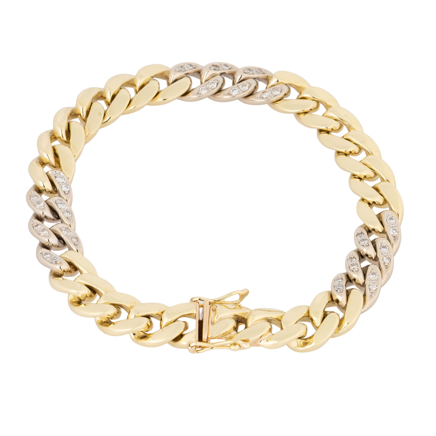 zus. ca. 0,68 ct, gestempelt, gute Farbe und Reinheit, GG 14K, 51,4 g, L: ca. 19,5 cm, B: ca. 1 cm, Ende 20. Jh., leichteTragespuren, Kastenschloß mit 2 Sicherheitsachten, solide Ausführung.