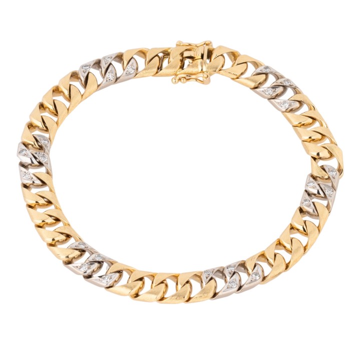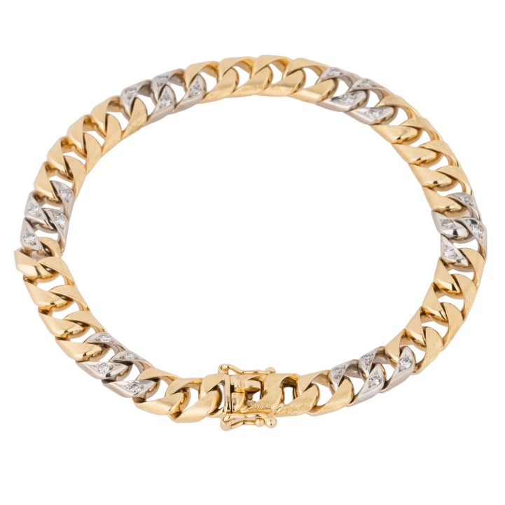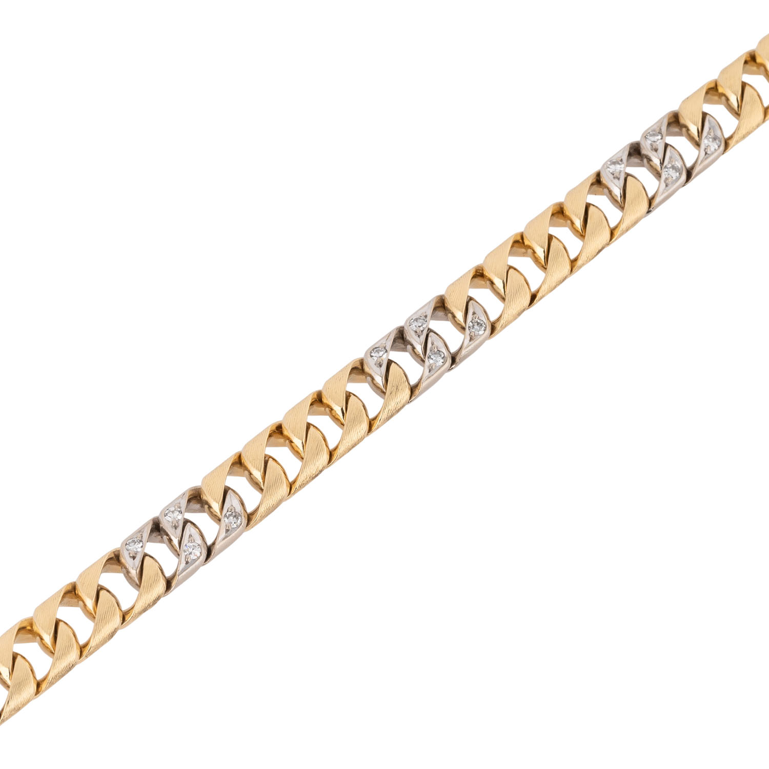 mattiert, zus. ca. 0,24 ct, gute Farbe und Reinheit, GG/WG 18K, 31,5 g, L: ca. 18 cm, B: ca. 6,5 mm, Ende 20. Jh., leichteTragespuren, Kastenschloß mit 2 Sicherheitsachten.