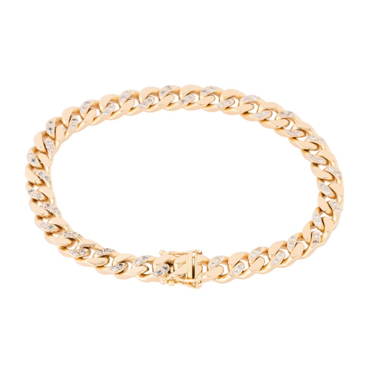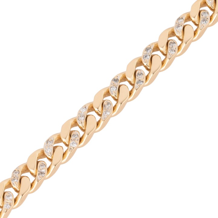 zus. ca. 0,80 ct, gestempelt, gute Farbe und Reinheit, GG 18K, 27,6 g, L: ca. 18 cm, B: ca. 6 mm, Ende 20. Jh., leichteTragespuren, Kastenschloß mit 2 Sicherheitsachten.