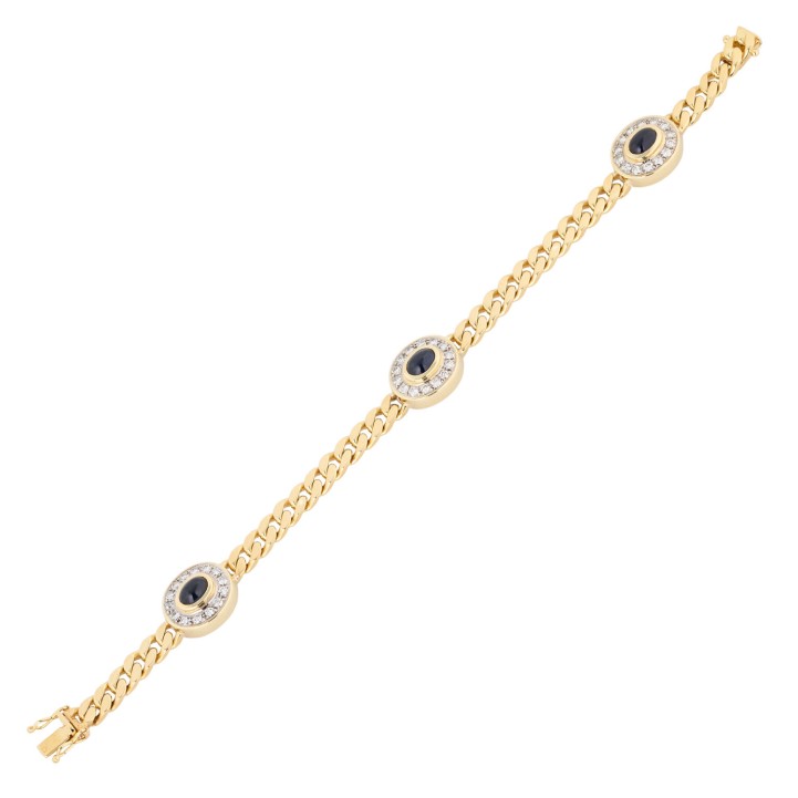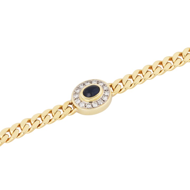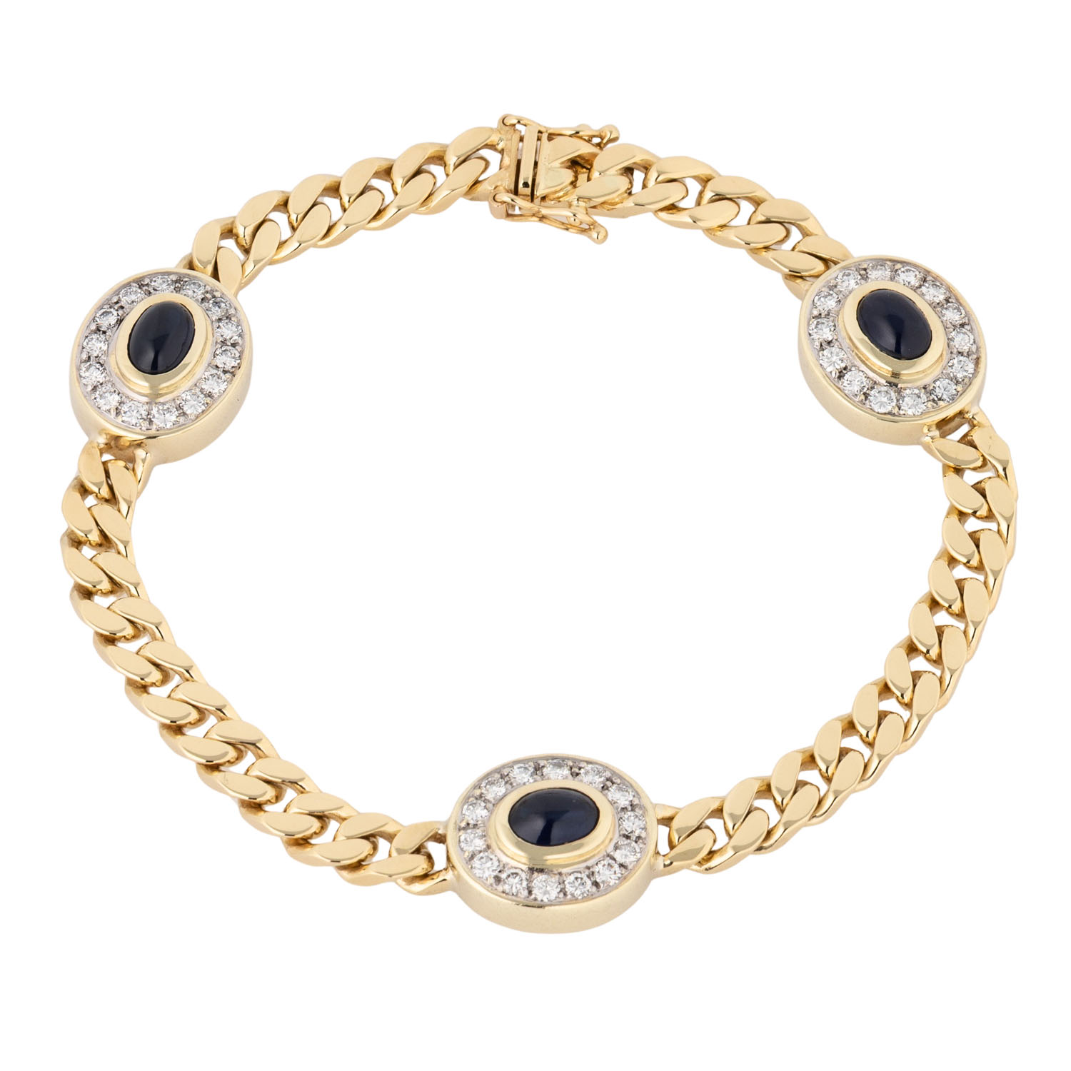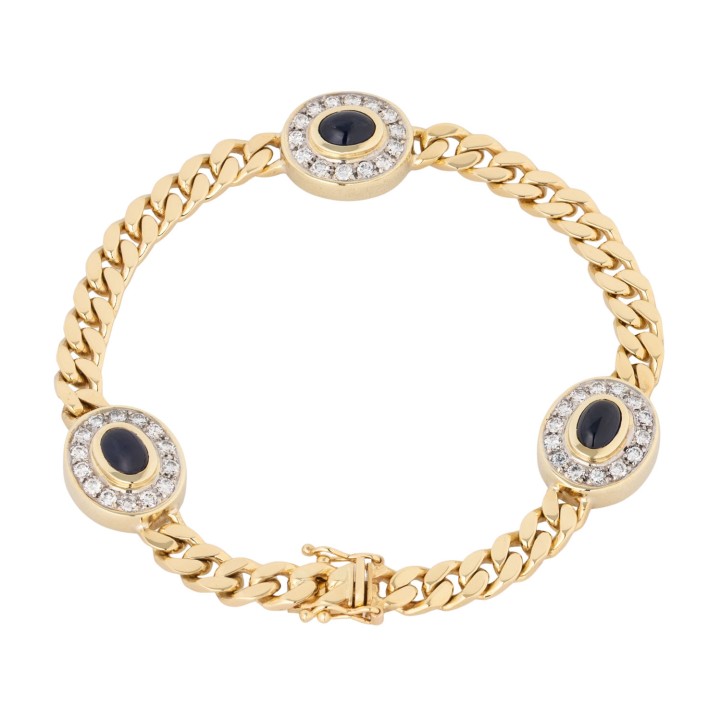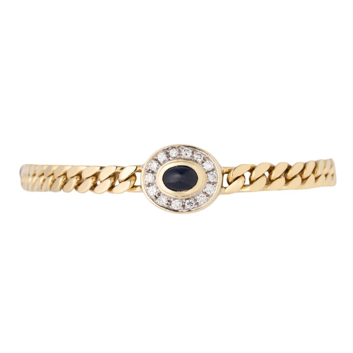 zus. ca. 1,25 ct, grav., gute Farbe und Reinheit, Saphircabochon, ca. 7 x 5 mm, GG 18K, 33,5 g, L: ca. 19,5 cm, B: ca. 13,5 mm, 1970er Jahre, leichte Tragespuren.