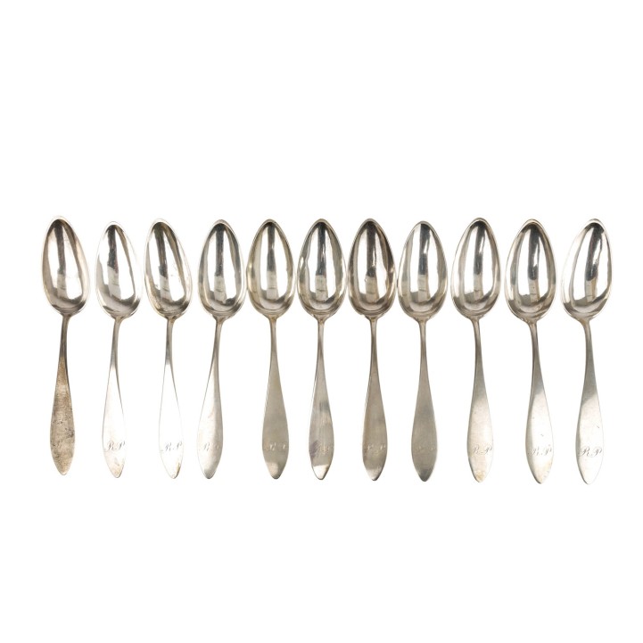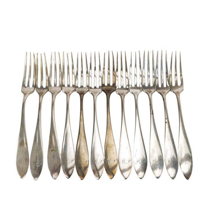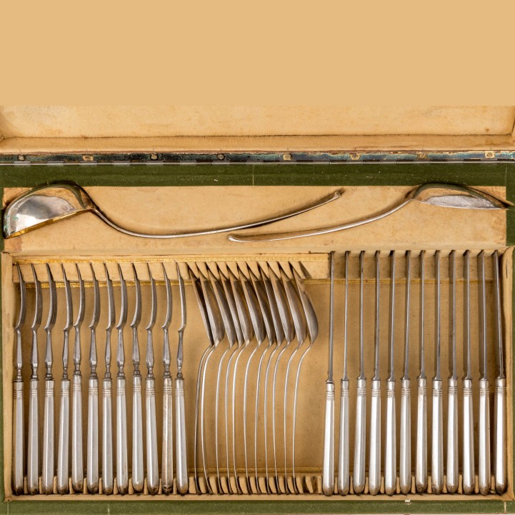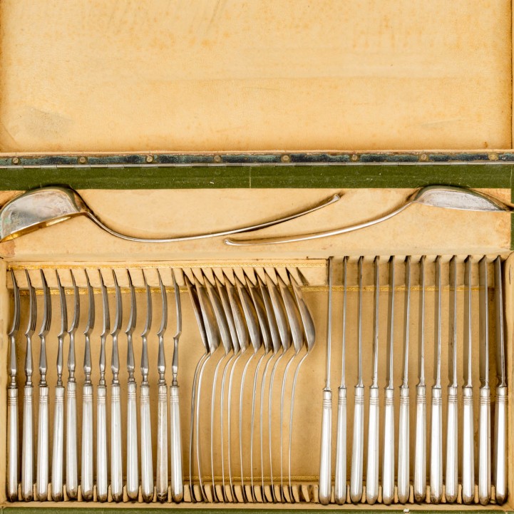 Umfangreiches Besteckset aus 13-lötigem Silber, 12 Menümesser, 12 Menügabeln, 11 Menülöffel, 11 Dessertlöffel, 12 Vorspeisenmesser, 12 Vorspeisengabeln, 10 Vorspeisenlöffel, 1 Suppenkelle, 1 gr. Ragoutlöffel, BZ., original lederbezogene Holzkassette mit Innenbezug aus Rehleder, monogrammiert 'RP', Silber Gewicht 1827 g., Holzkassette, HxBxT: 11/49/32 cm. Kleinere Schäden am Funier.