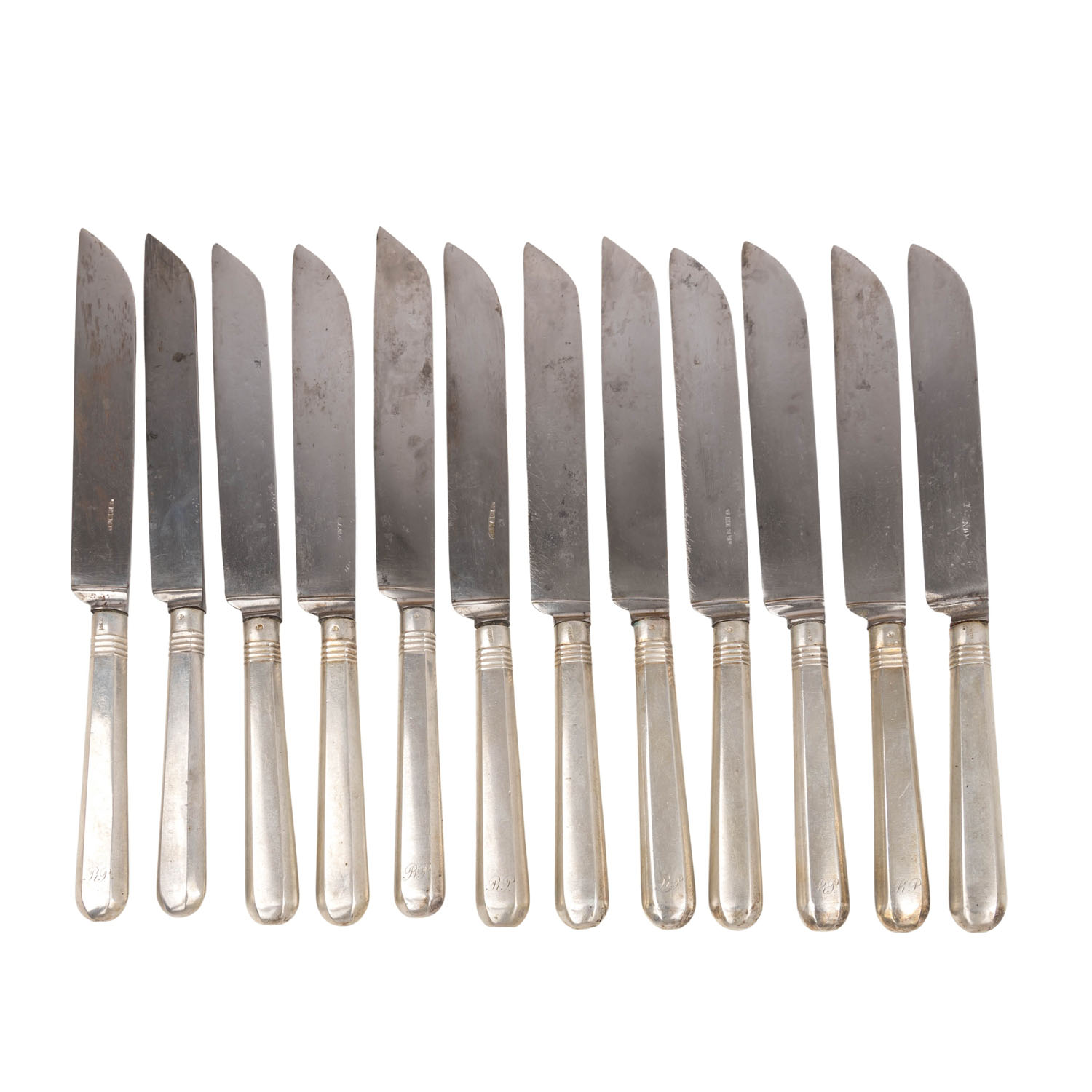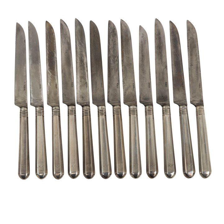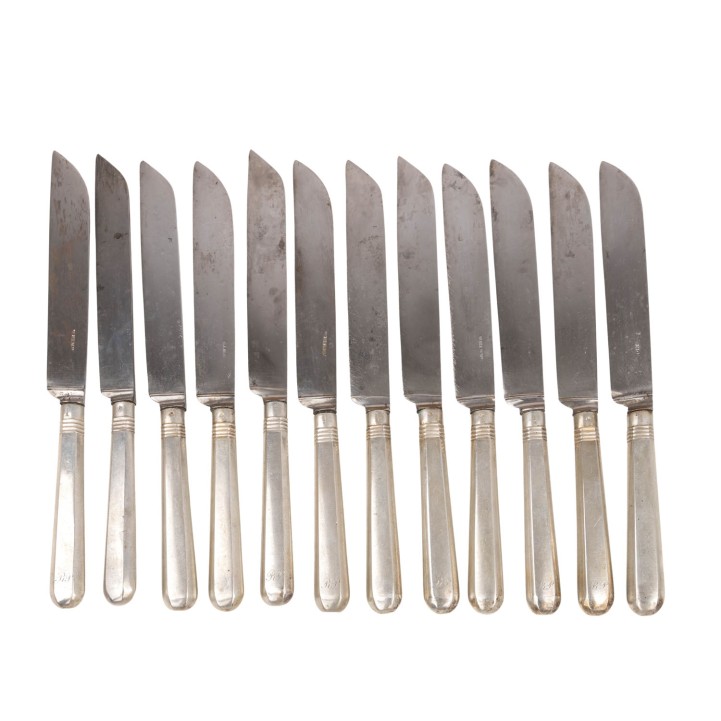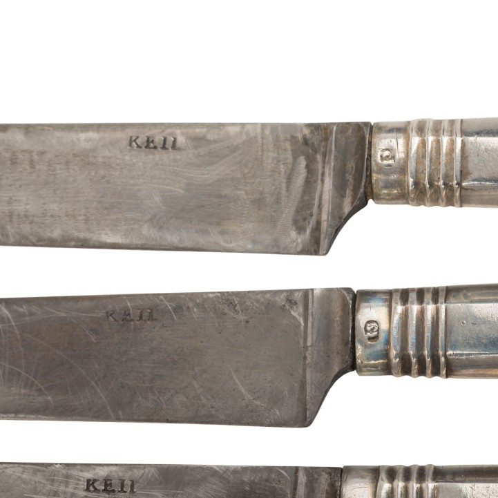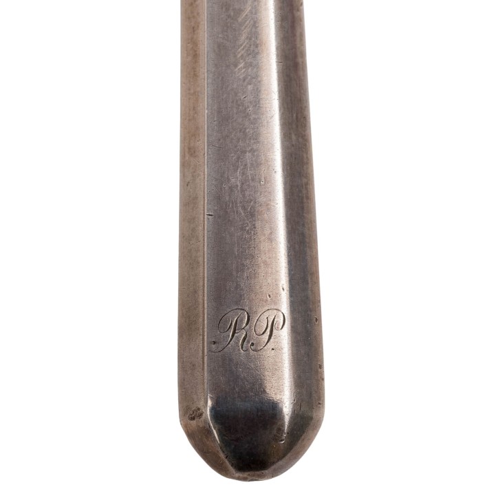 Provinienz: Rosine Pummerer (1840-1923), verheiratete Simson aus Passau. Sie war die Tochter des Anton V. Pummerer (1812-1888) und Urenkelin des Joachim E. Pummerer (1734-1823), der während der Auflösung des Passauer Fürstbistums-Hochstifts (1803) und der napoleonischen Ära Bürgermeister der Stadt Passau war und 1805 den Franzosenkaiser empfing. Außerdem war sie die Großmutter der bekannten Passauer Malerin Margarete Schneider-Reichel, die mit Otmar Schneider (1894-1967) verheiratet war. In zweiter Ehe verheiratete sich O. Schneider mit Kunigunde Müller, die das Besteck kurz vor ihrem Tode dem jetzigen Besitzer, dem Neffen von O. Schneider, schenkte.