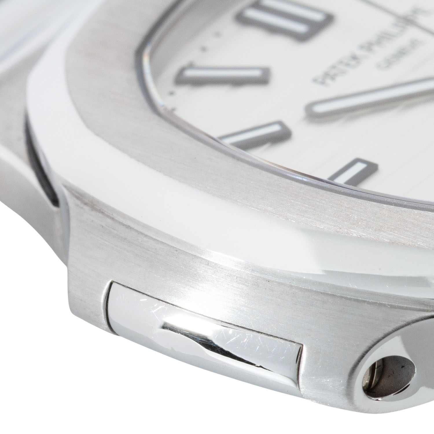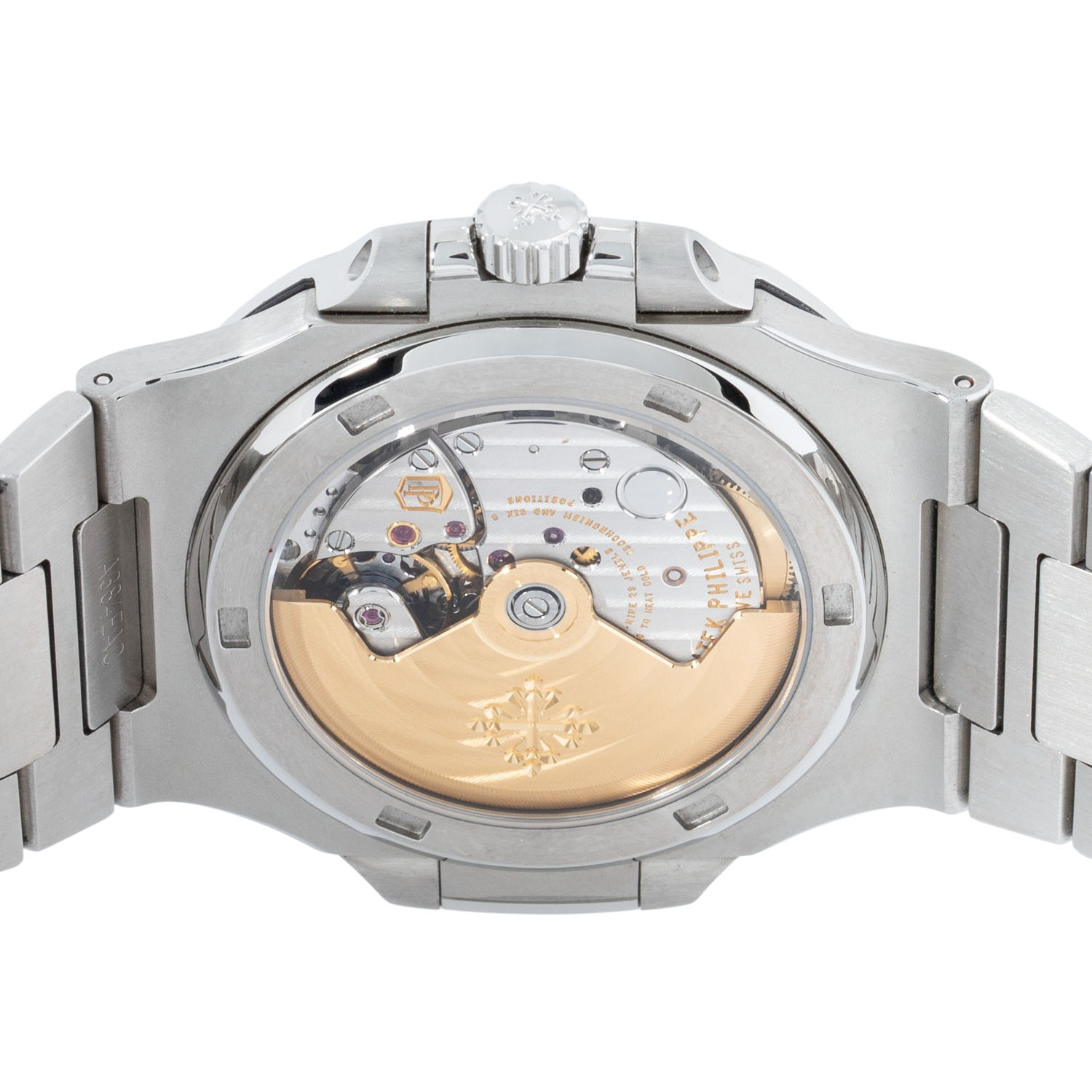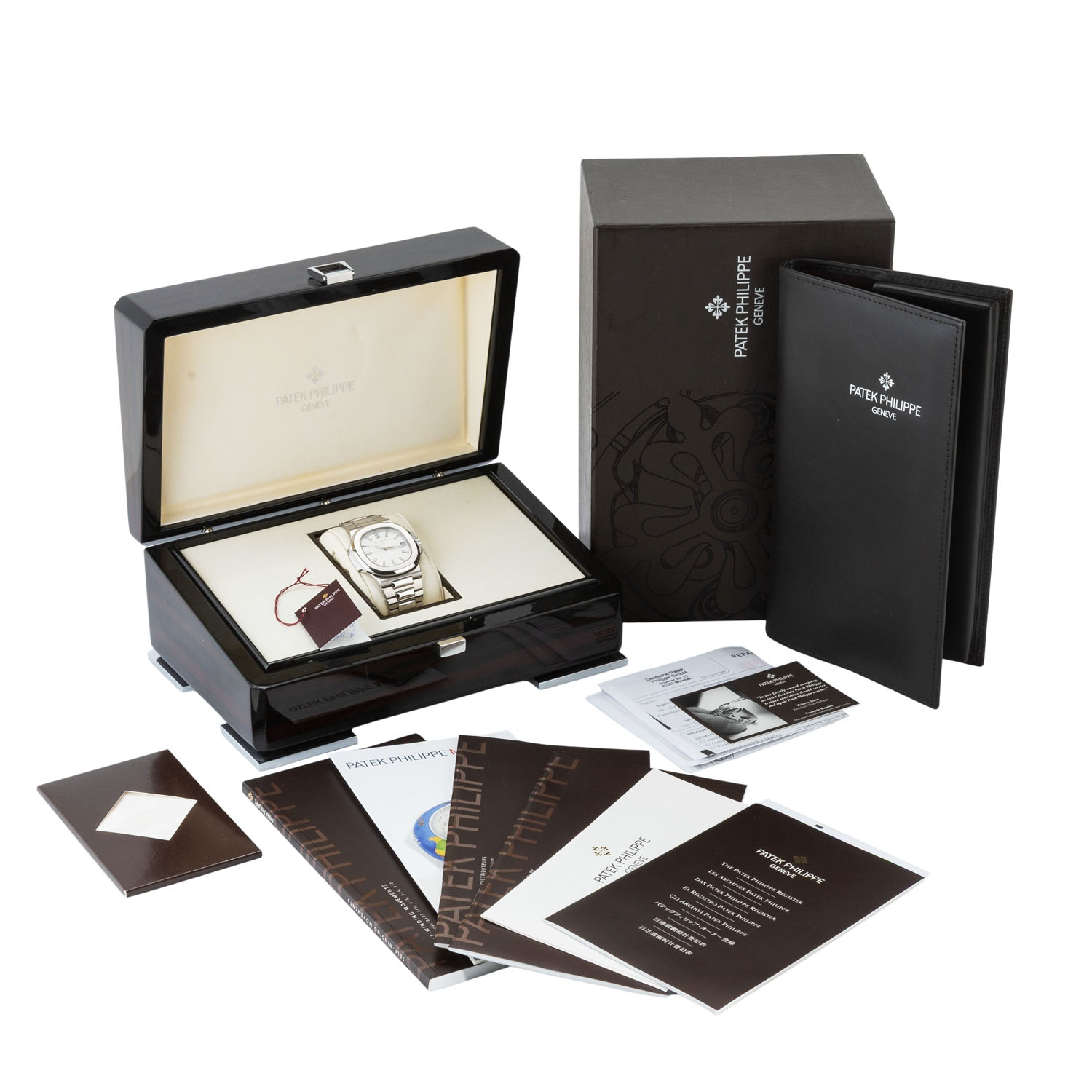 Edelstahl, Gehäuseboden mit Sichtfenster. Automatic-Werk Kaliber 324 S C, kompletter Service durch Patek Philippe 04/2022, sehr gute Gangwerte (+1s/Tag, 325° Amplitude). Silbernes Zifferblatt mit applizierten Stabindizes und Datumsanzeige, Stabzeiger. Originales Patek Philippe Gliederarmband mit Butterfly-Faltschließe in Edelstahl. Sehr guter Zustand, sichtbare Gebrauchsspuren an Band und Gehäuse, kleine Delle auf linker Gehäuseseite. Original Box, Garantiezertifikat, Service-Hang Tag, Ledermappe, Reinigungstuch und Anleitung anbei, Kauf 02/2013 bei Juwelier Kuhnle in Fürth. Durchmesser ca. 42mm gemessen ohne Krone, passend für ca. 19,5cm Handgelenksumfang.
