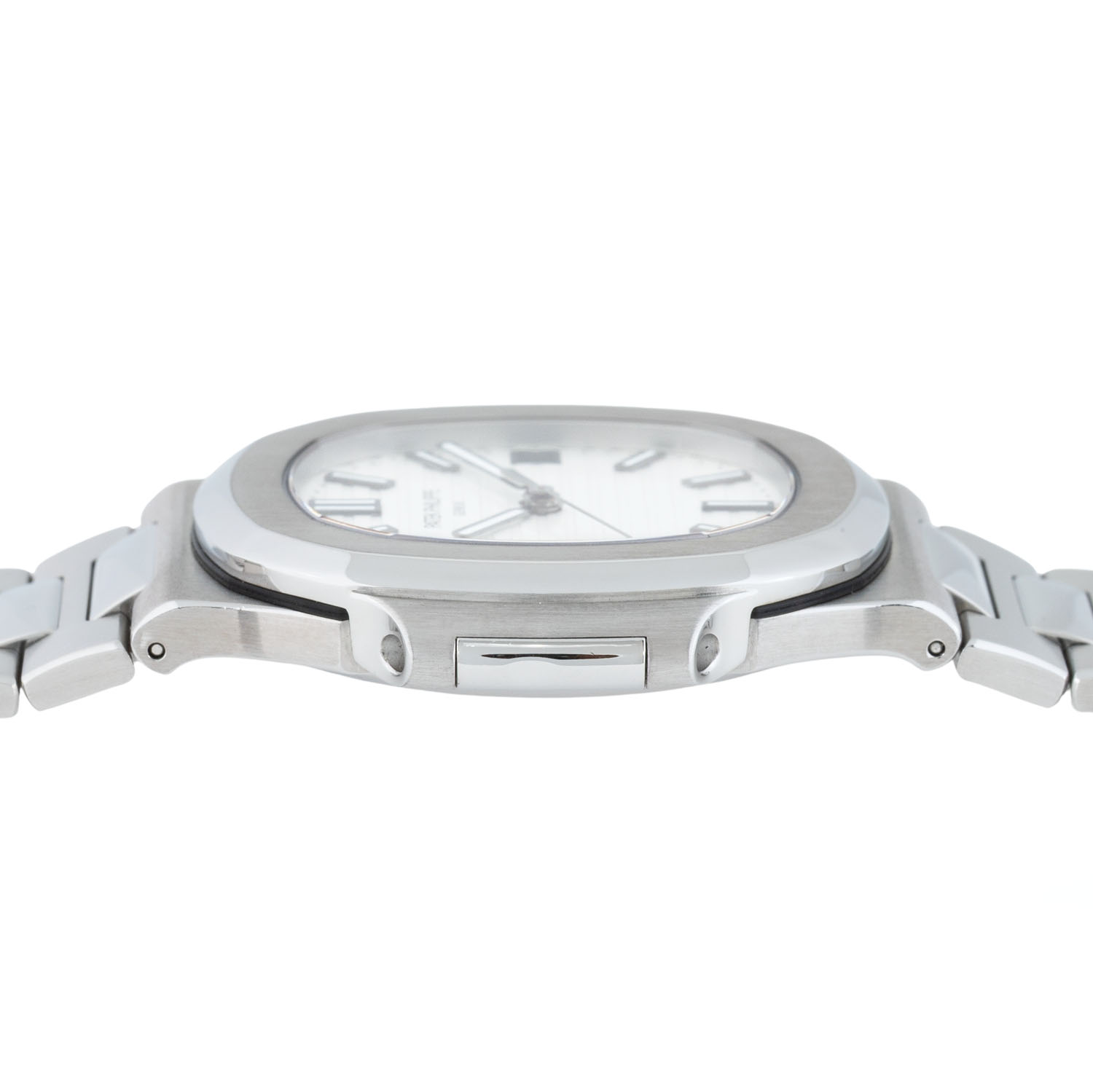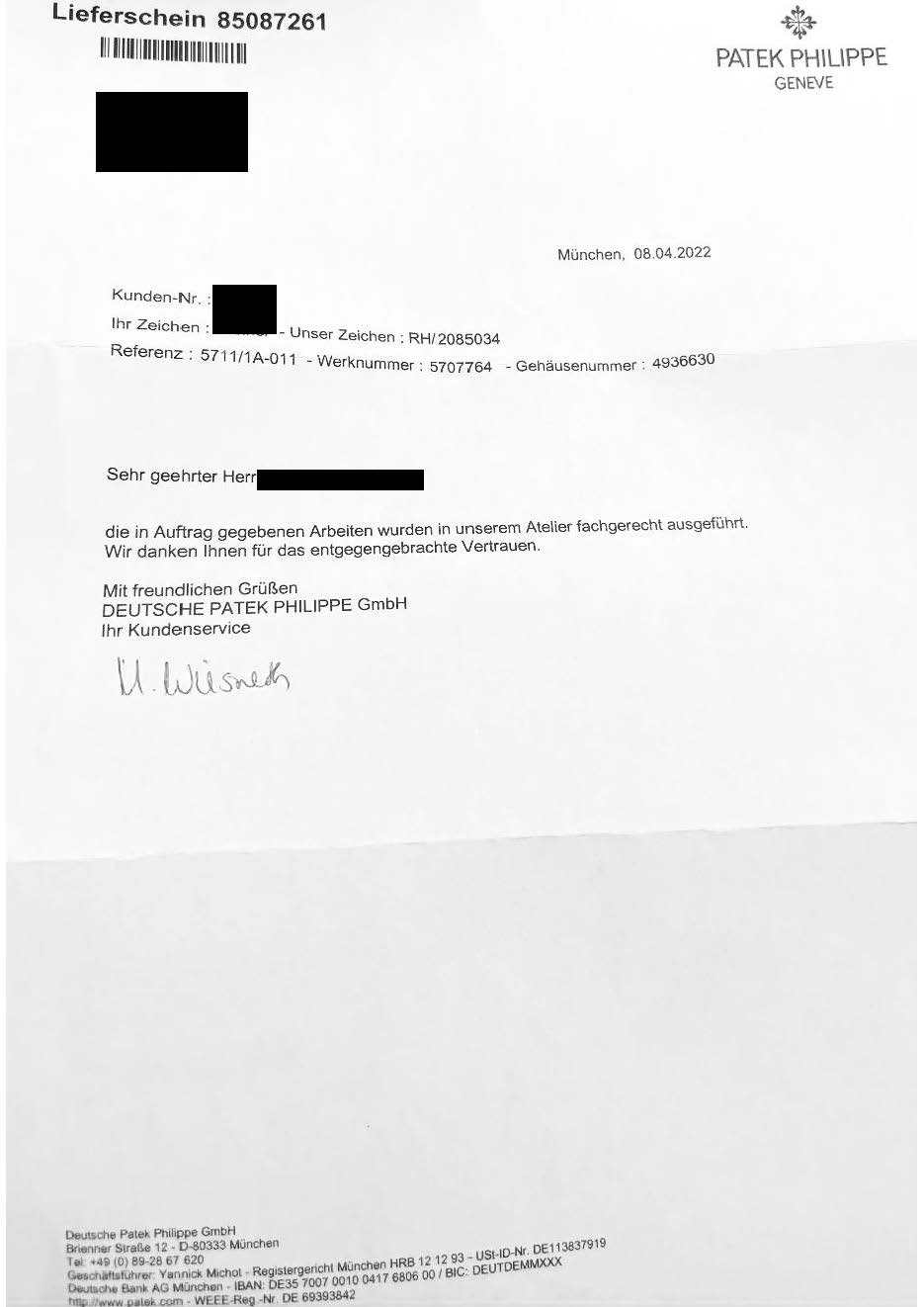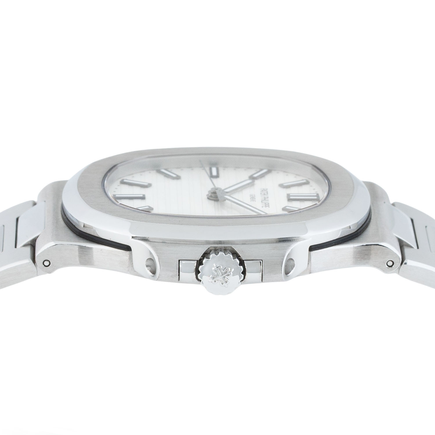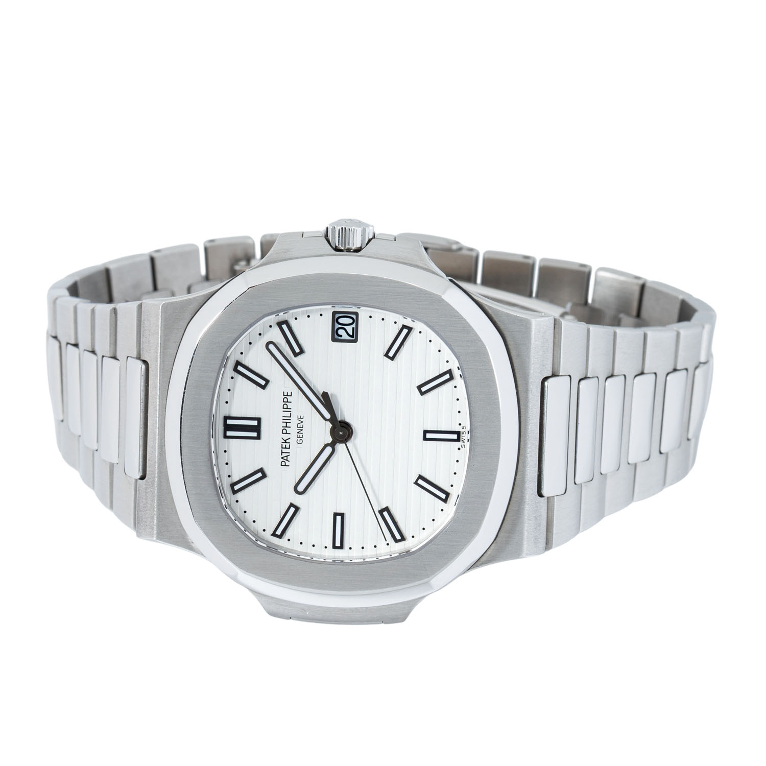 Edelstahl, Gehäuseboden mit Sichtfenster. Automatic-Werk Kaliber 324 S C, kompletter Service durch Patek Philippe 04/2022, sehr gute Gangwerte (+1s/Tag, 325° Amplitude). Silbernes Zifferblatt mit applizierten Stabindizes und Datumsanzeige, Stabzeiger. Originales Patek Philippe Gliederarmband mit Butterfly-Faltschließe in Edelstahl. Sehr guter Zustand, sichtbare Gebrauchsspuren an Band und Gehäuse, kleine Delle auf linker Gehäuseseite. Original Box, Garantiezertifikat, Service-Hang Tag, Ledermappe, Reinigungstuch und Anleitung anbei, Kauf 02/2013 bei Juwelier Kuhnle in Fürth. Durchmesser ca. 42mm gemessen ohne Krone, passend für ca. 19,5cm Handgelenksumfang.