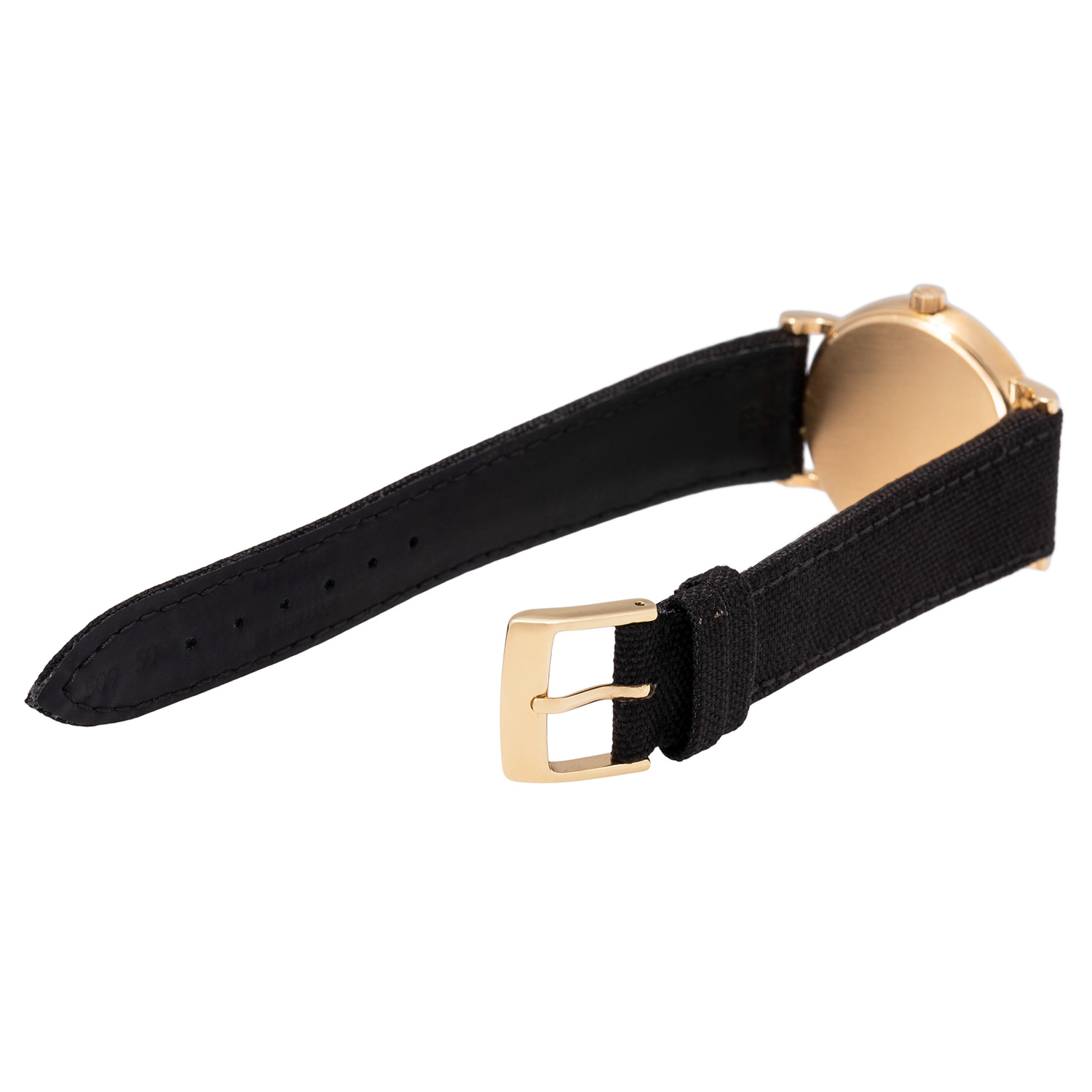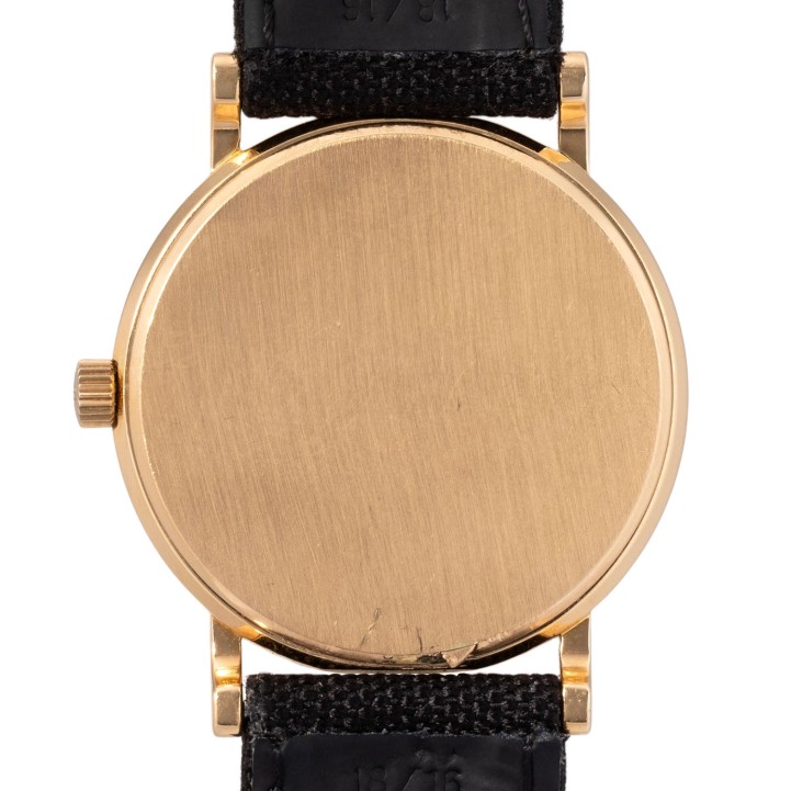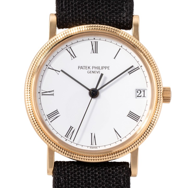 Gelbgold 18K, Lünette mit Clous de Paris Muster. Automatic-Werk Kal. 310SC mit sehr guten Gangwerten (+2 s/Tag. 273° Amplitude), komplette Revision 05/2025. Weißes Porzellan Zifferblatt mit römischen Ziffern und Datumsanzeige, Stabzeiger. Neues Textil/Lederband mit vergoldeter Dornschließe in Edelstahl. Guter Zustand mit sichtbaren Tragespuren am Gehäuse, Lasche zum Öffnen des Gehäusedeckels ist teilweise abgebrochen. Patek Philippe Service Box, Garantiezertifikat und Revisionskarte 05/2025 anbei, Kauf 04/1990 bei Juwelier Wempe in Hamburg. Durchmesser ca. 33mm gemessen ohne Krone.