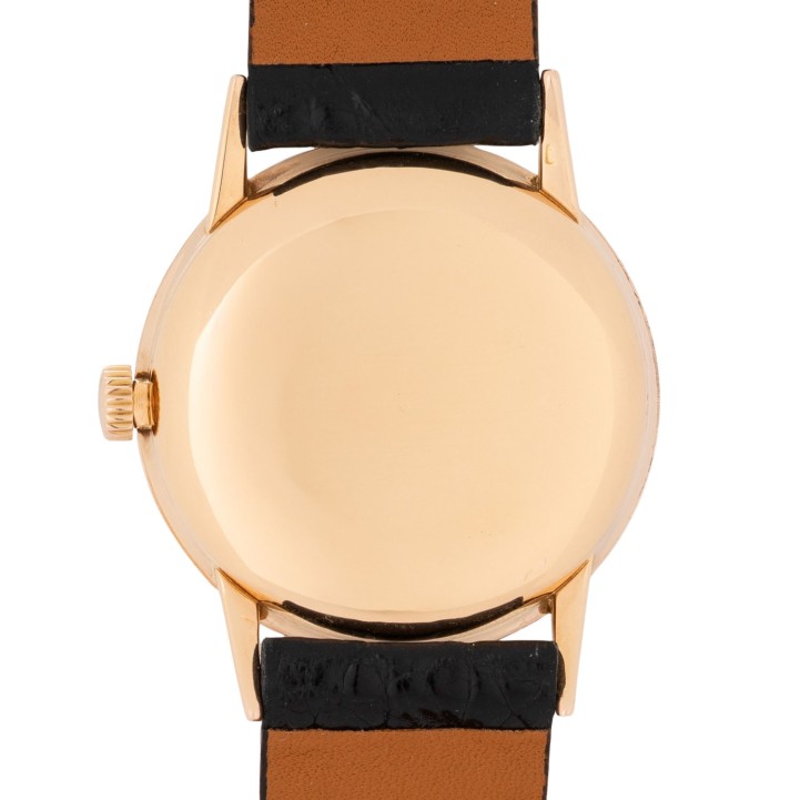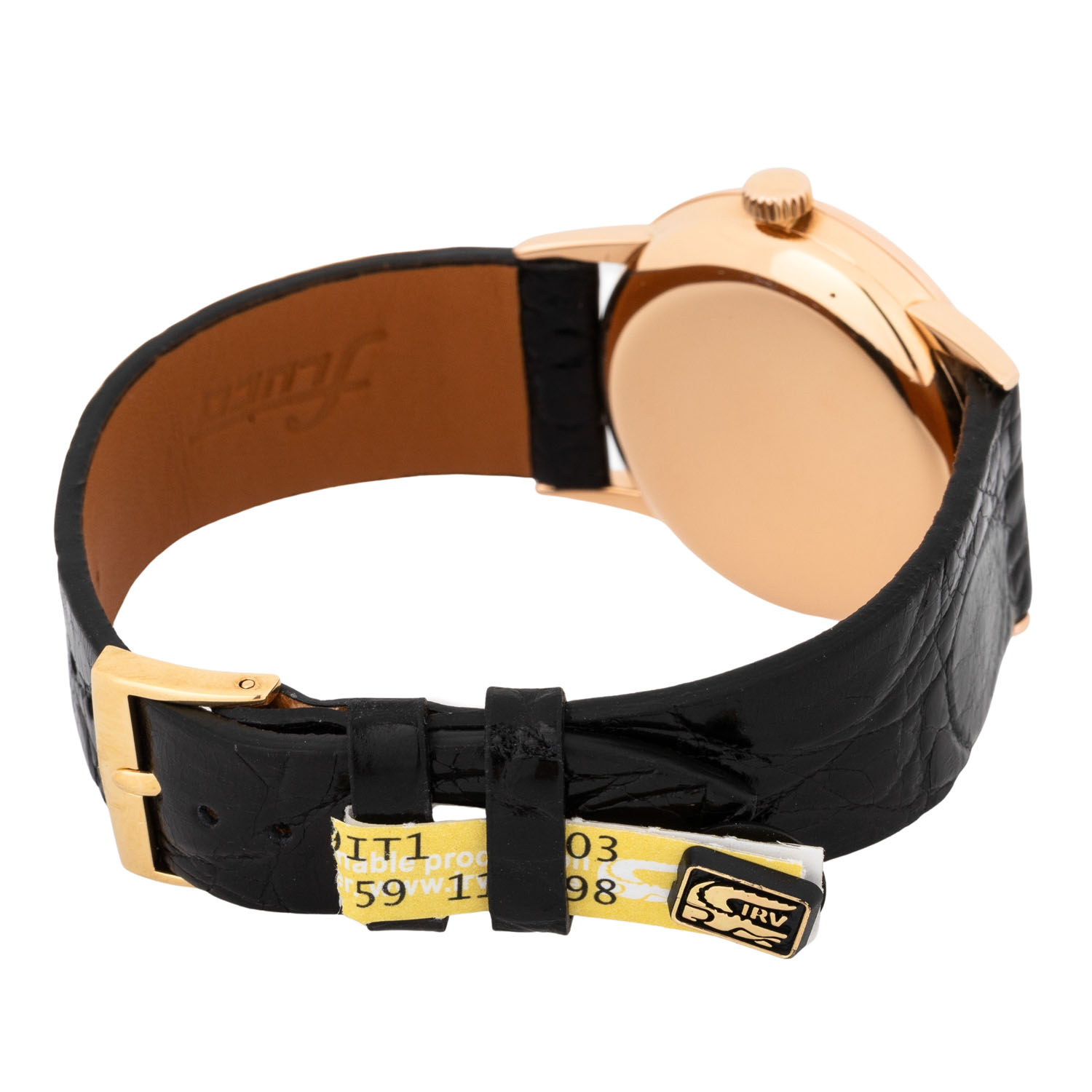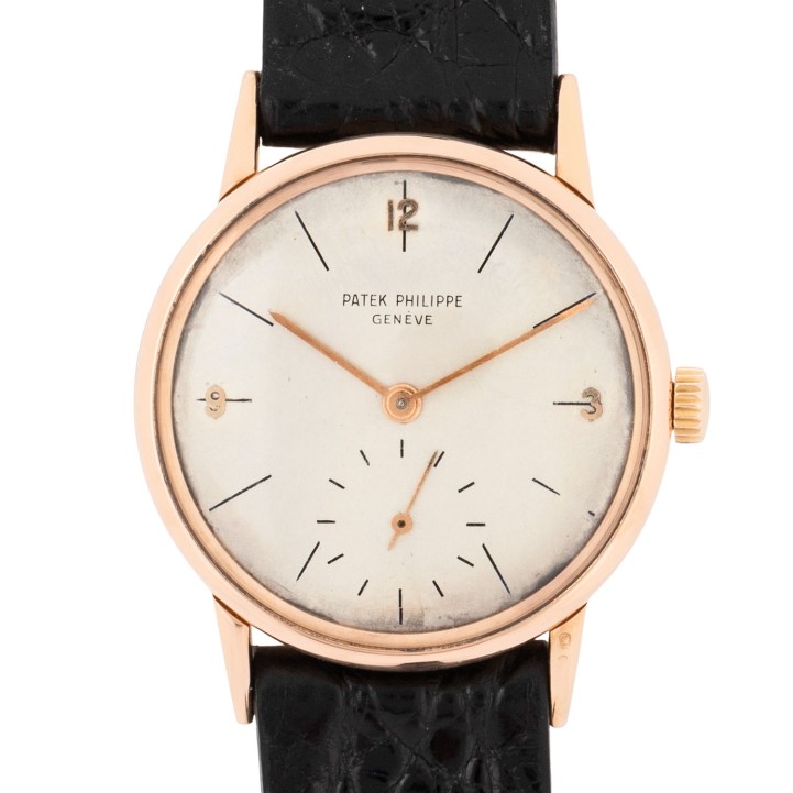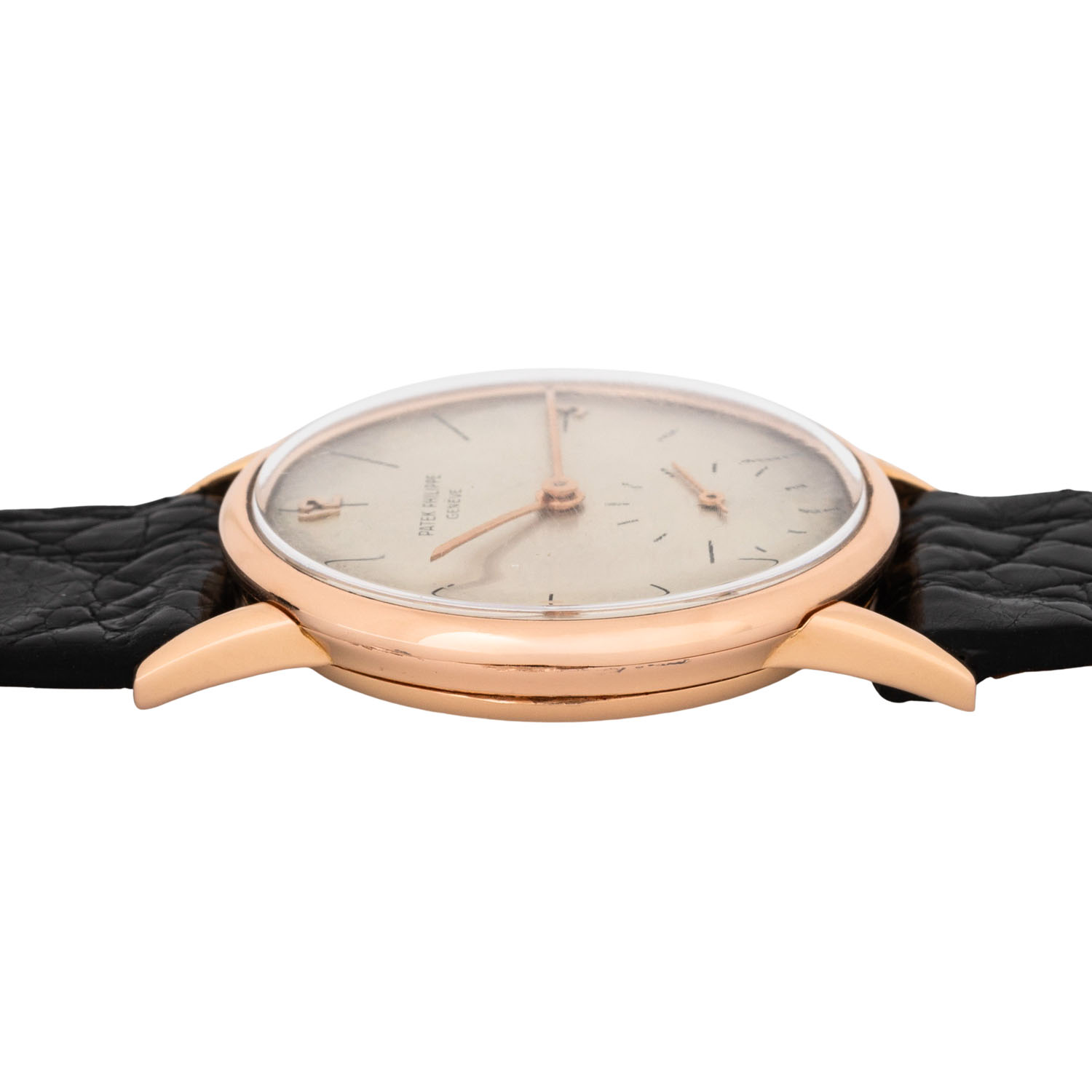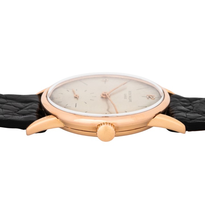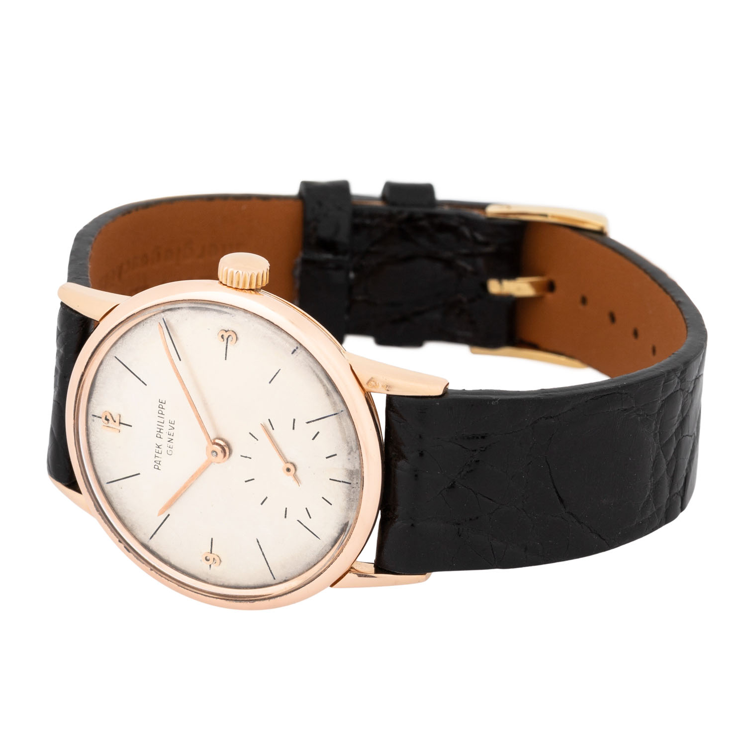 Roségold 18K, Gehäusenummer 513404. Handaufzug-Werk Kal. 12-120, sehr gute Gangwerte (+5s/Tag, 310° Amplitude), Werknummer 938626. Originales silbernes Zifferblatt mit applizierten goldenen arabischen Ziffern und Strichindizes, kleine Sekunde, goldene Stabzeiger. Neues Kroko-Lederband mit Patek Philippe Stiftschließe in Gelbgold 18K. Guter Zustand, sichtbare Gebrauchsspuren an Gehäuse und Schließe, Zifferblatt mit Verfärbungen und kleinen Kratzern im Bereich der Zifferblattmitte und kleinen Sekunde. Durchmesser ca. 33 mm gemessen ohne Krone.