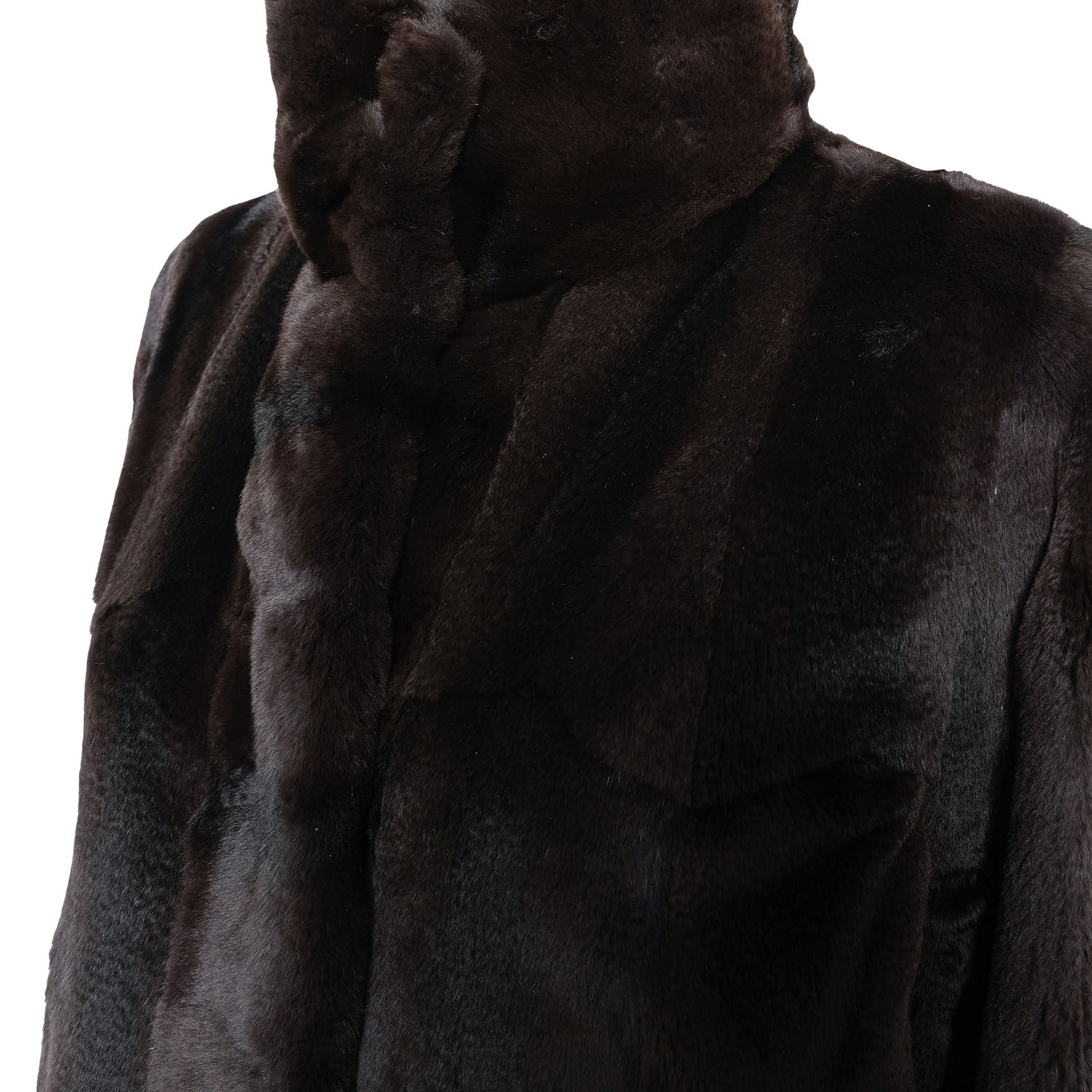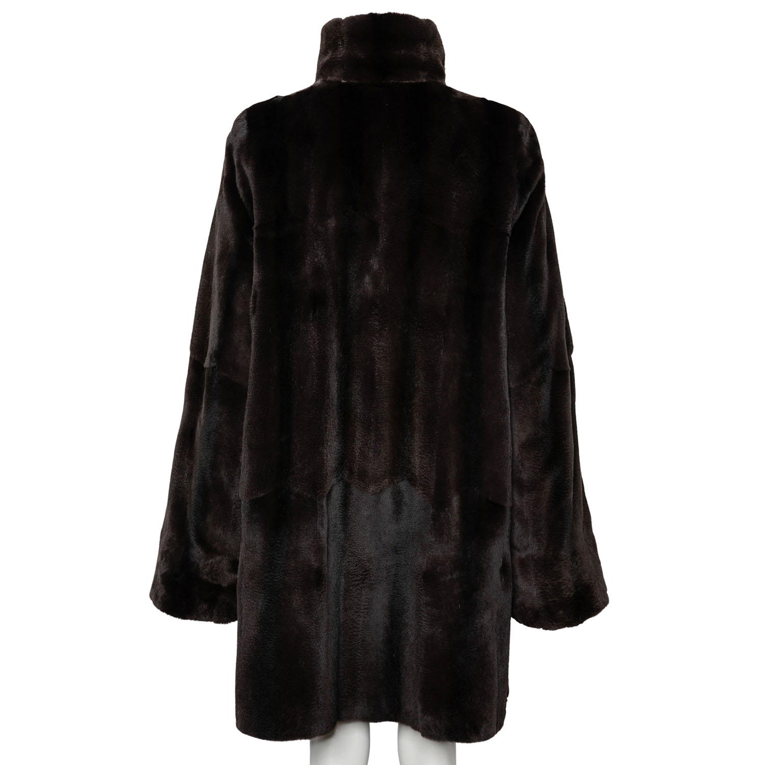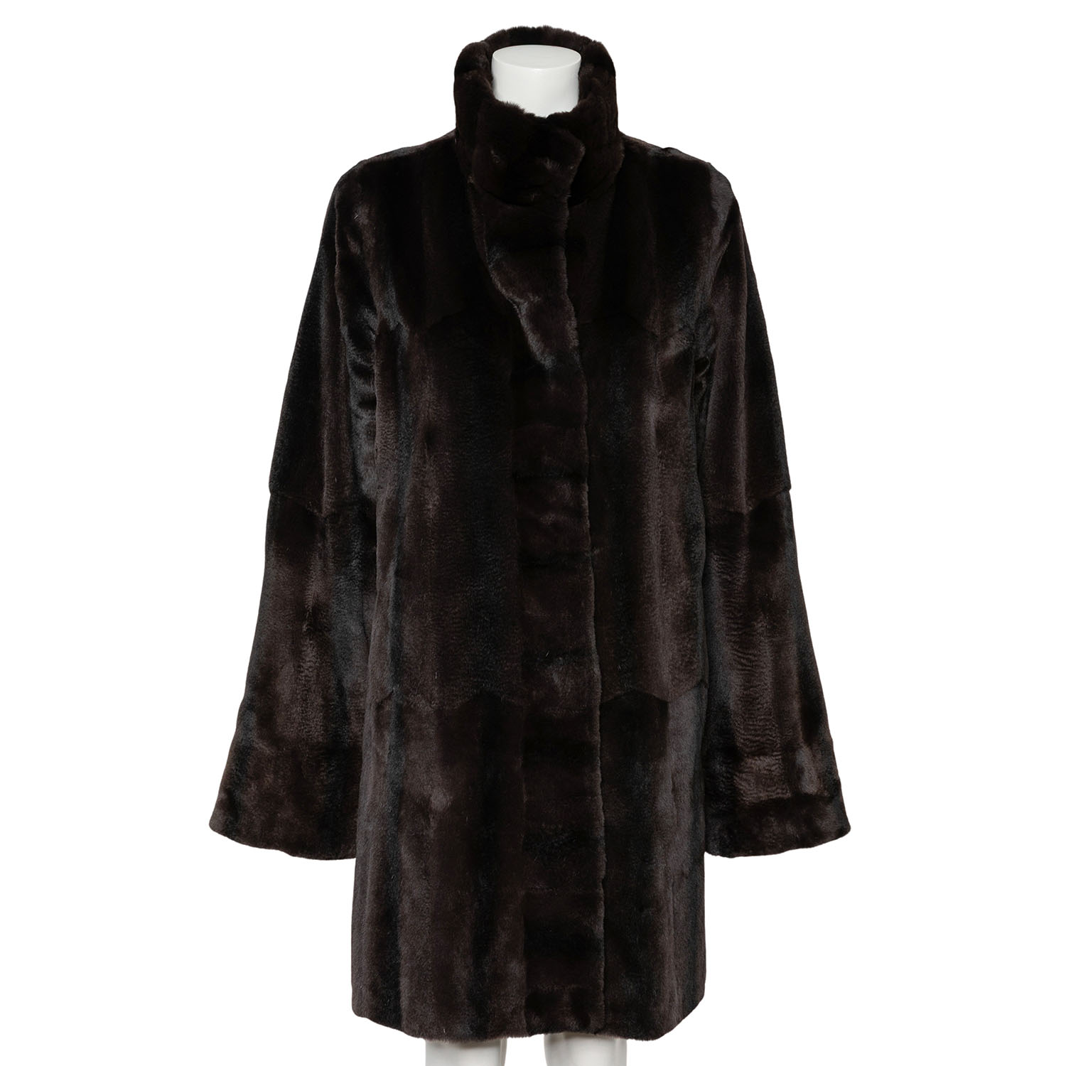 Wendbares Modell. Geschorene Felle in Schwarz mit Stehkragen, magnetischem Verschluss, seitlichen Schlitzen und zwei Eingrifftaschen. Innenfutter in Schwarz. Sehr guter Erhalt.