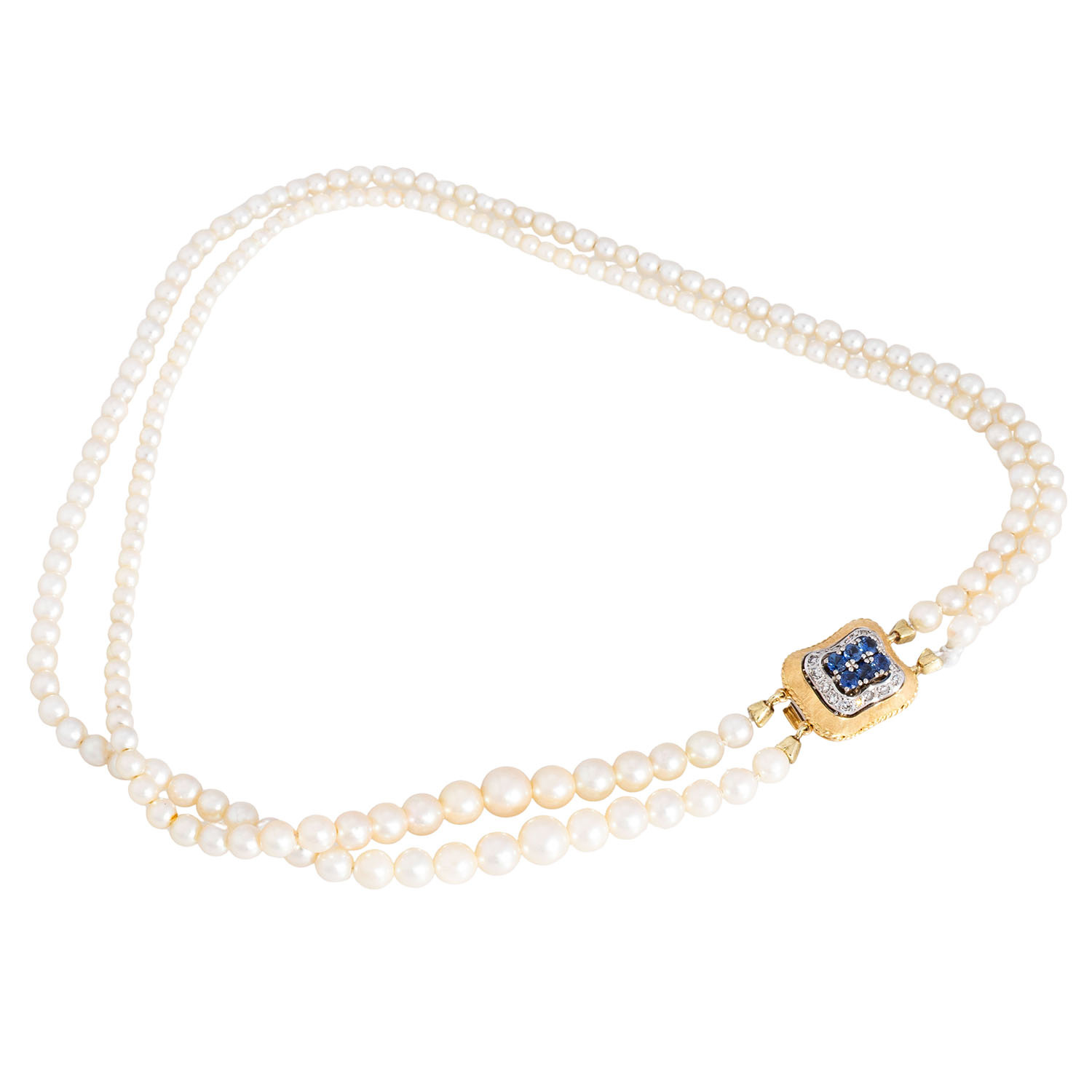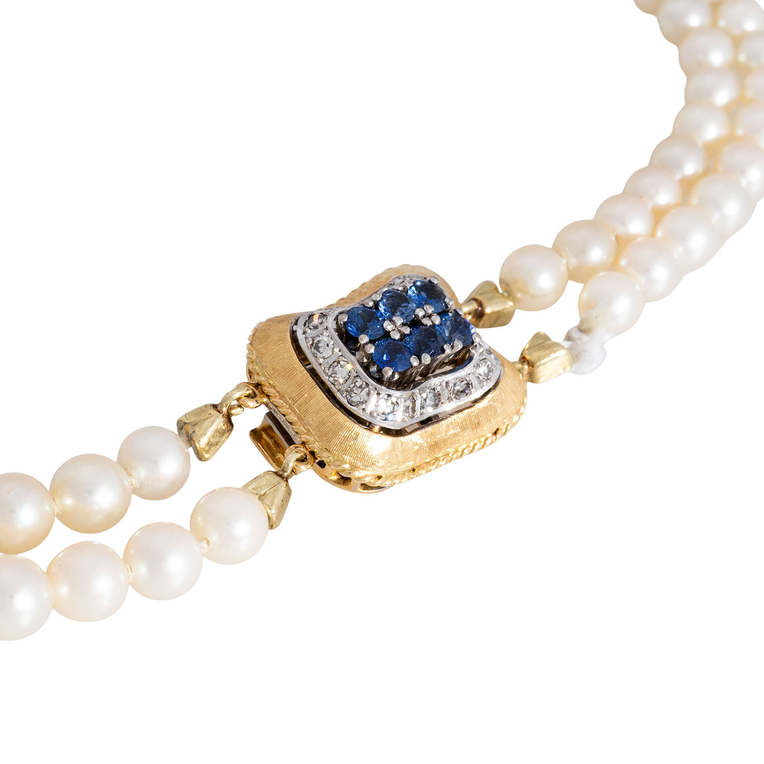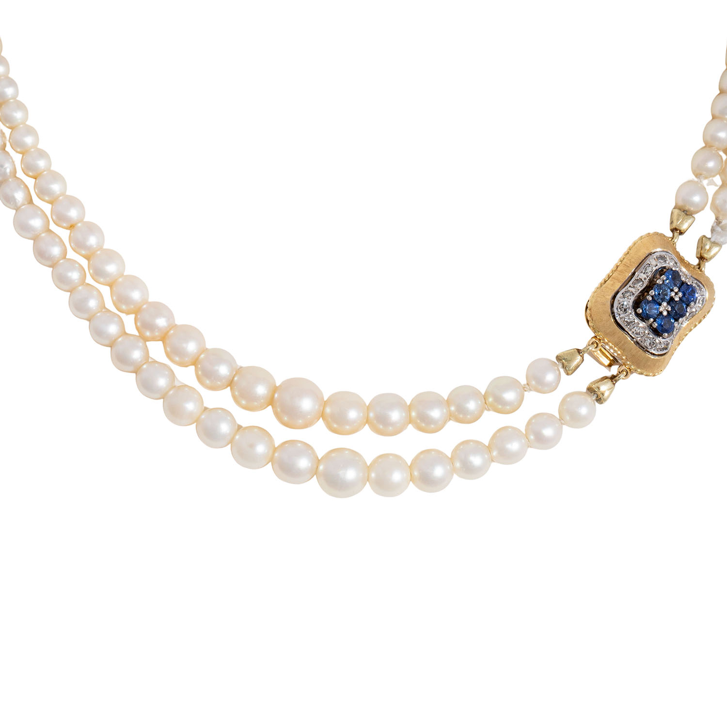 champagnerfarbene Zuchtperlen von 2,9 -7,5 mm, Schließe besetzt mit 6 Saphiren umgeben von 16 Diamanten im Achtkantschliff von zus. ca. 0,24ct von guter Farbe und Reinheit, GG/WG 18K, 30 g, L: ca. 40cm, 20. Jh., minimale Tragespuren. Handgefertigt.