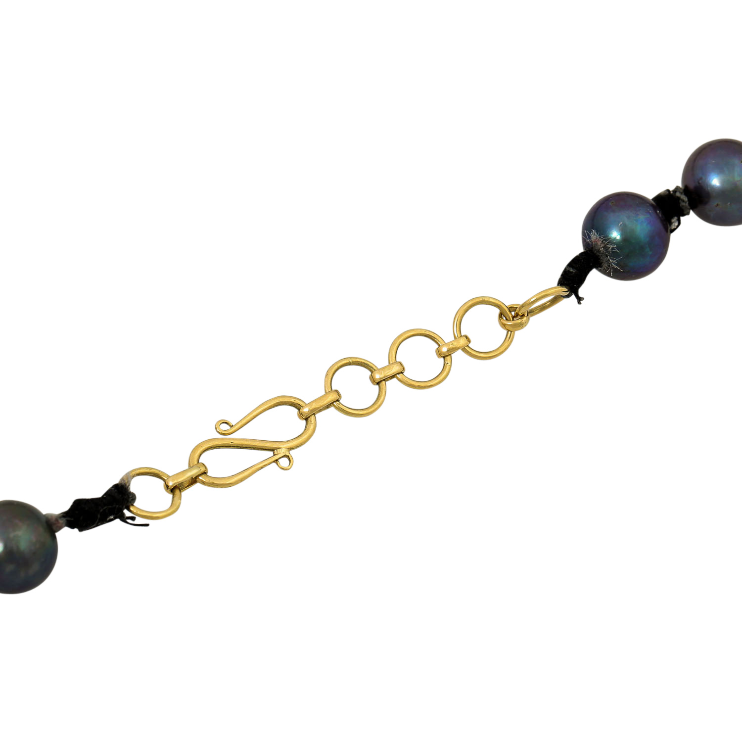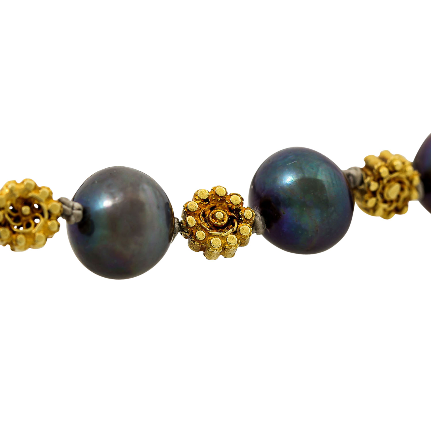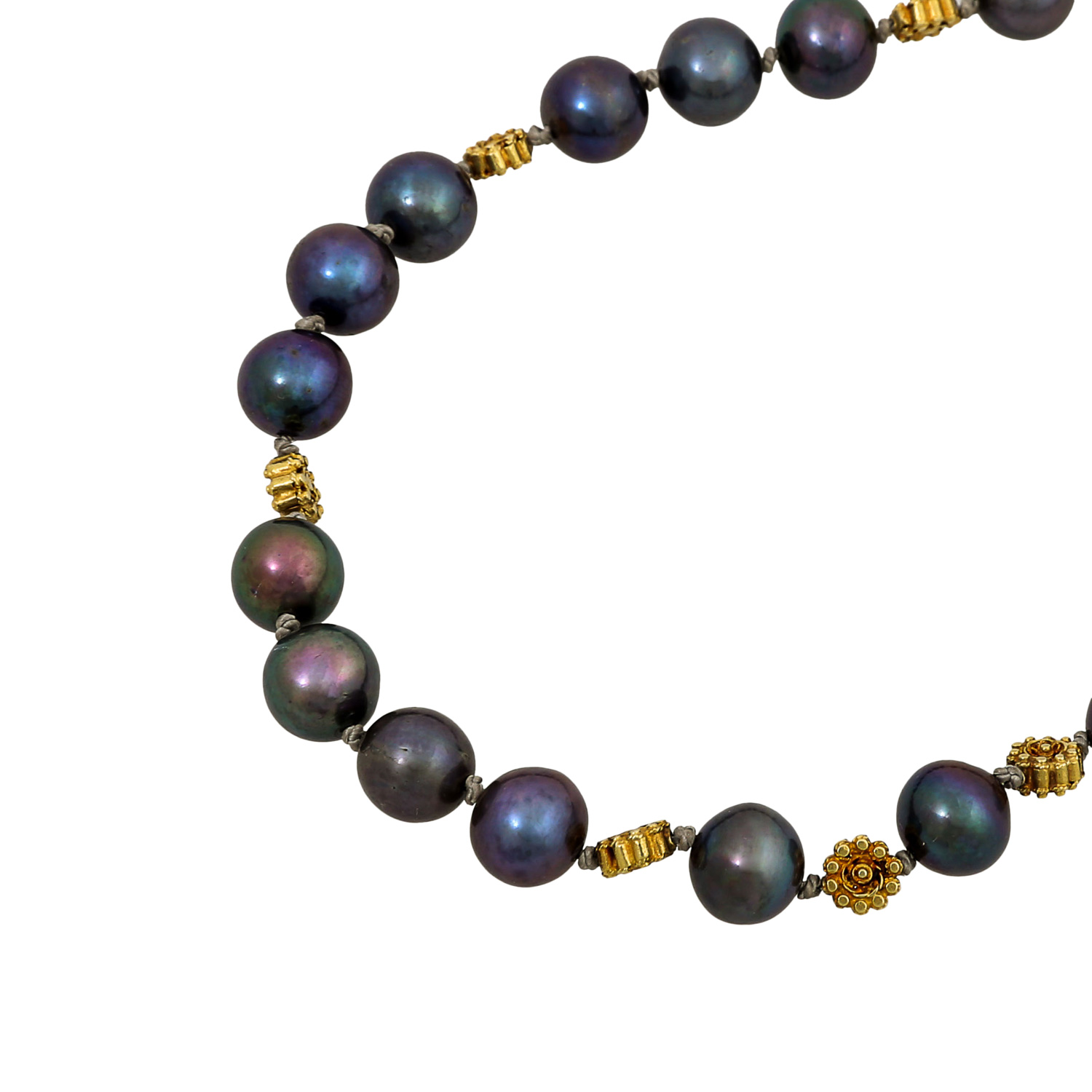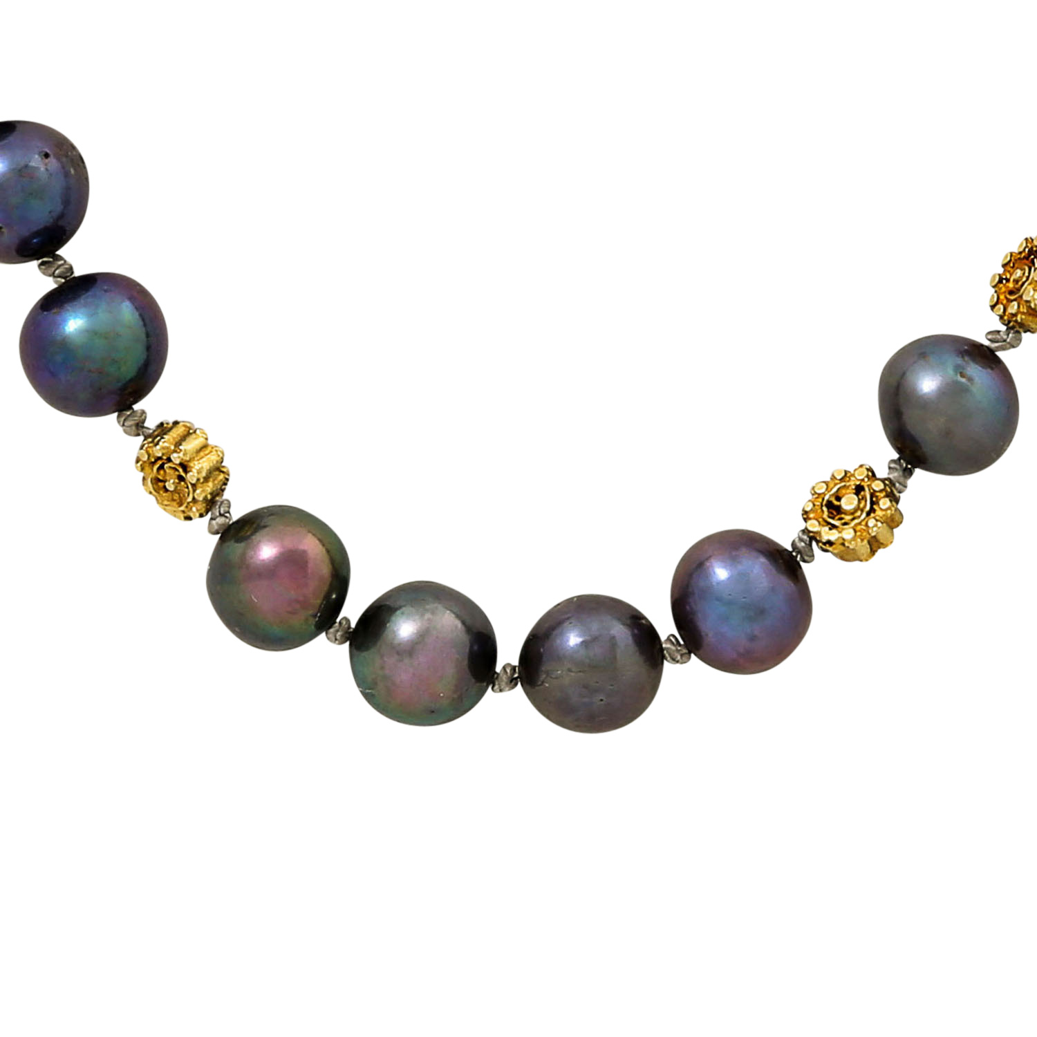 blütenförmig-filigran, Südamerika prä-spanisch, GG 14K, kombiniert mit gefärbten Zuchtperlen, 59 g, L. 67-70 cm, neuzeitliche S-Schließe, Tragespuren.