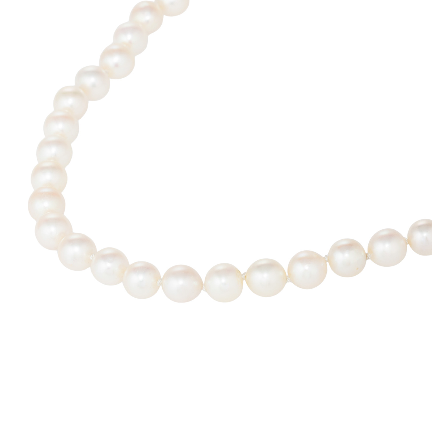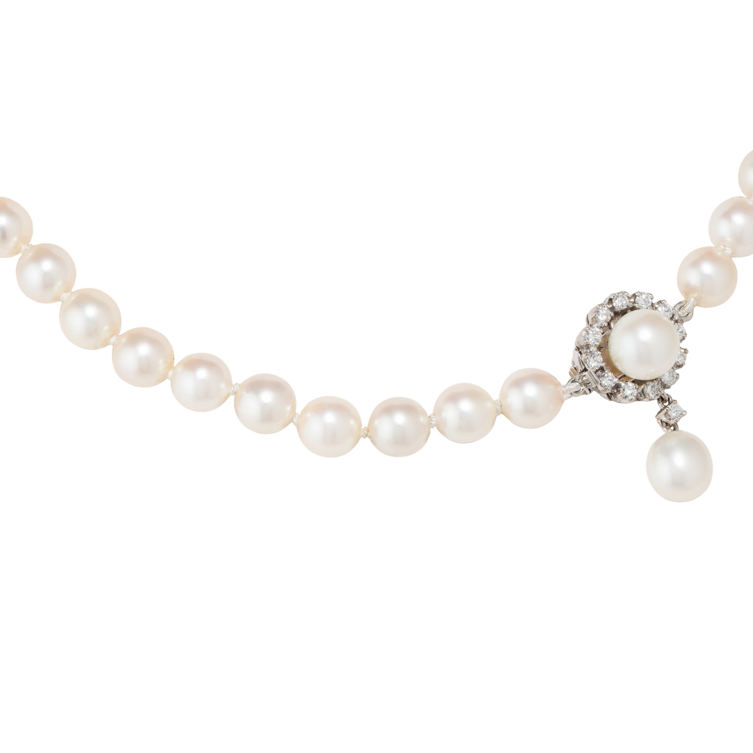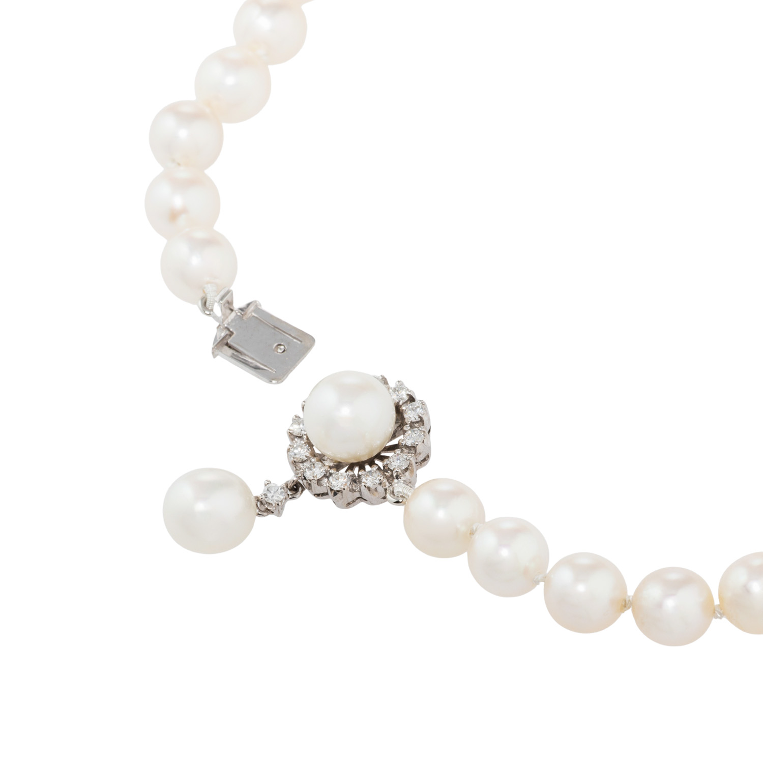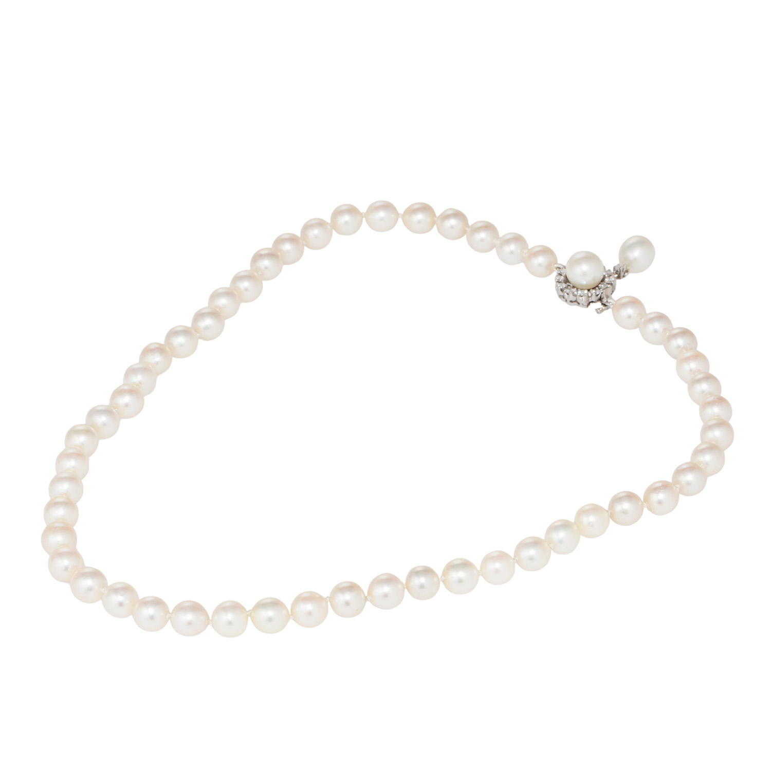 Zuchtperlen: weiß, D: ca. 6,9 - 7,2 mm, schöner Lüster, mit natürlichen WMM, Verschluss mit 2 Akoyazuchtperlen, entouriert von 12 Brillanten und 1 Achtkantdiamant, zus. ca. 0,38 ct, WEISS (H)/SI, 2 Steine best., WG 18K, 31 g, L: ca. 41,5 cm, B: ca. 6,9 - 24,5 mm, 20./21. Jh., leichte Tragespuren, mit Herstellerpunze.