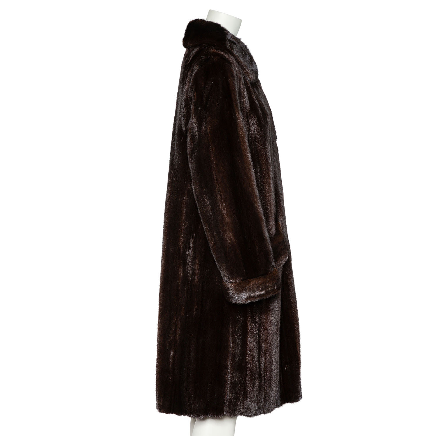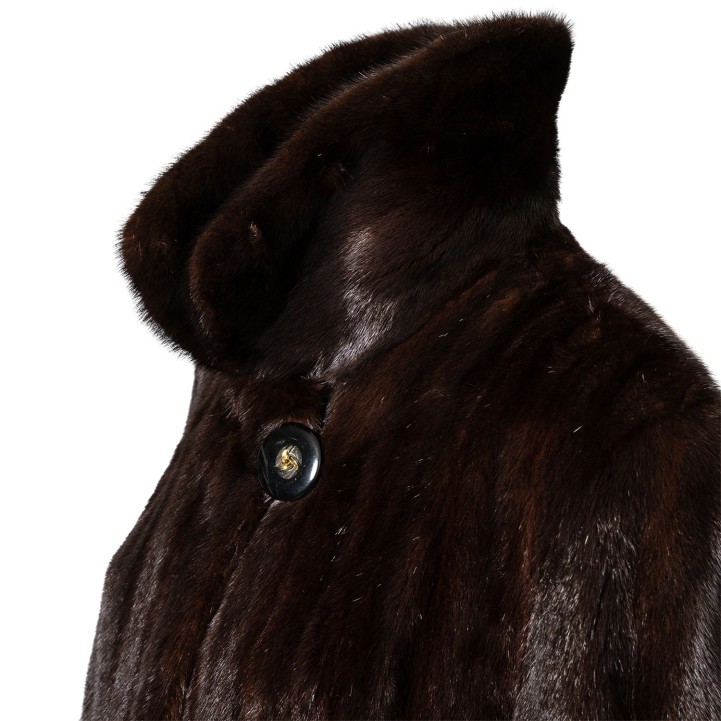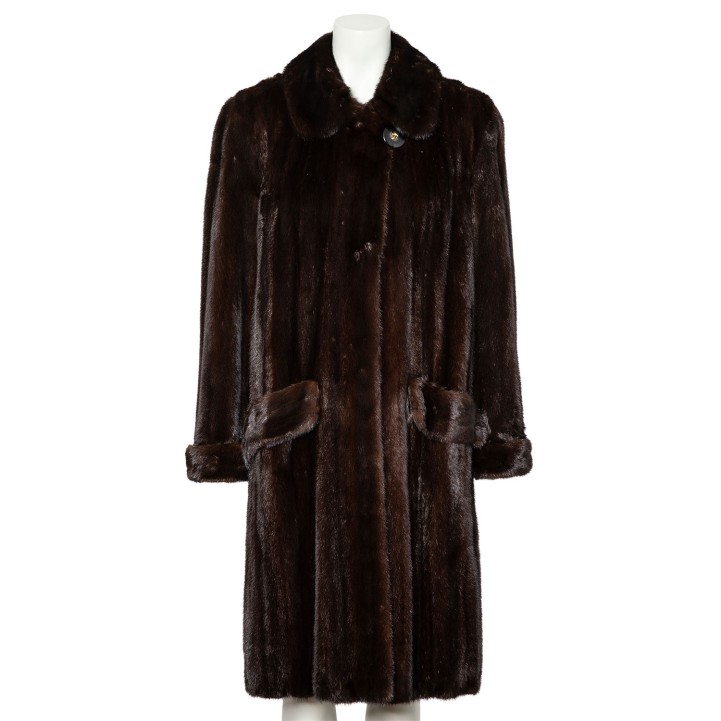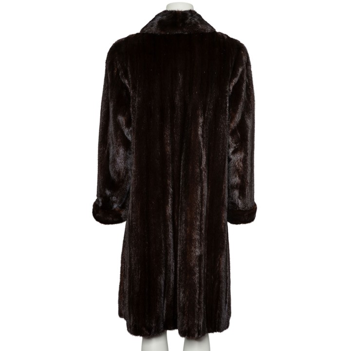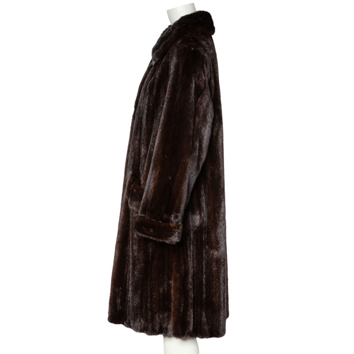 Hochwertige Nerzfelle in Dunkelbraun. Langes Modell mit Kragen, seitlichen Eingrifftaschen, Hakenverschluss und kurzen Schlitzen am Saum. Guter Erhalt.