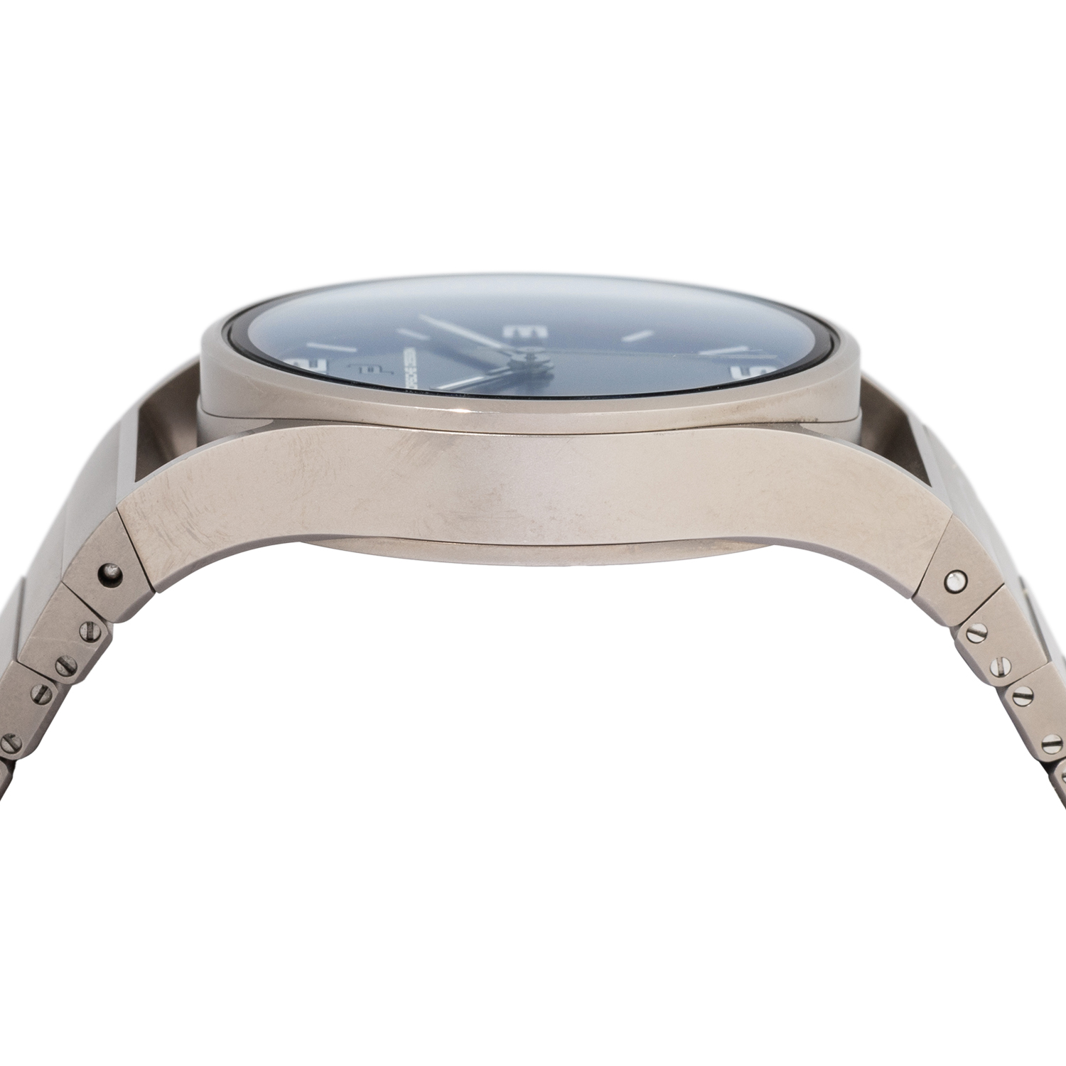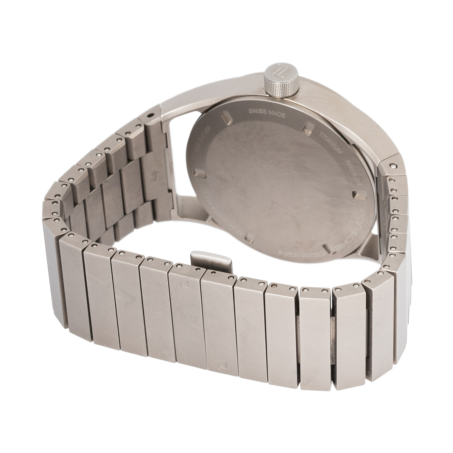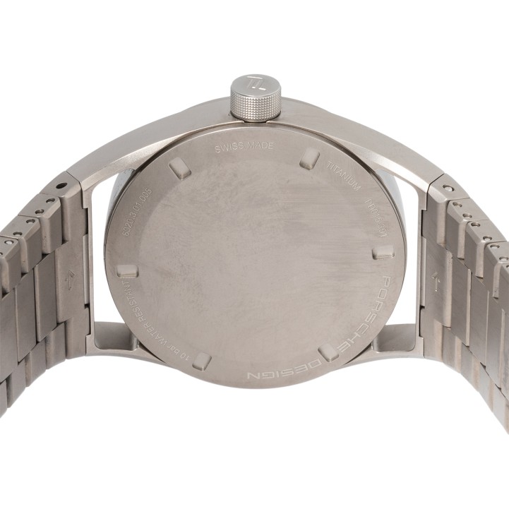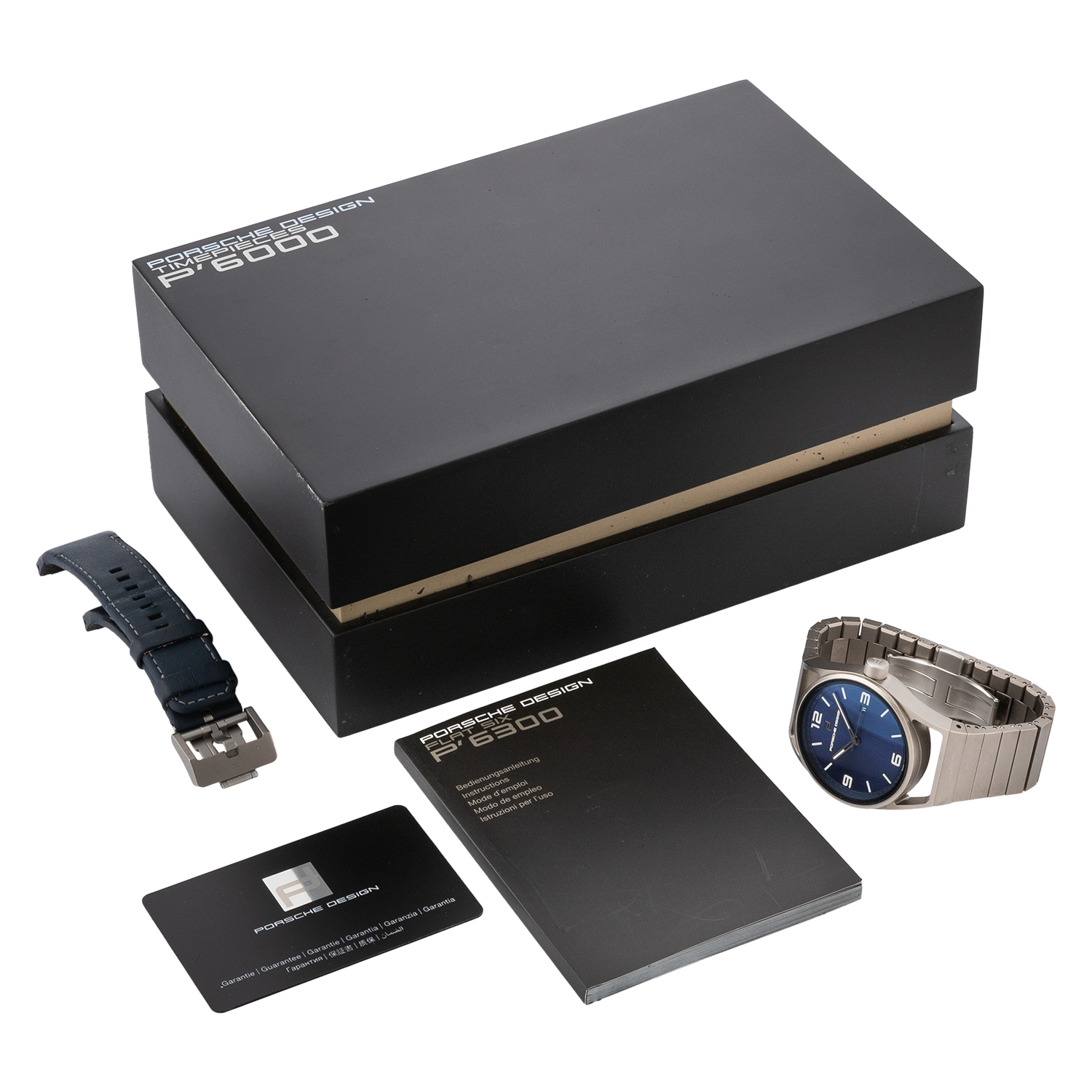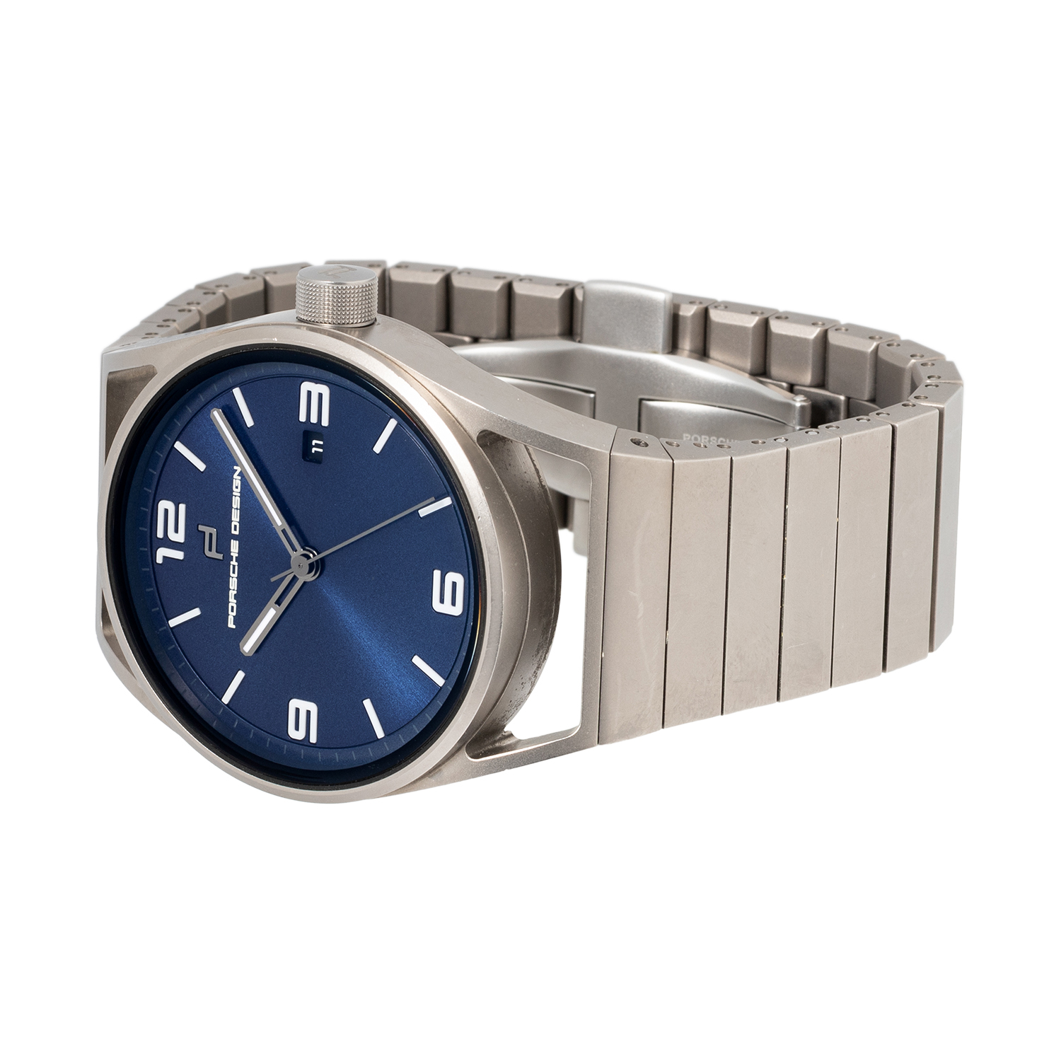 Titangehäuse. Automatikwerk Sellita Kal. SW200 mit sehr guten Gangwerten (+3 s/d, 290° Amplitude). Dunkleblaues ('Eternity Blue') Zifferblatt mit Sonnenschliff, arabischen Ziffern und Strichindizes, Datumsanzeige bei 3 Uhr. Titan-Gliederarmband mit Butterflyschließe. Gebraucht mit sichtbaren Tragespuren. Box und Papiere vom 18.01.2019 sowei dunkelblaues Original Porsche Design Ersatz-Lederband mit Titan Dornschließe anbei. Durchmesser ca. 42 mm gemessen ohne Krone. Passend bis zu einem Handgelenksumfang von ca. 18 cm.