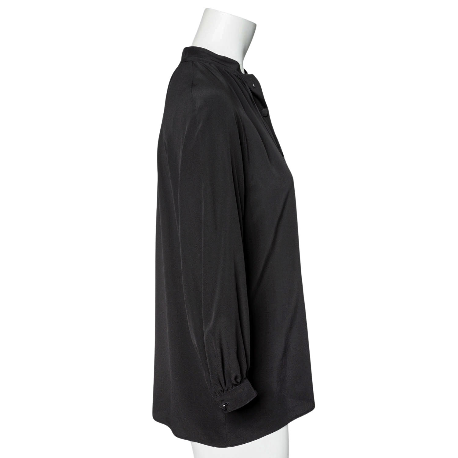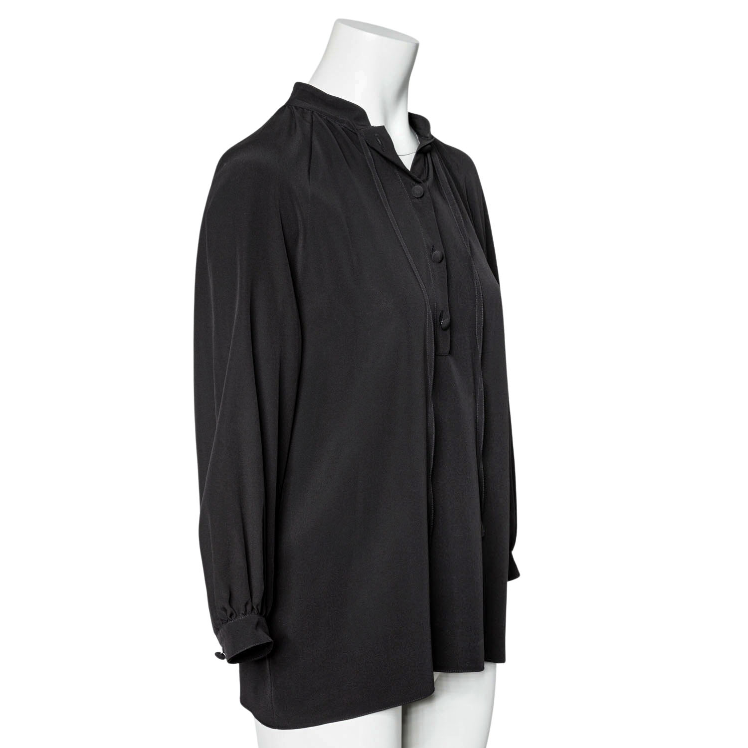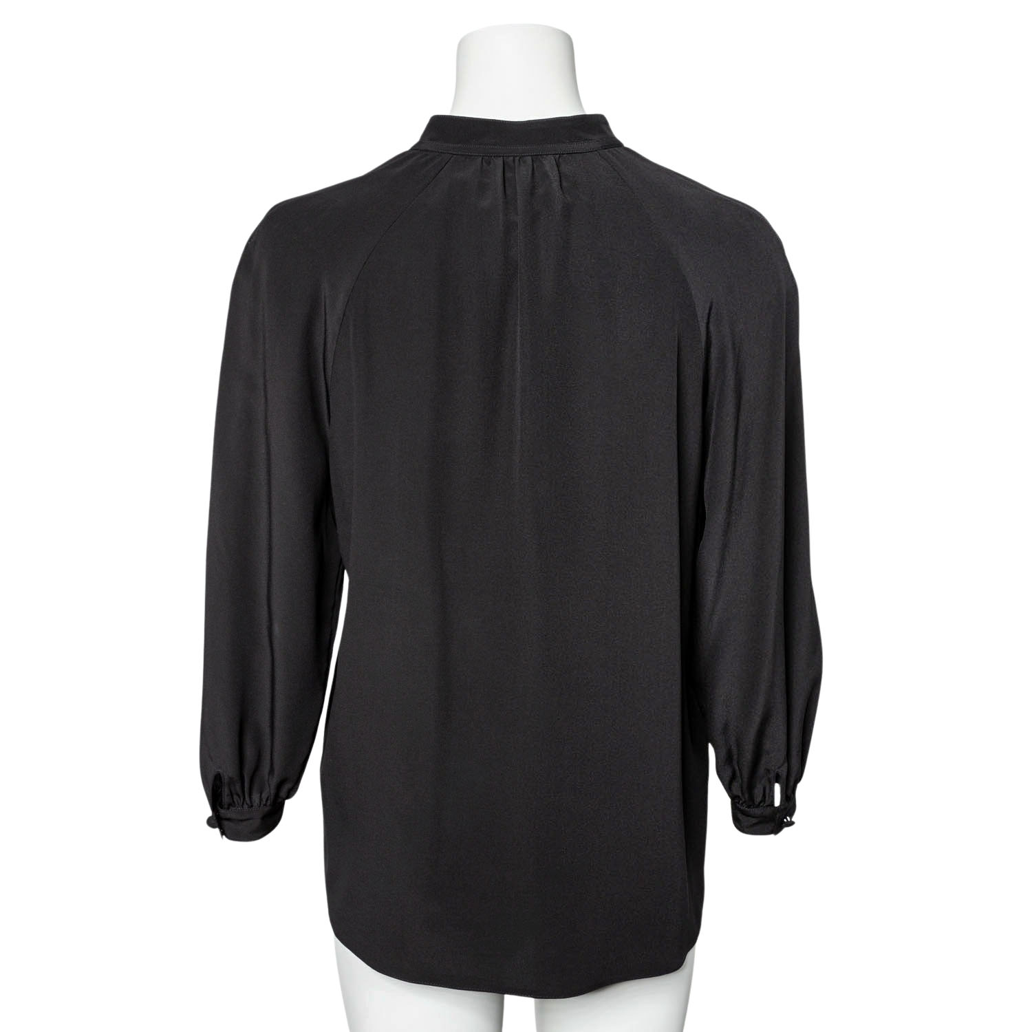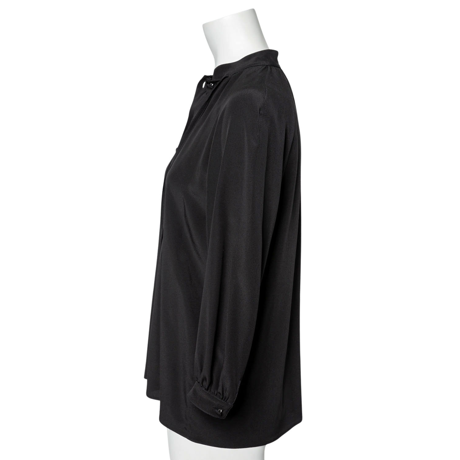 100% Seide in Schwarz. Kragenlos, kurze Knopfleiste, dekorative Kräuselungen. Leichte Tragespuren am Kragen, sonst guter Erhalt.
