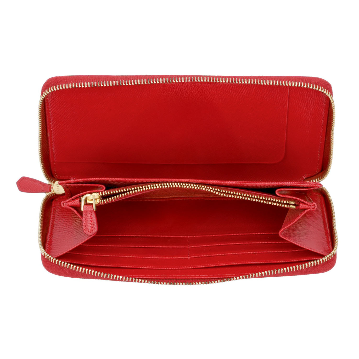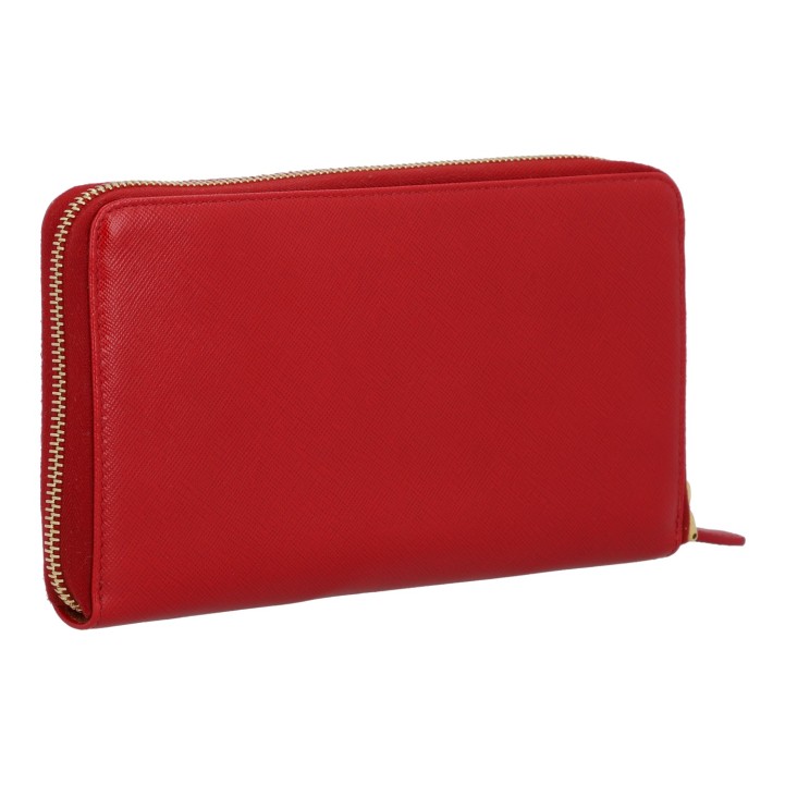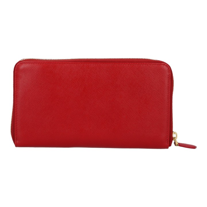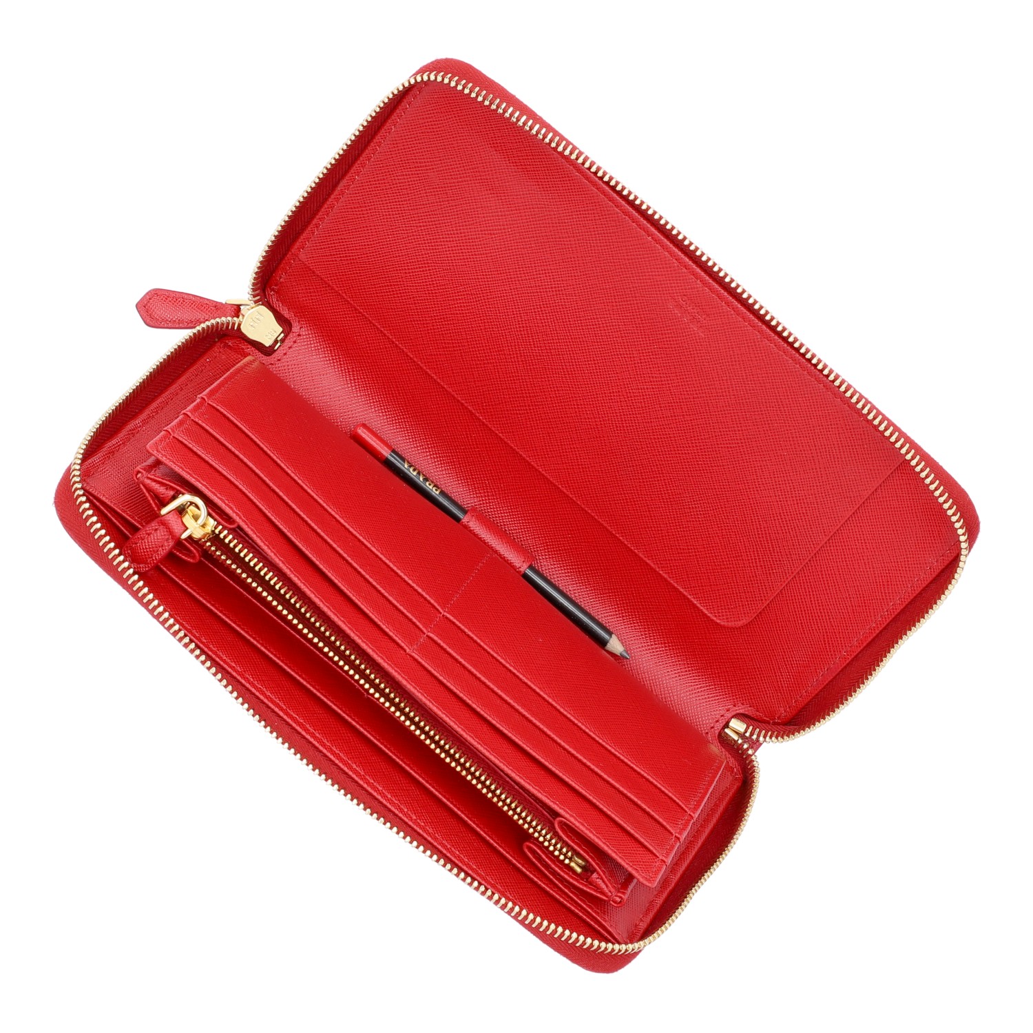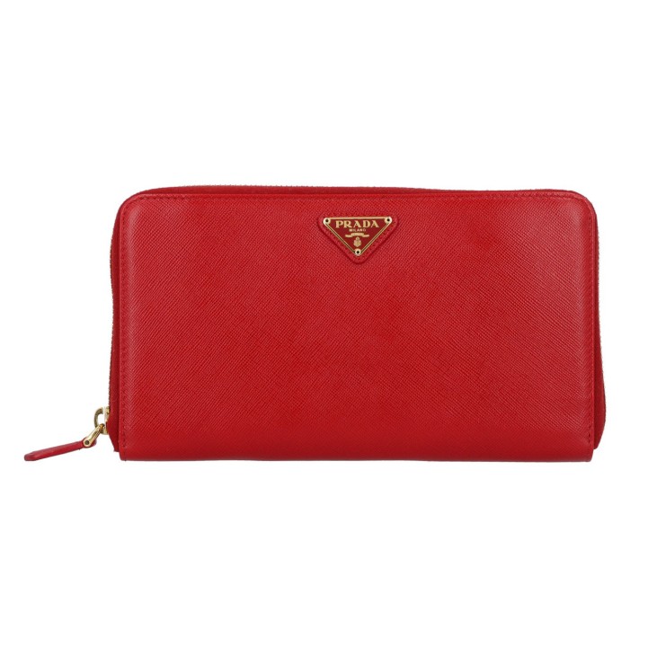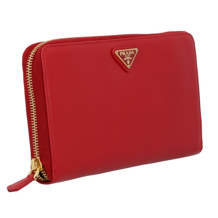 Rotes Saffiano-Leder mit goldfarbener Hardware und umlaufendem Reißverschluss. Innenraum mit vier großen Fächern, sechs Kartenfächern, Reißverschlussfach und Stifthalterung. Minimale Gebrauchsspuren vorhanden. 21 x 2,5 x 12 cm.