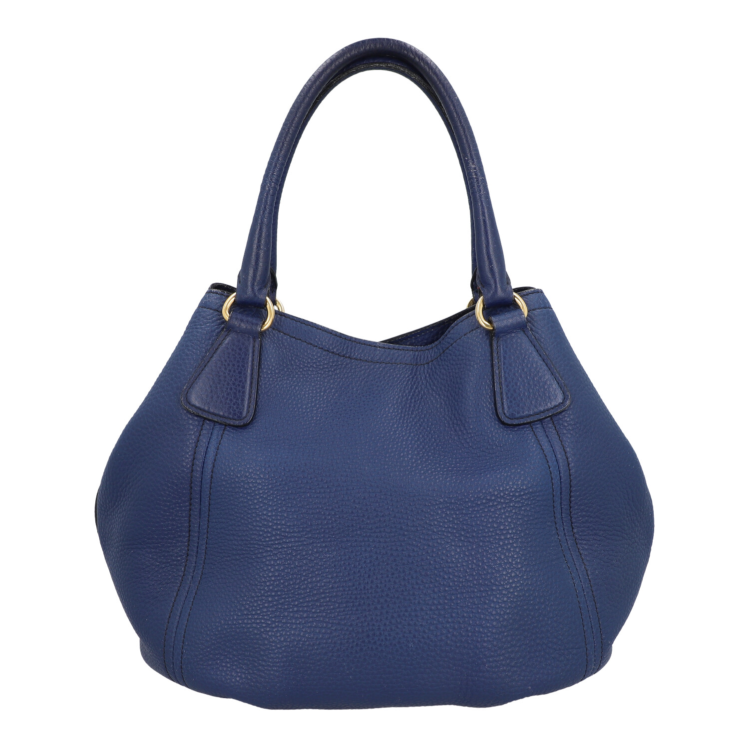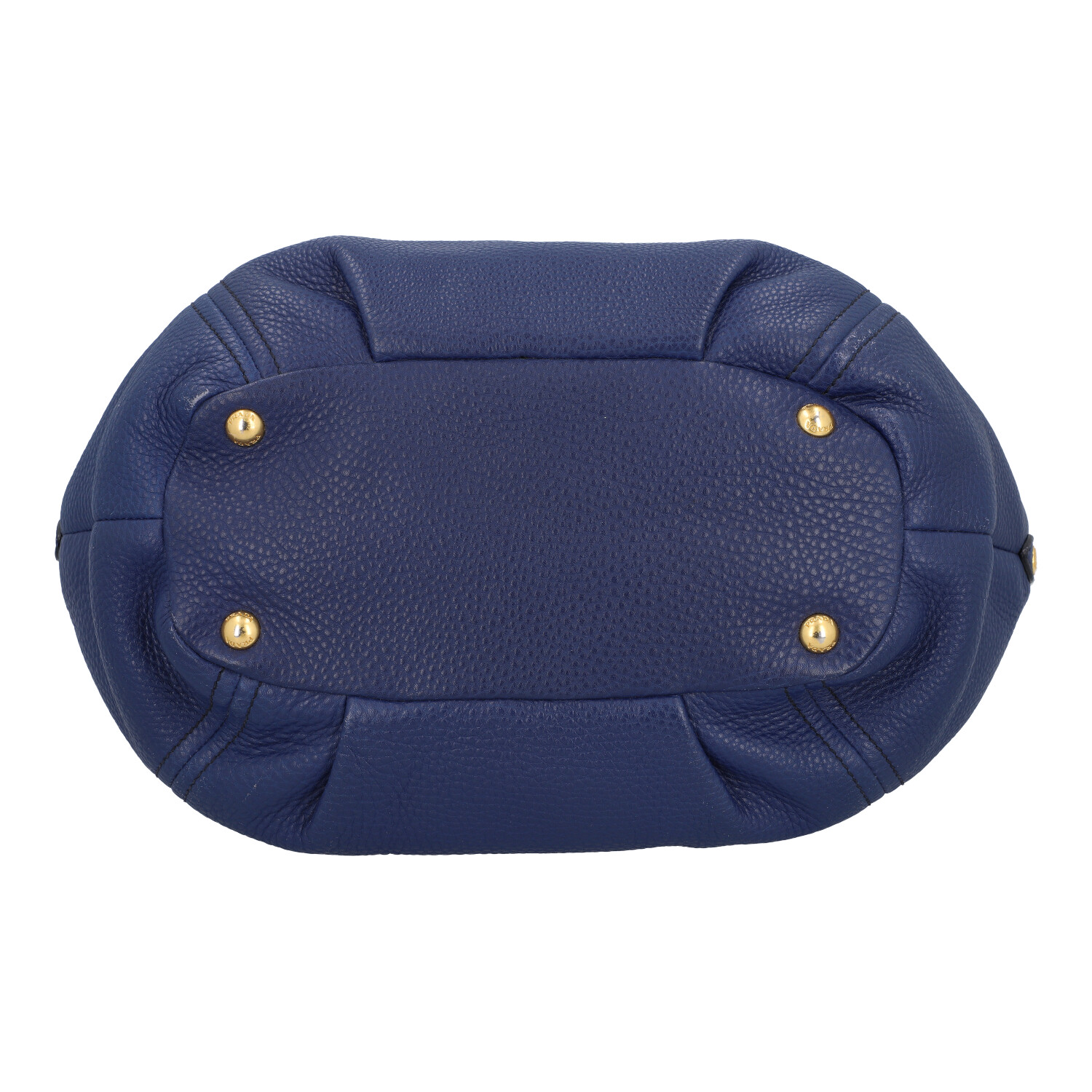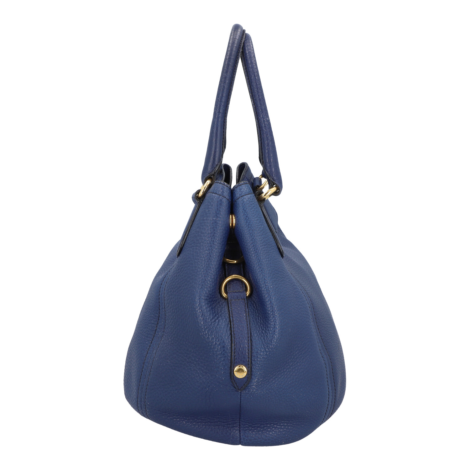 Genarbtes Leder in Dunkelblau mit goldfarbener Hardware. Doppelhenkel, Hauptfach mit Druckknopfverschluss, textiles Innenfutter mit zwei kleinen Innenfächern. Schulterriemen und Staubbeutel anbei. Abrieb und leichte Gebrauchsspuren vorhanden.
