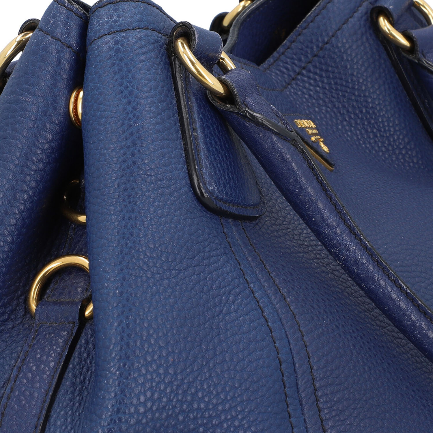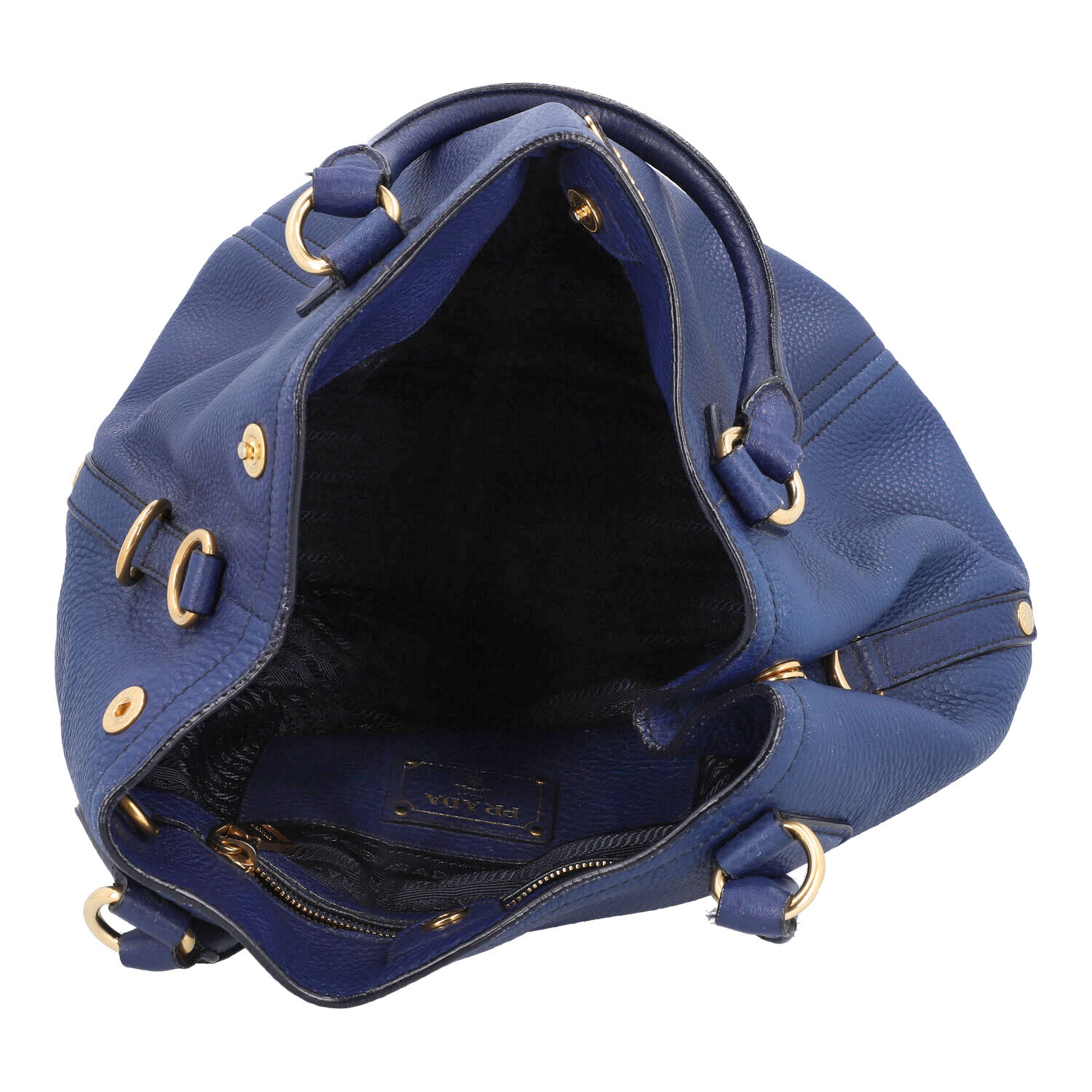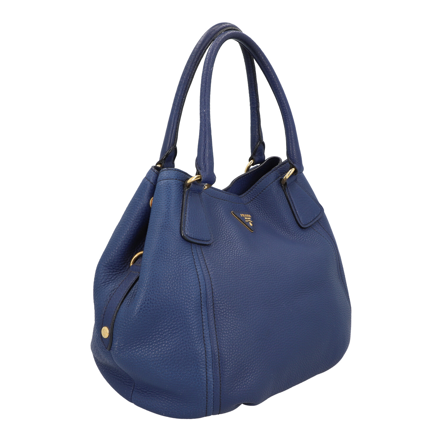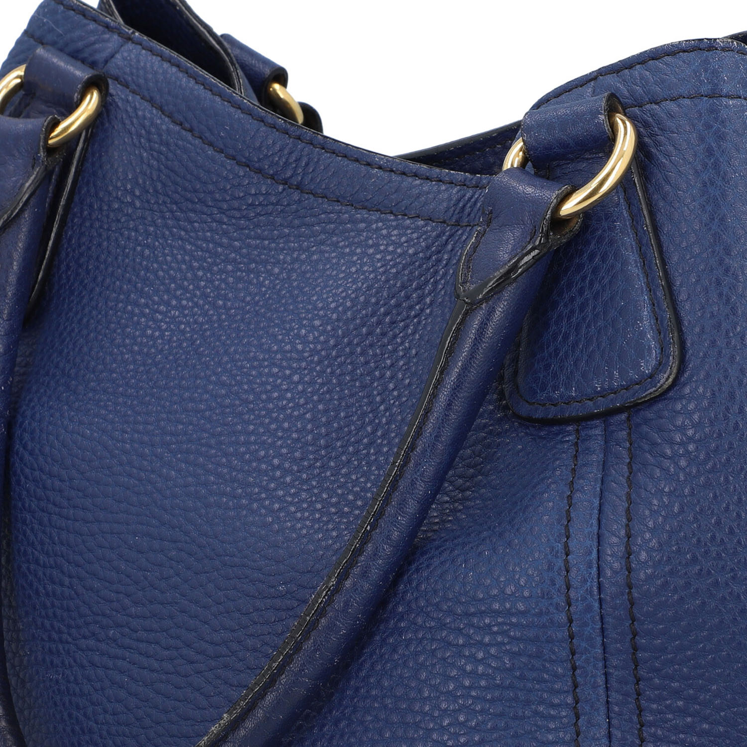 Genarbtes Leder in Dunkelblau mit goldfarbener Hardware. Doppelhenkel, Hauptfach mit Druckknopfverschluss, textiles Innenfutter mit zwei kleinen Innenfächern. Schulterriemen und Staubbeutel anbei. Abrieb und leichte Gebrauchsspuren vorhanden.