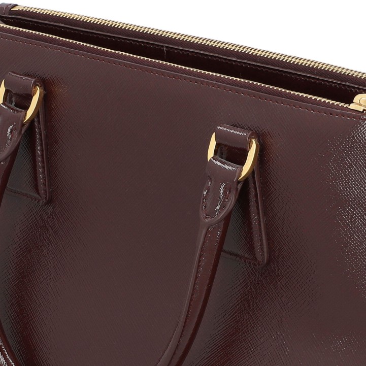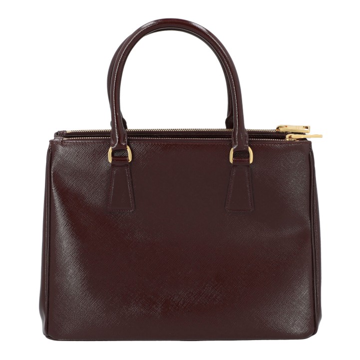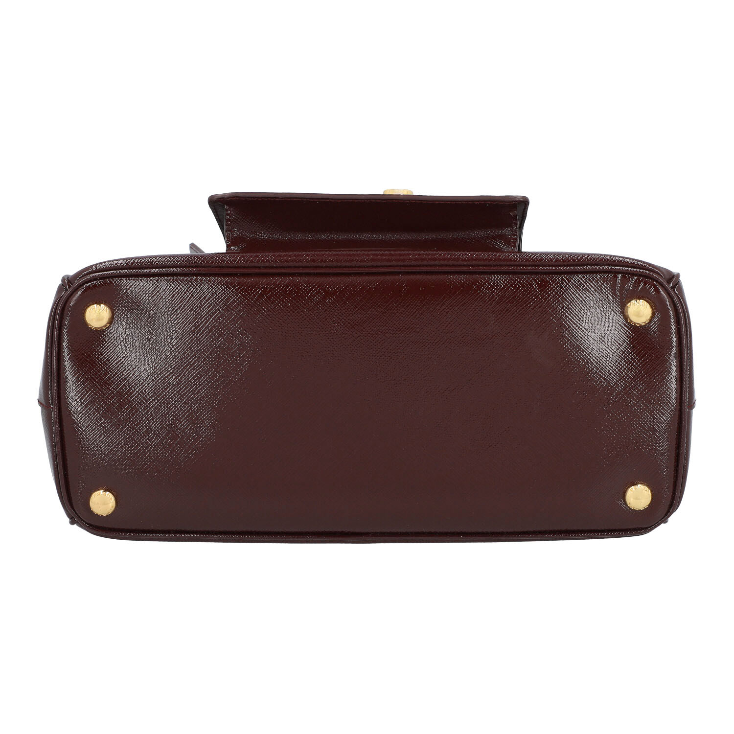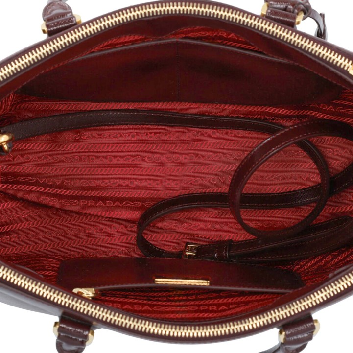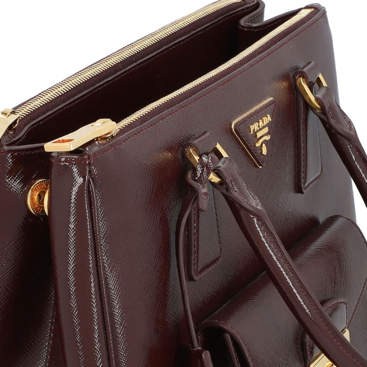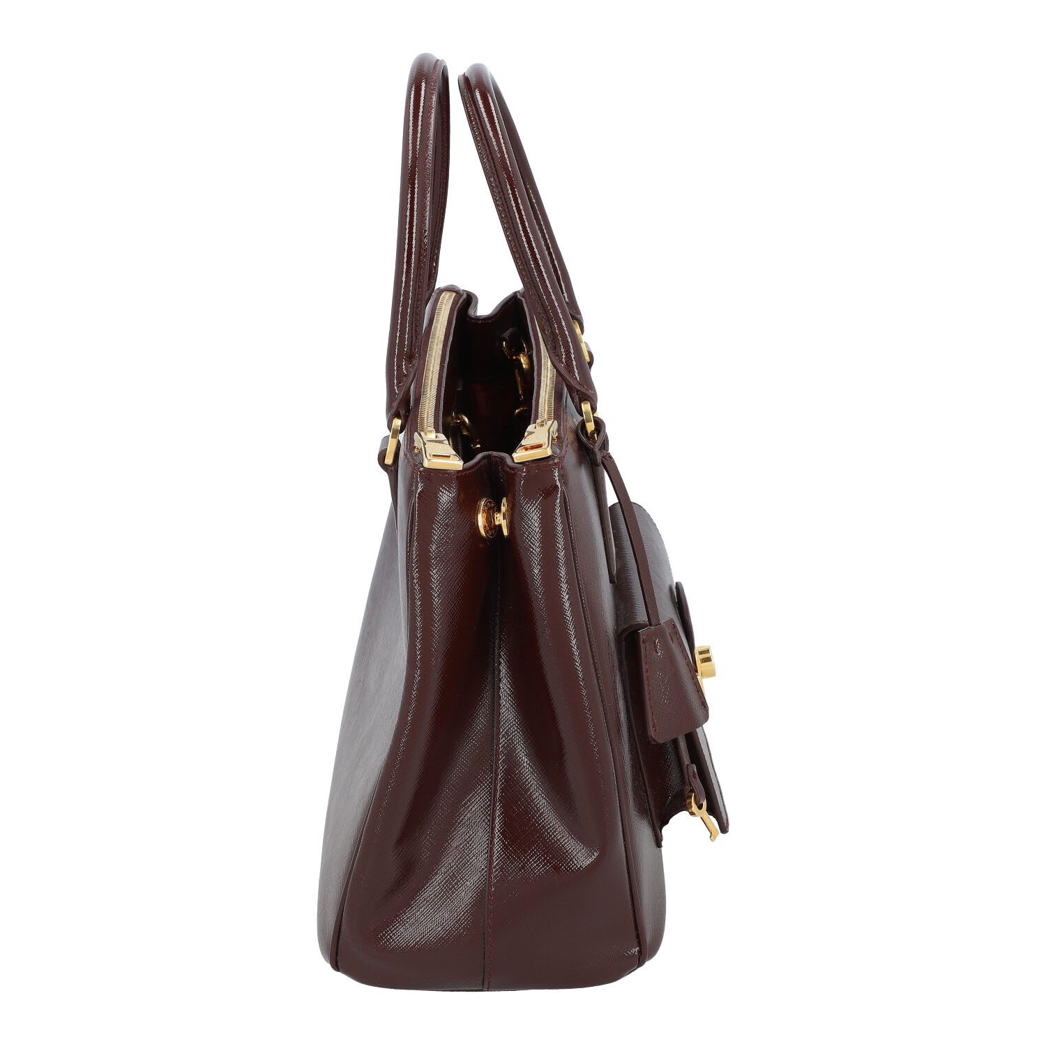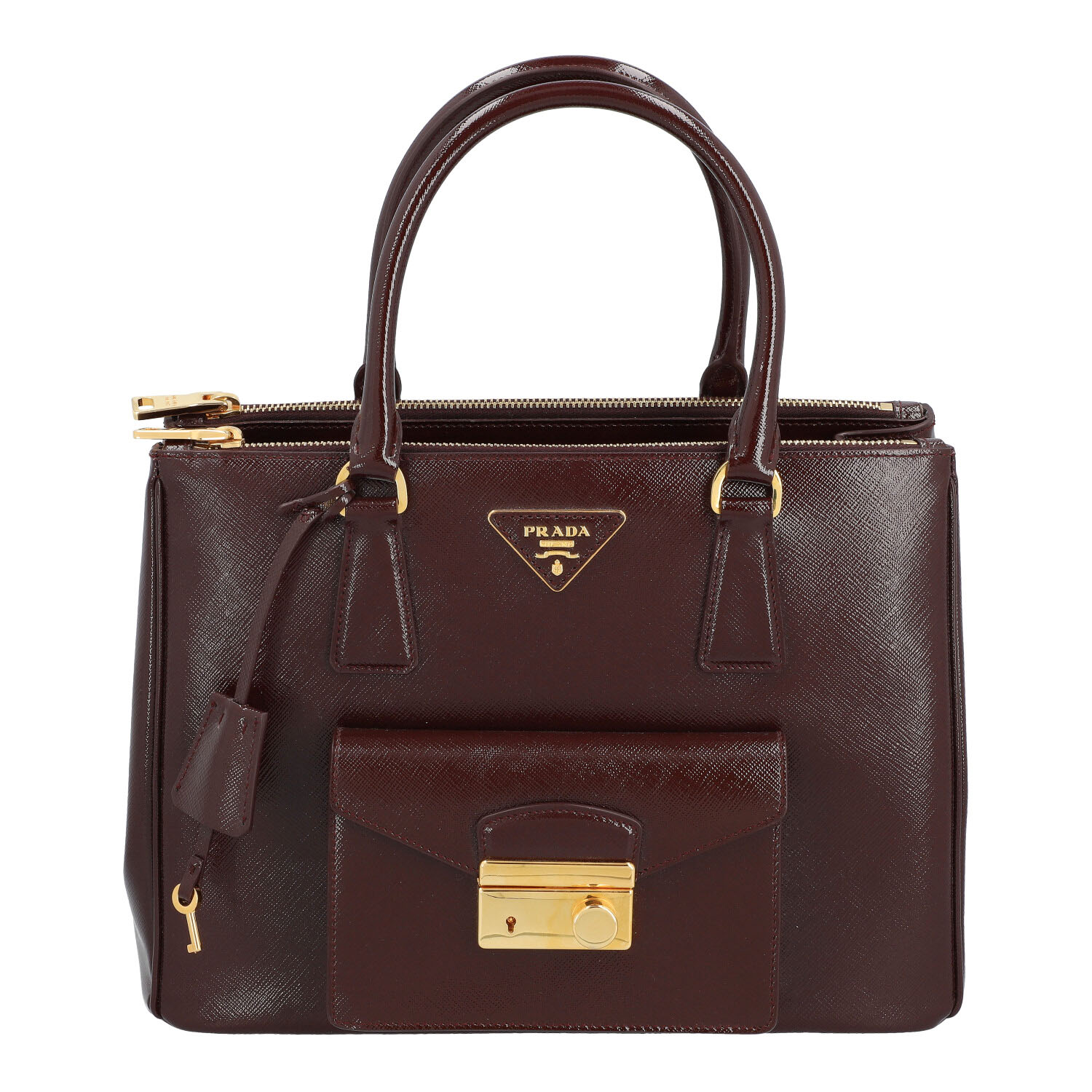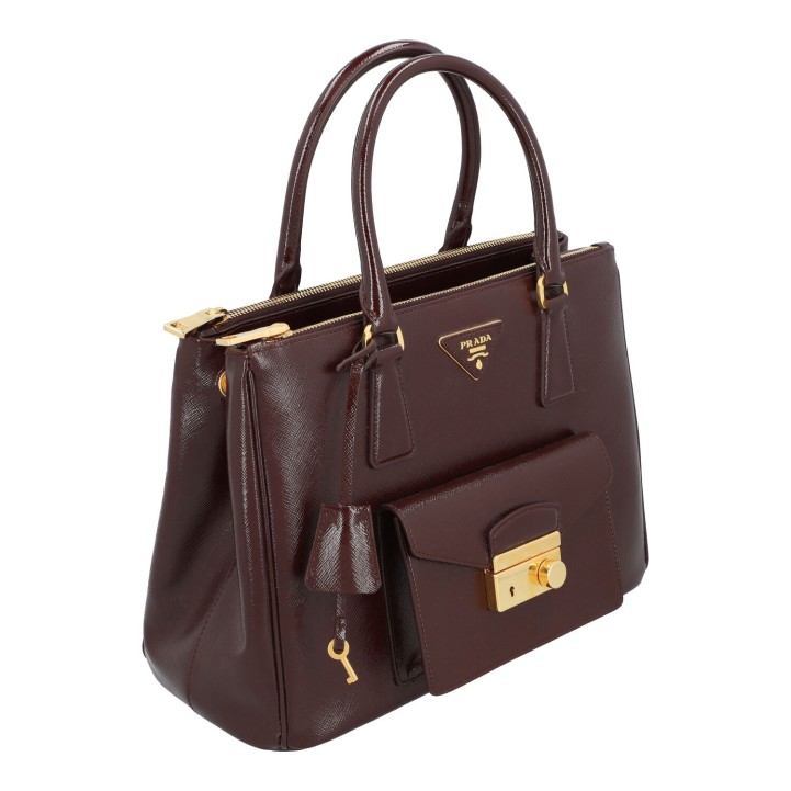 Beschichtetes Saffiano Lux Leder in Rotbraun mit goldfarbener Hardware. Front mit dekorativer Cargo Pocket. Hauptfach unterteilt in diverse Innenfächer mit textilem Innenfutter. Schulterriemen und Staubbeutel anbei. Sehr guter Erhalt. 30x13,5x22cm.
