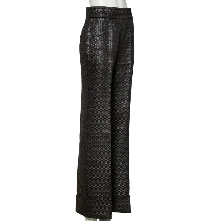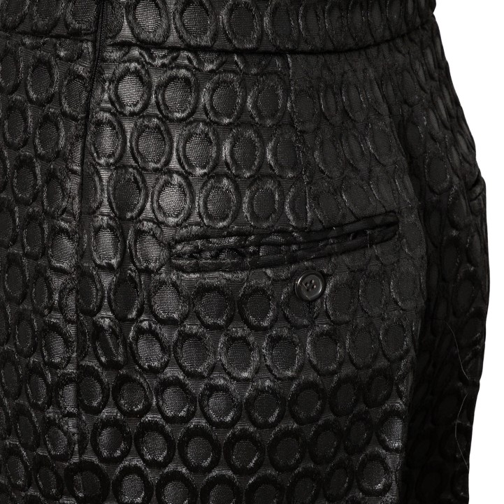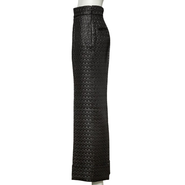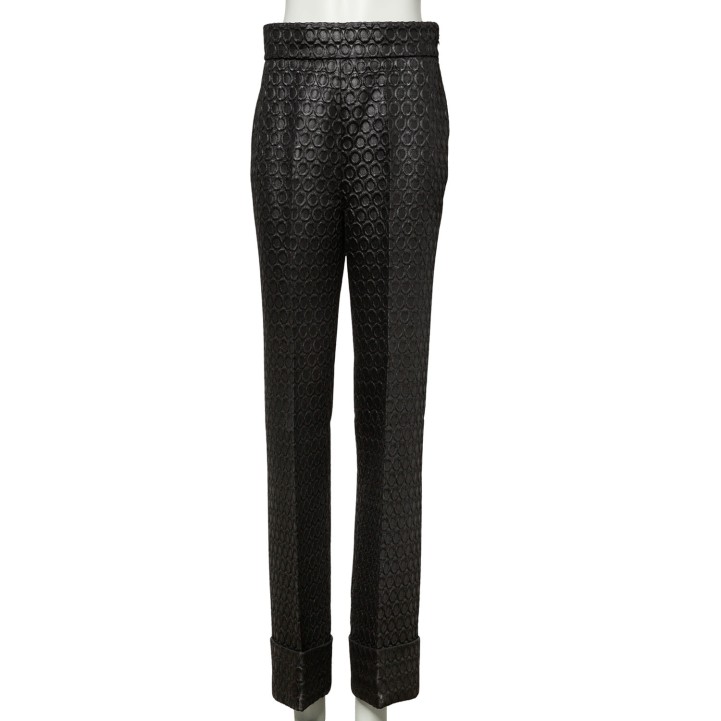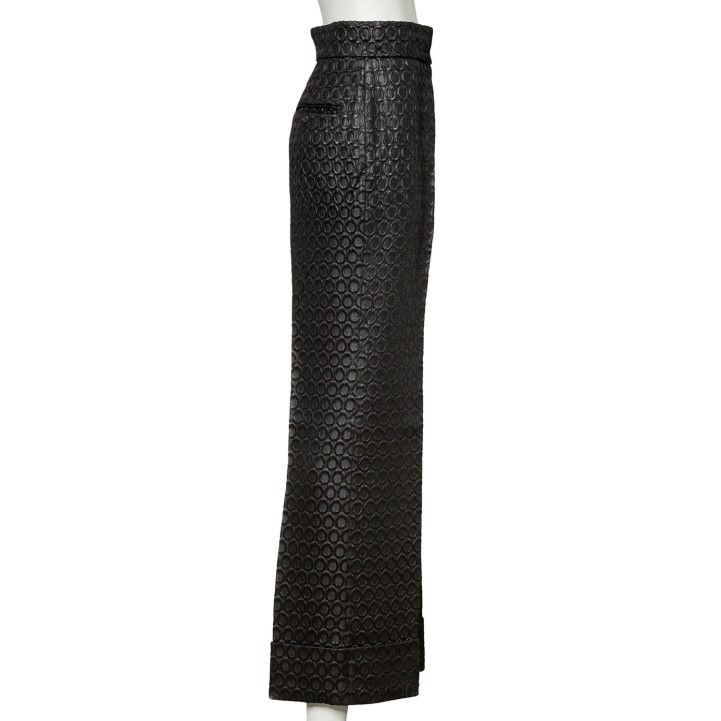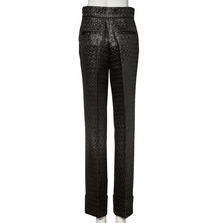 Schwarzes Modell mit breitem Bund, seitlichem Reißverschluss und Bügelfalte. Tragespuren, gezogene Fäden vorhanden.