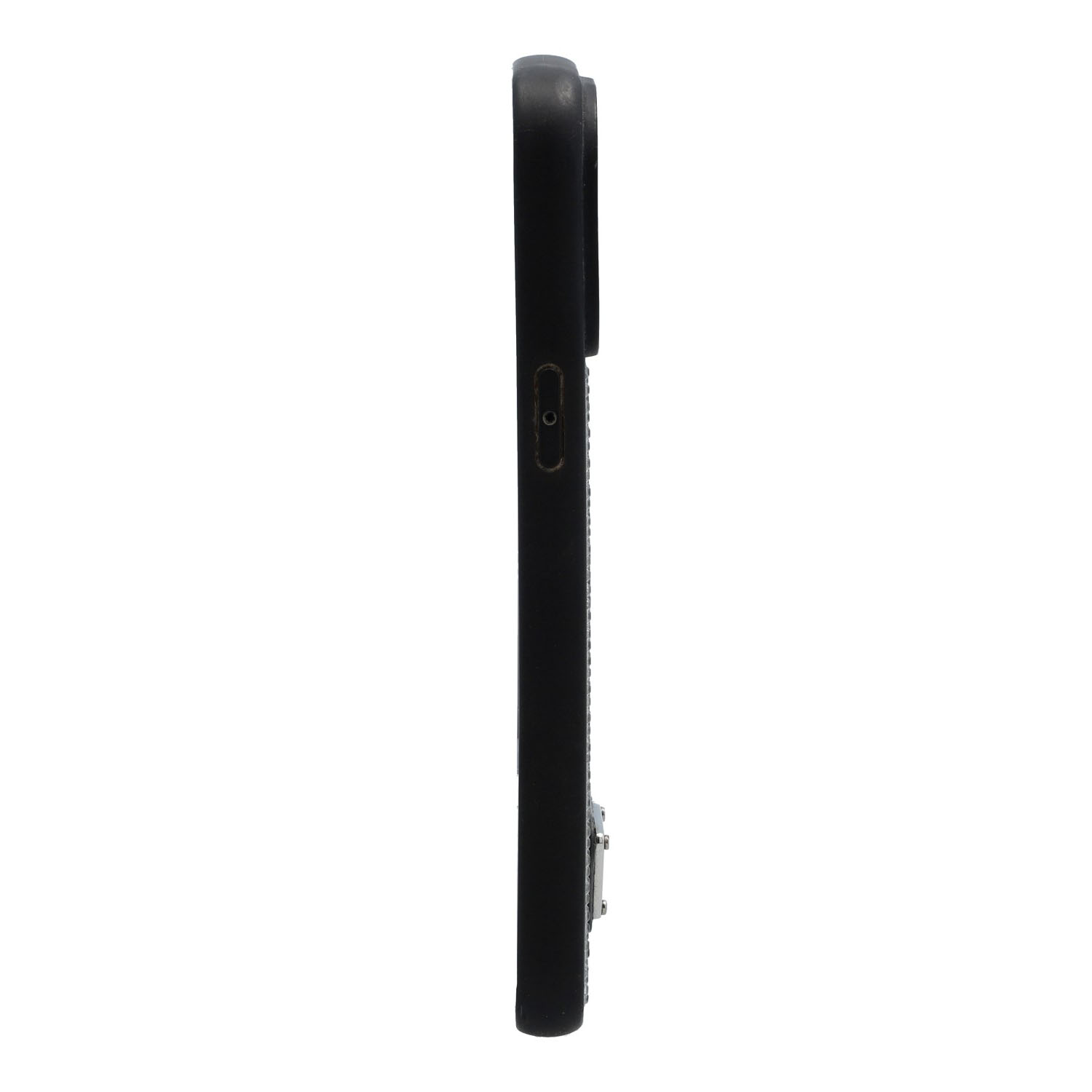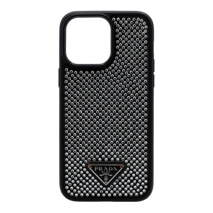 IPhone 14 Pro Max, schwarzes Modell mit Strassteinbesatz und Triangolo-Logo aus emailliertem Metall. Gebrauchsspuren vorhanden.