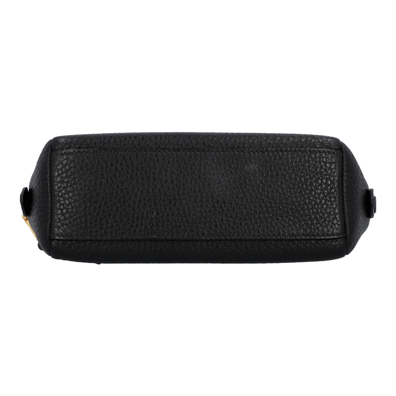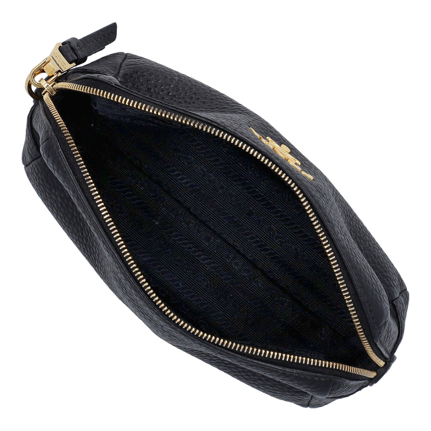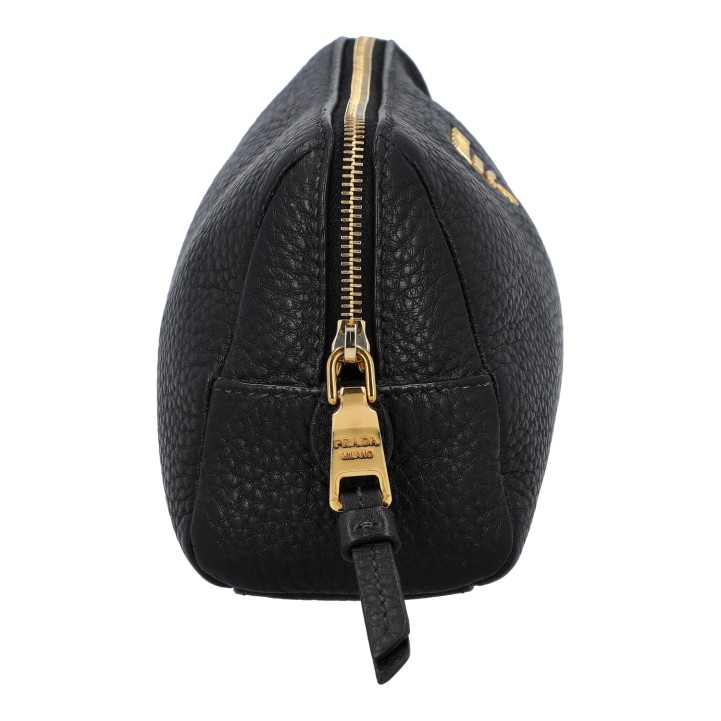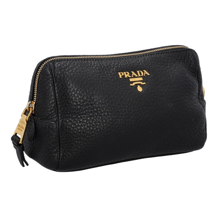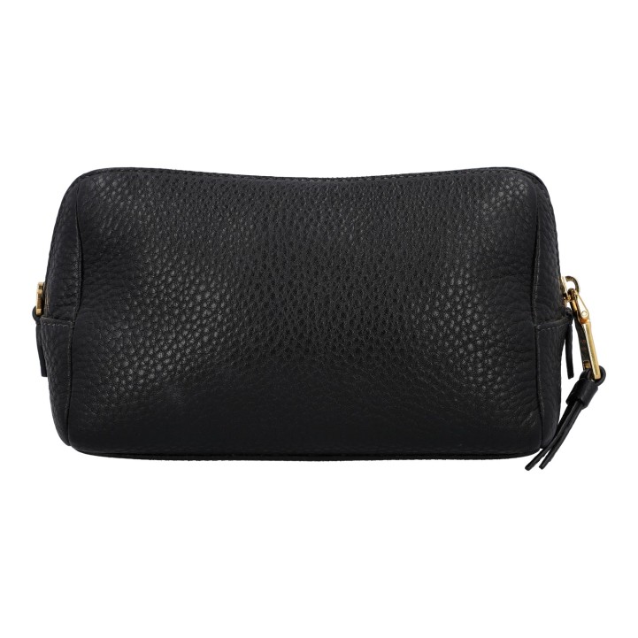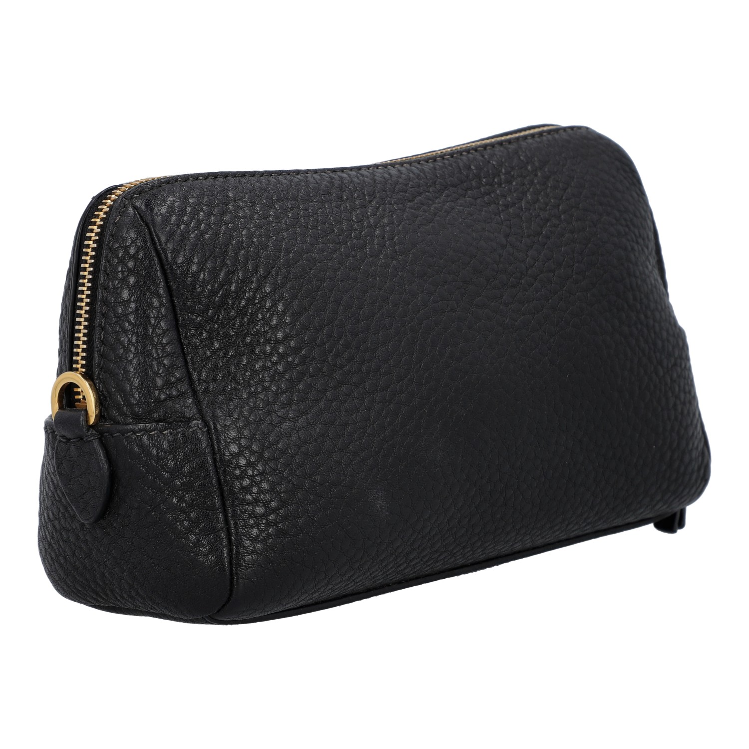 Kosmetiketui aus Leder in Schwarz mit goldfarbener Hardware. Logo auf der Front, umlaufender Reißverschluss, textiles Innenfutter. Guter Erhalt. 17x7x10cm.