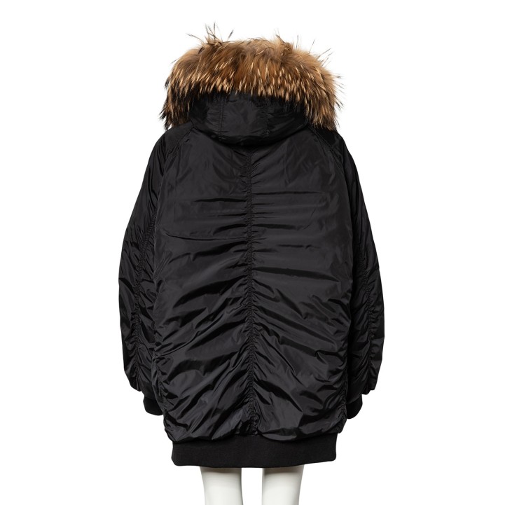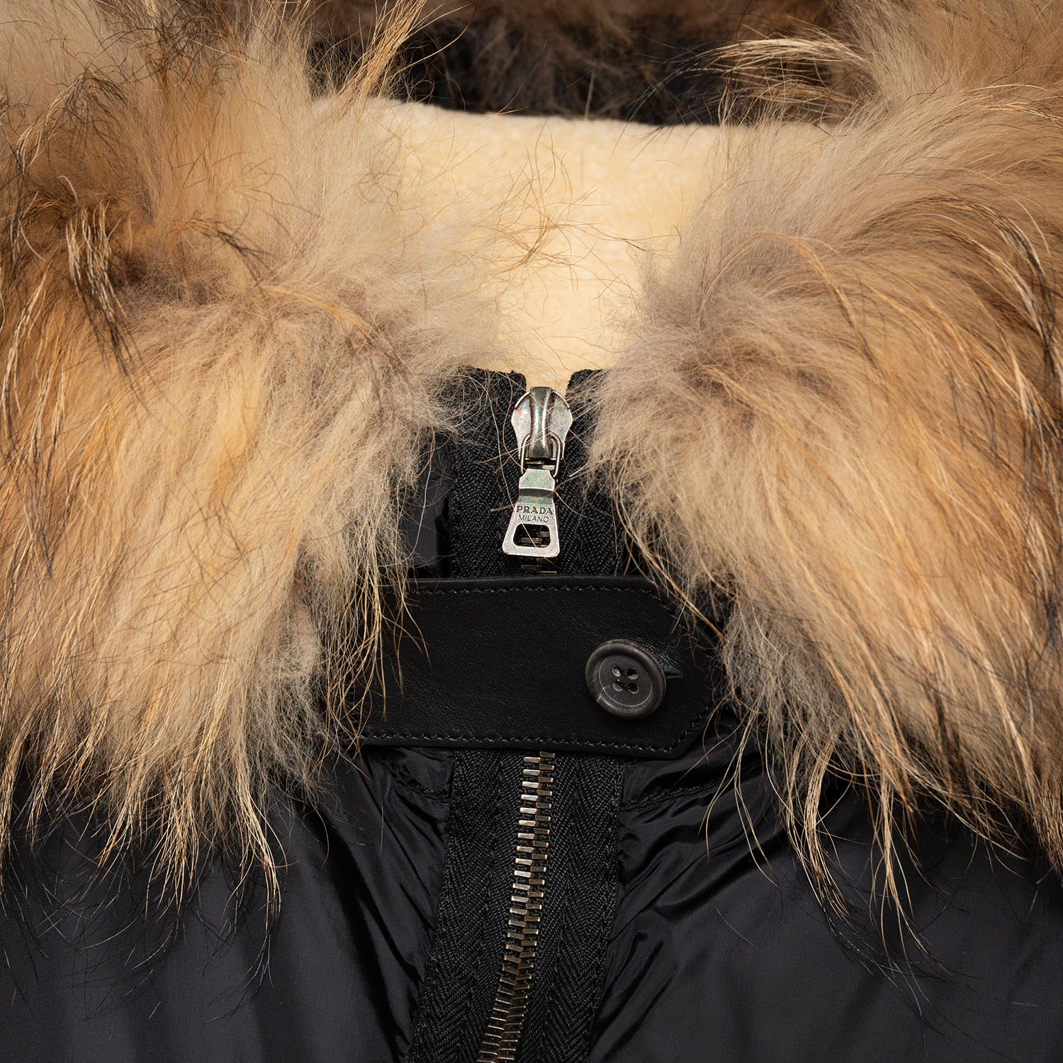Schwarzes Modell aus Nylon mit silberfarbener Hardware, Reiß- und Knopfverschluss, Kapuze mit Futter und Fellverbrämung sowie Reißverschlusstaschen. Tragespuren vorhanden.