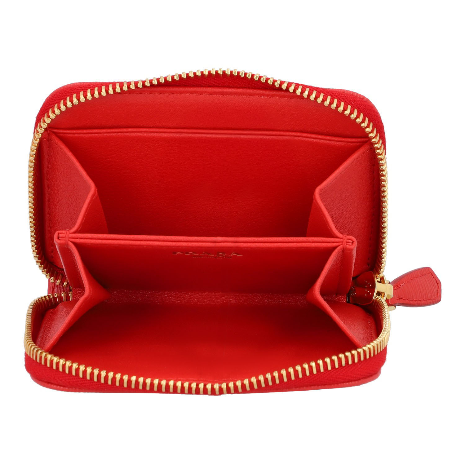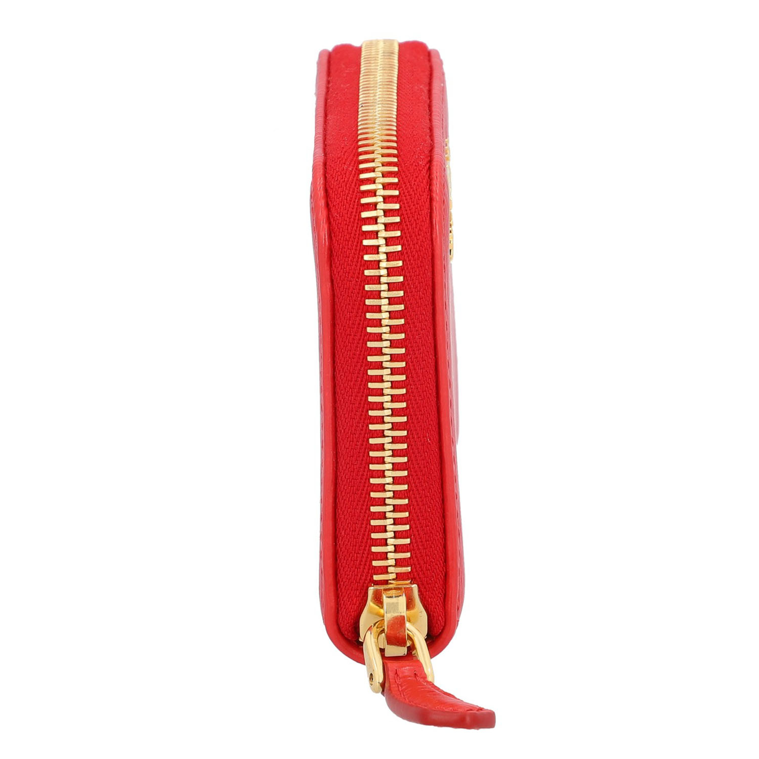 Rotes Modell aus Saffianoleder mit goldfarbener Hardware und umlaufendem Reißverschluss. Innenraum mit vier Abteilen. Box anbei. Neuwertig. 10 x 2 x 8 cm