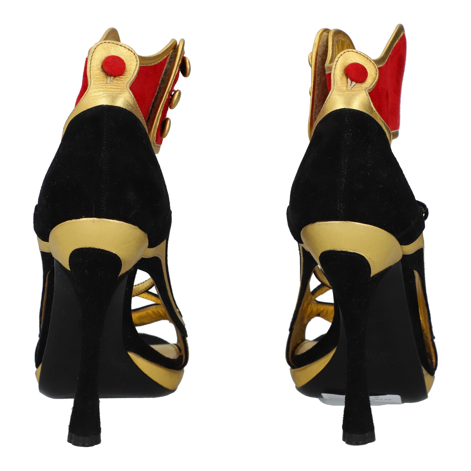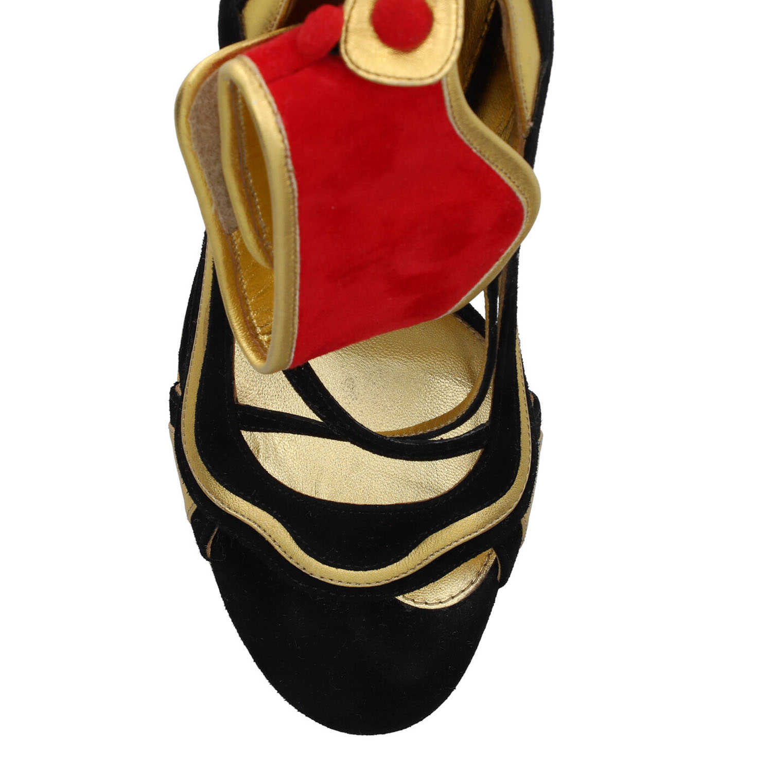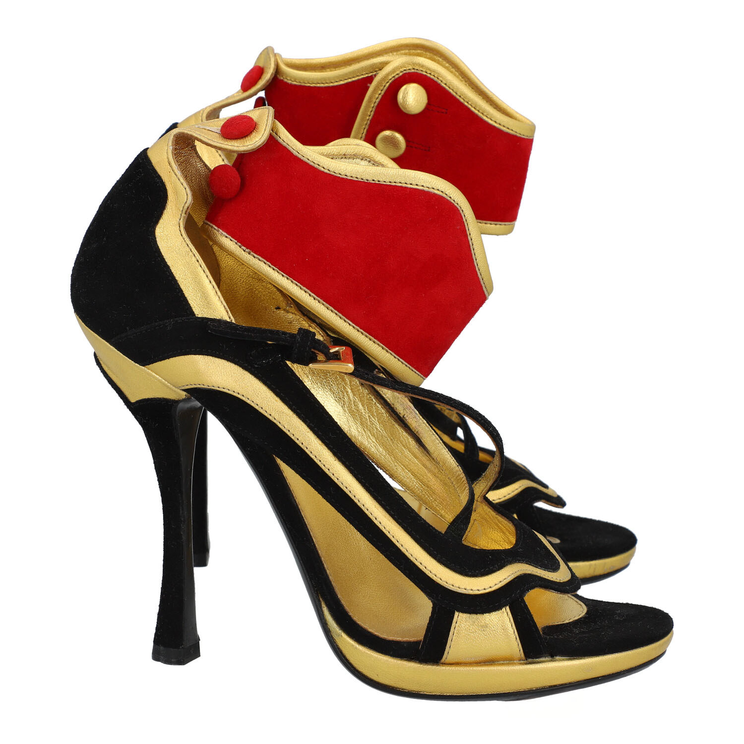 Veloursleder in Schwarz mit goldfarbenen Details, dekorativen Riemen und Cuff am Knöchel in Rot. Staubbeutel anbei. Tragespuren vorhanden.