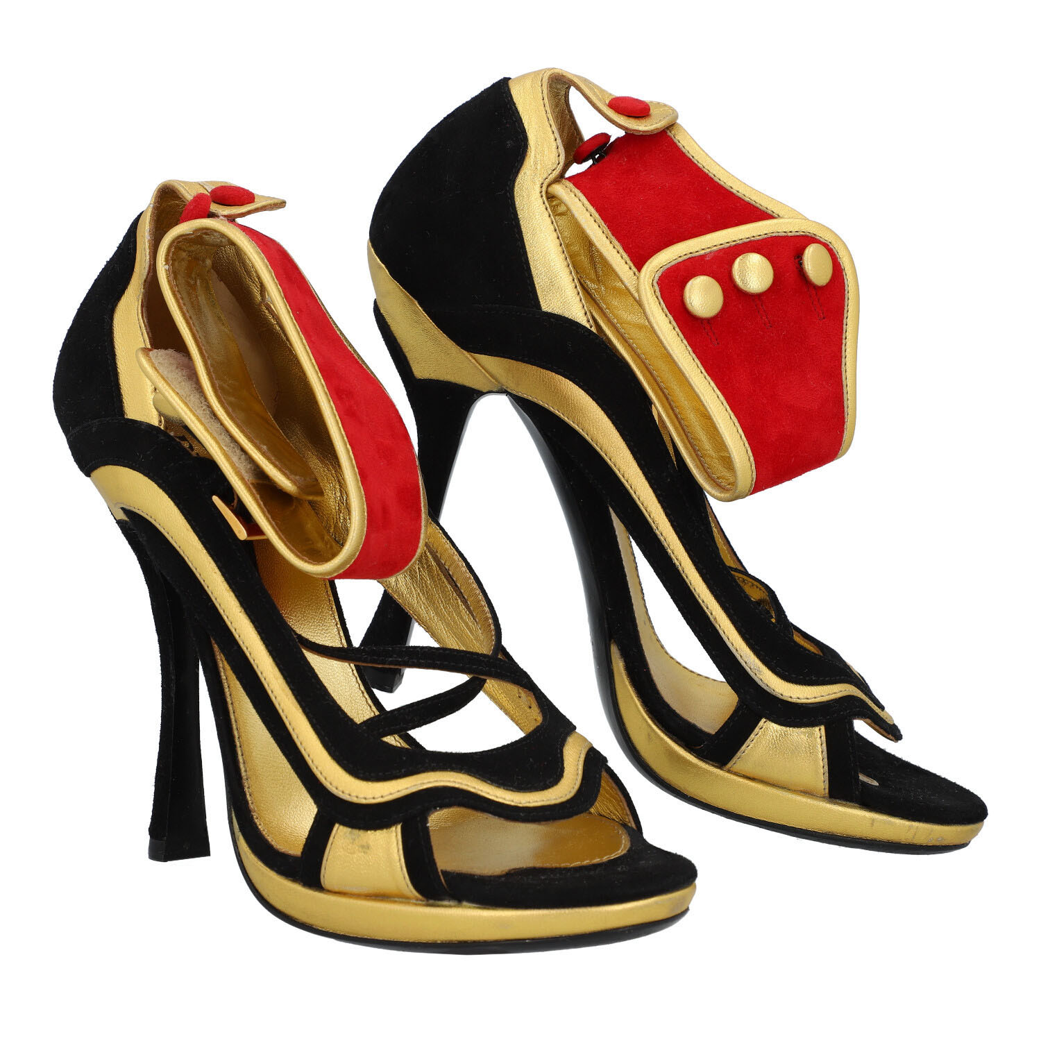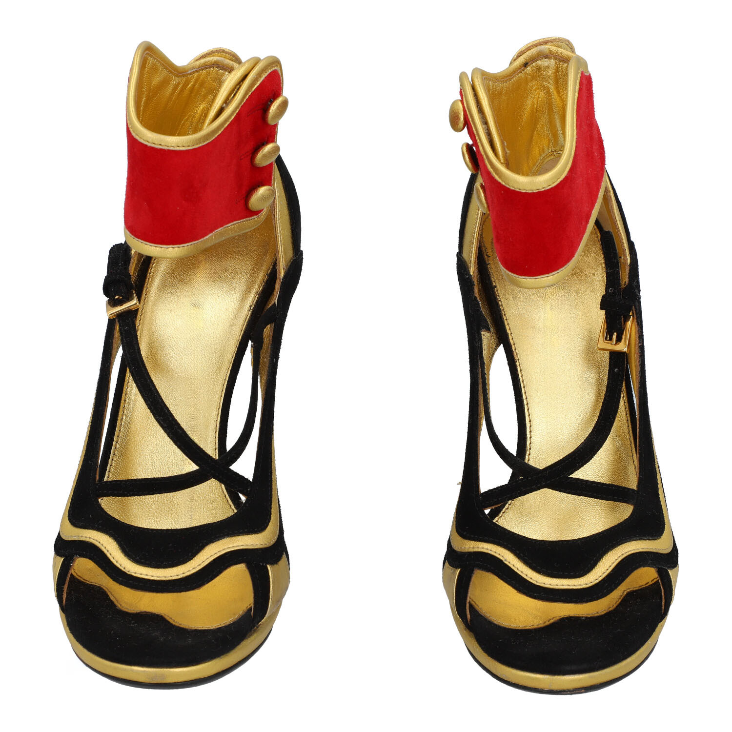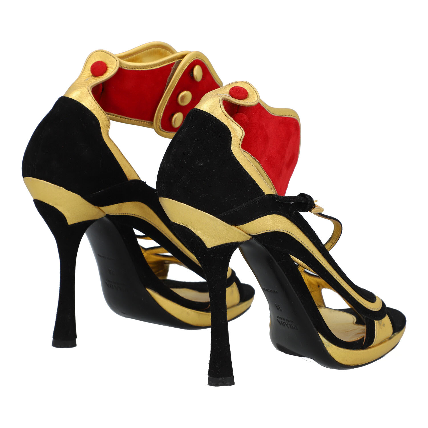 Veloursleder in Schwarz mit goldfarbenen Details, dekorativen Riemen und Cuff am Knöchel in Rot. Staubbeutel anbei. Tragespuren vorhanden.