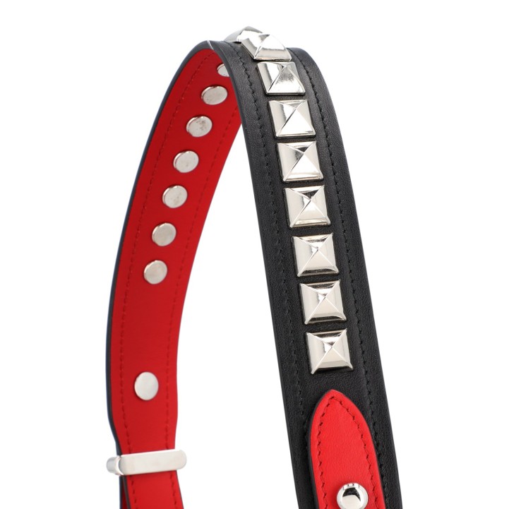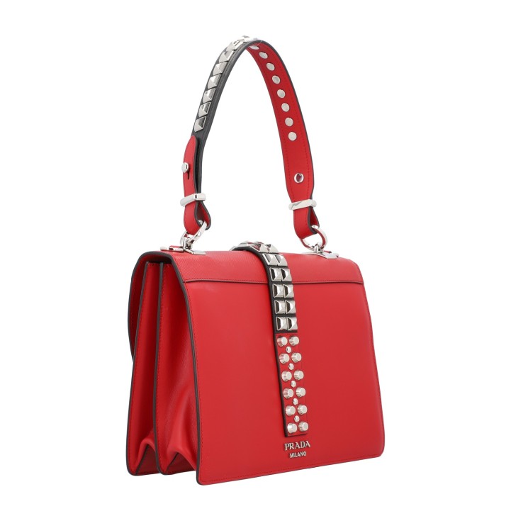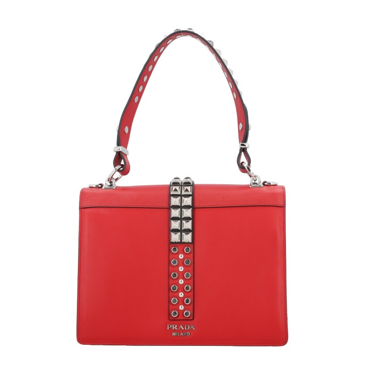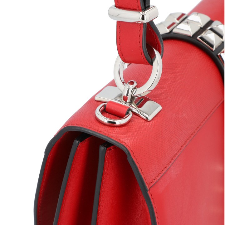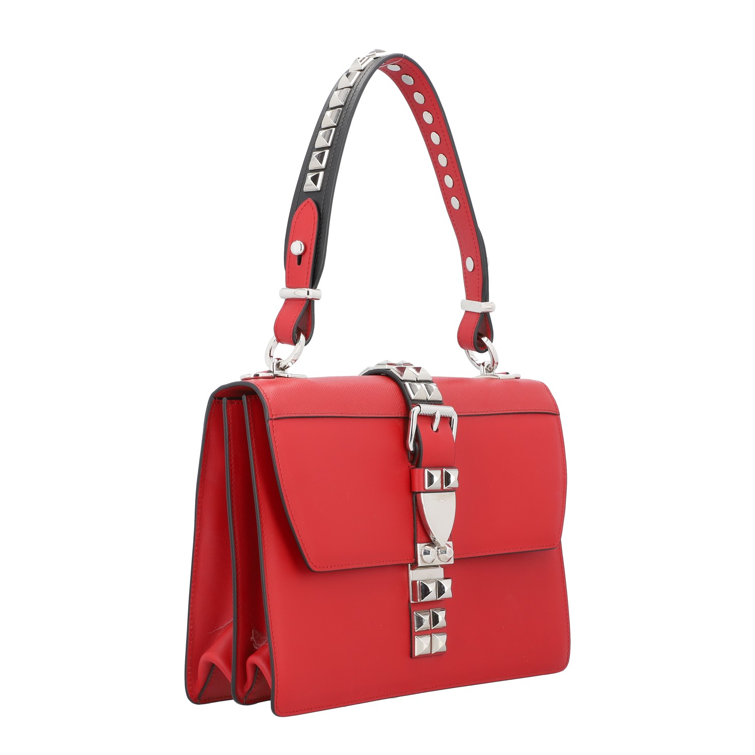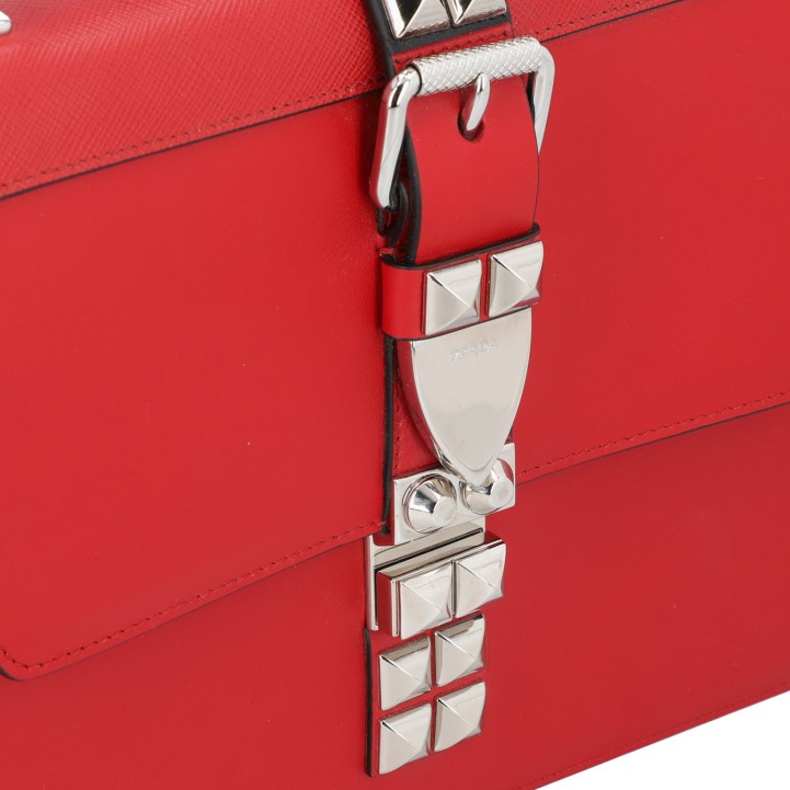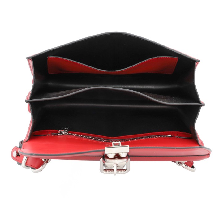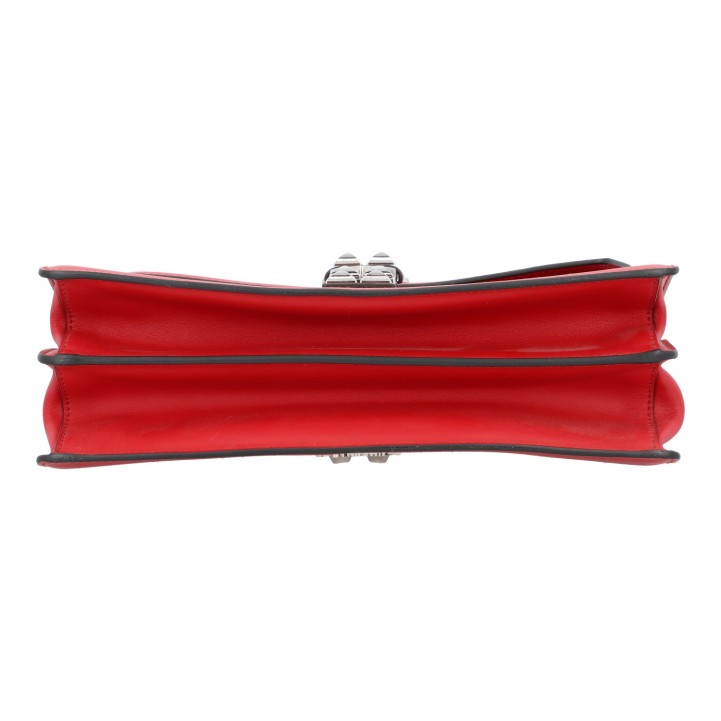 Rotes Saffianoleder mit silberfarbener Hardware, Überschlag mit Schließe, Nietendekor und Schulterriemen. Innenraum mit zwei Abteilen sowie zwei zusätzlichen Fächern, eines davon mit Reißverschluss. Schulterriemen anbei. Dezente Gebrauchsspuren. 26 x 7 x 21 cm.