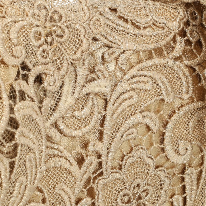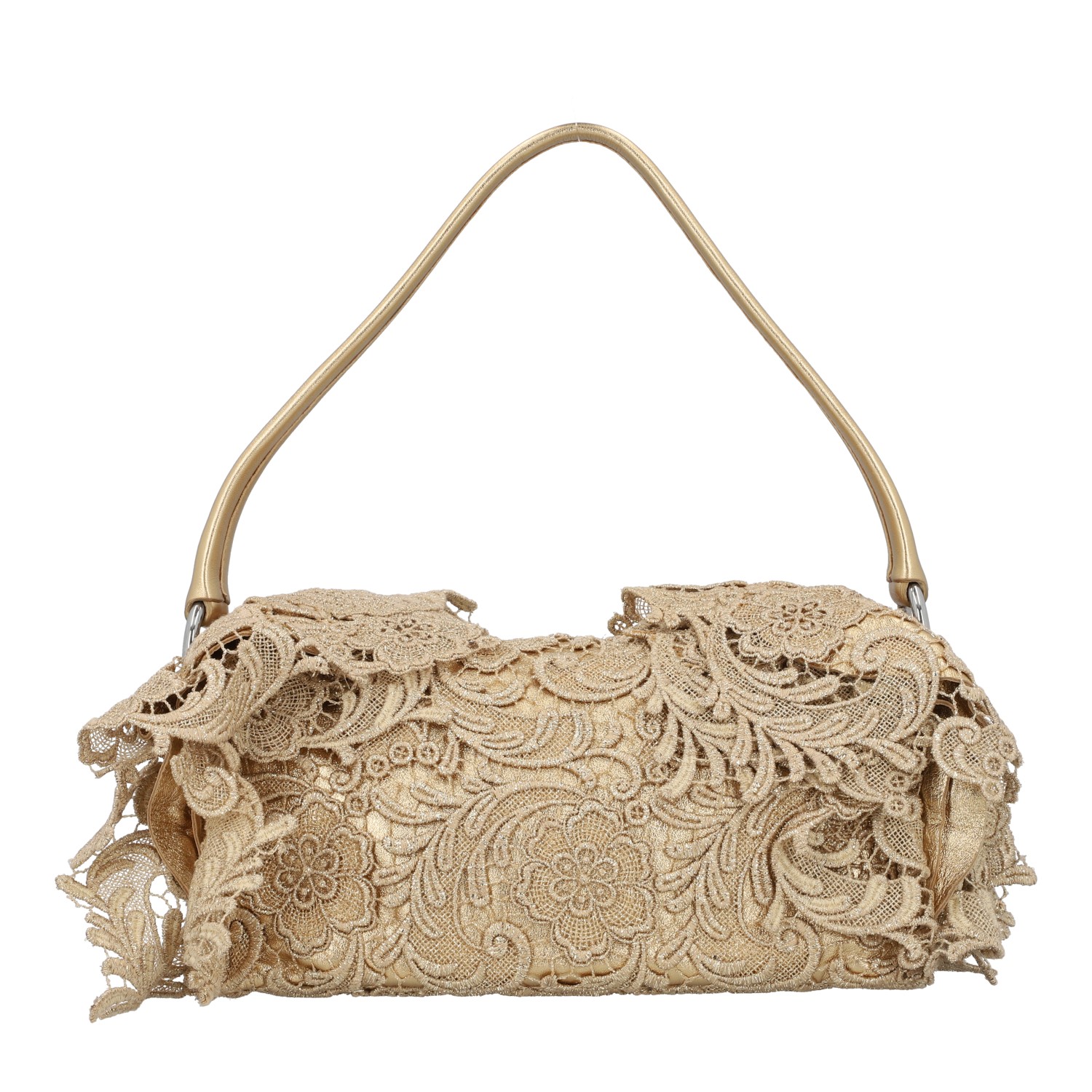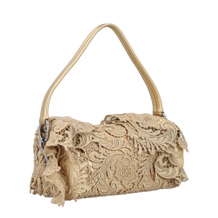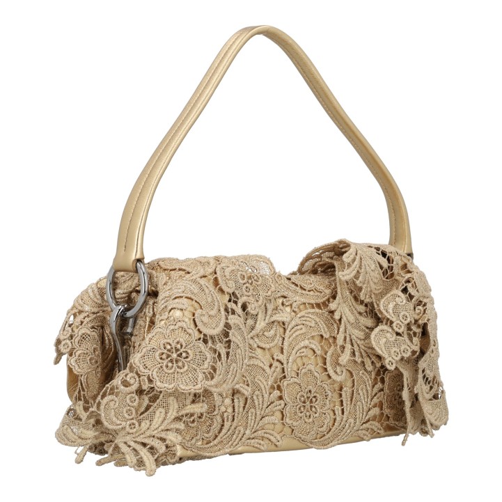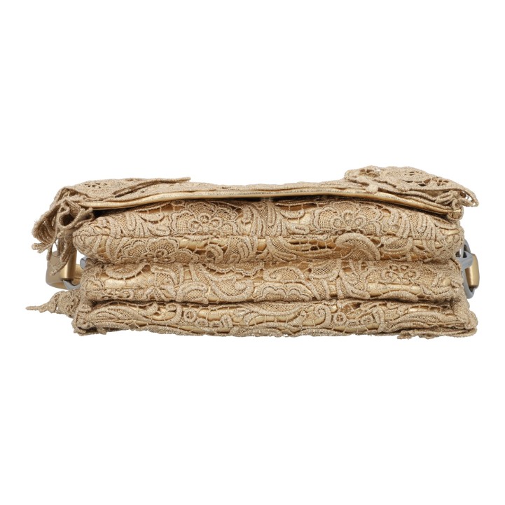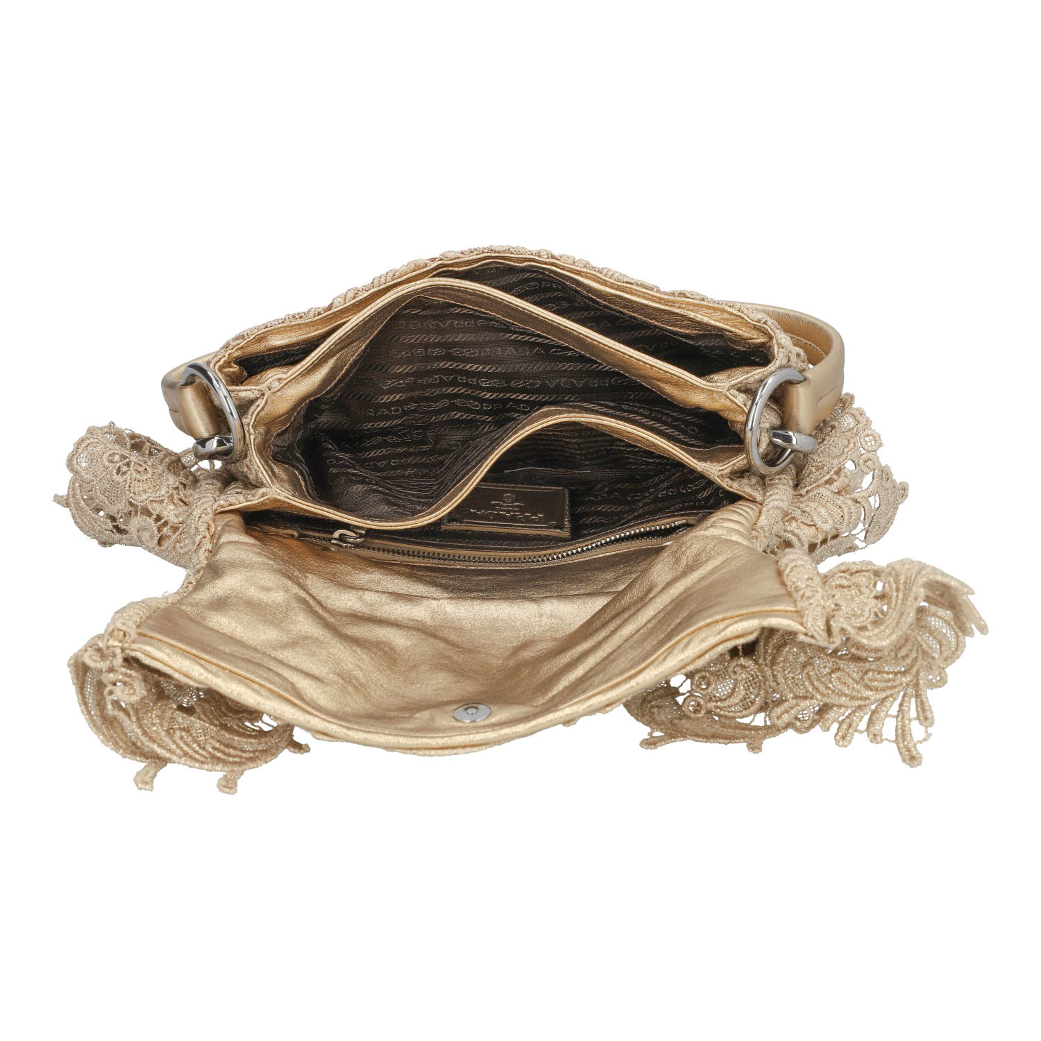Goldfarbenes Modell aus Leder mit feiner Spitze. Hardware in Silberfarben. Hauptfach mit Überschlag und magnetischem Verschluss. Diverse Innenfächer. Guter Erhalt. 28x6x14cm.