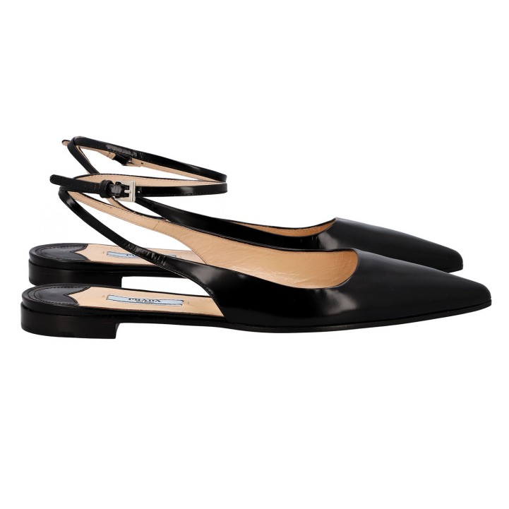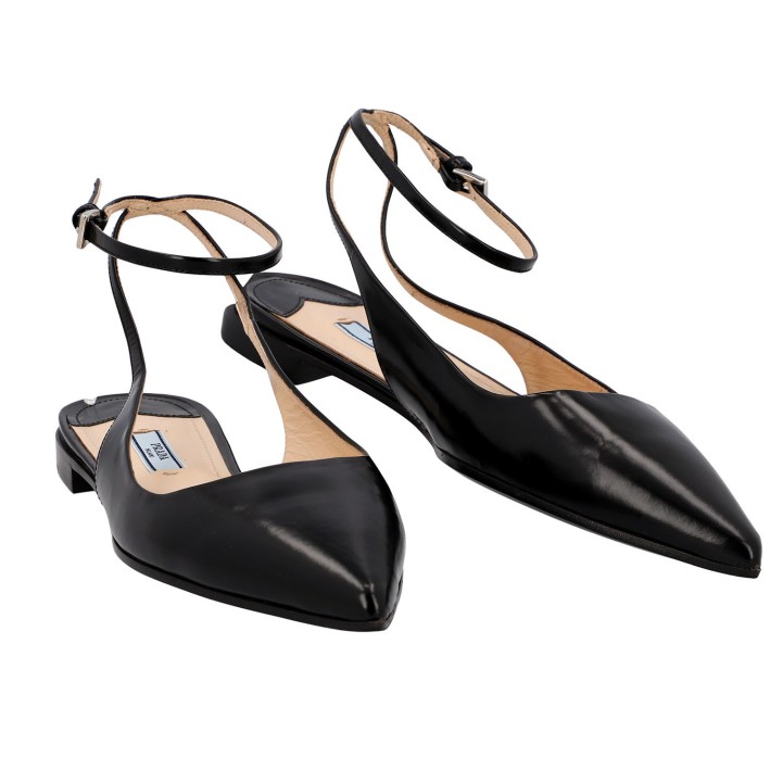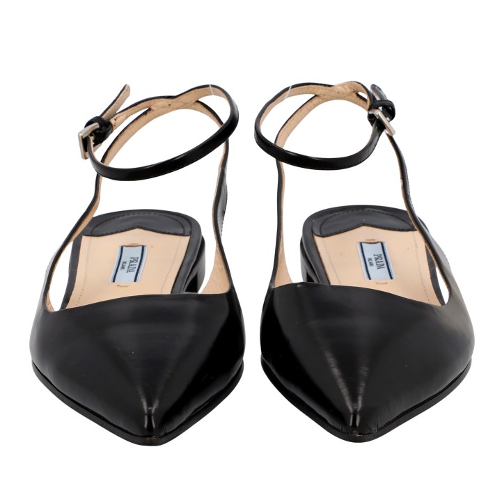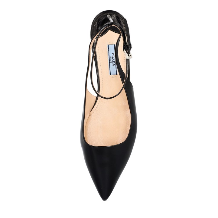 Slingback aus schwarzem Glattleder mit spitzer Schuhform. Ledersohle mit flachem Absatz. Guter Erhalt. Box und Staubbeutel anbei.