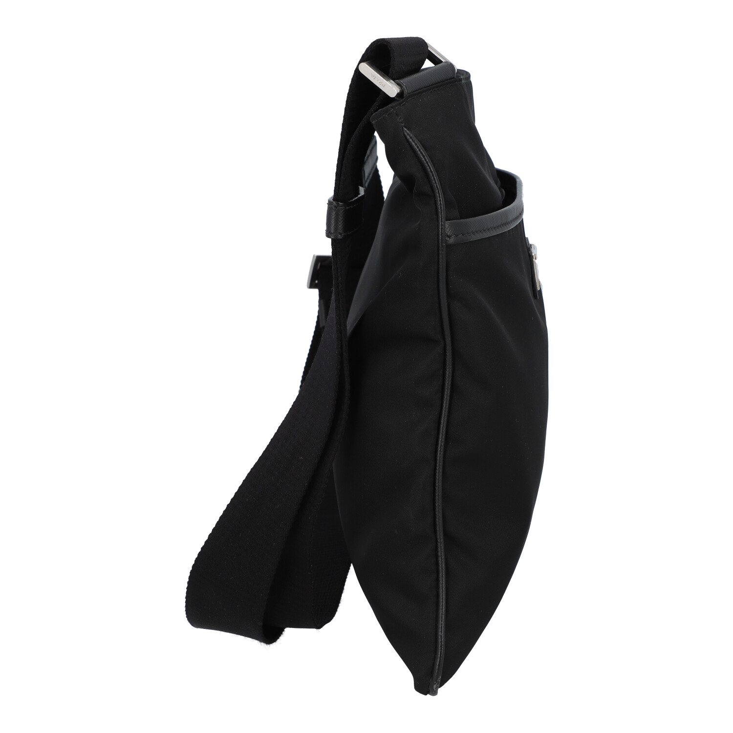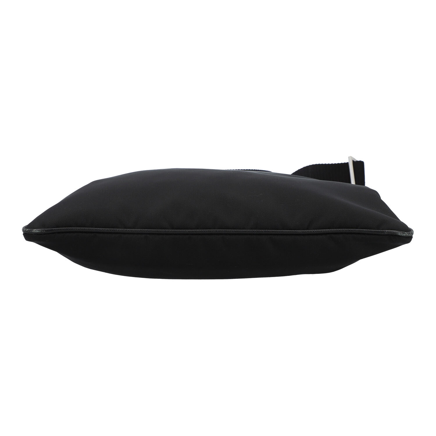 Textil und Leder in Schwarz mit silberfarbener Hardware. Sportliches Modell mit Logo-Applikation auf der Front und einem Außenfach mit Reißverschluss. Hauptfach mit Reißverschluss und einem kleinen Innenfach. Leichte Gebrauchsspuren vorhanden. 30x26cm.