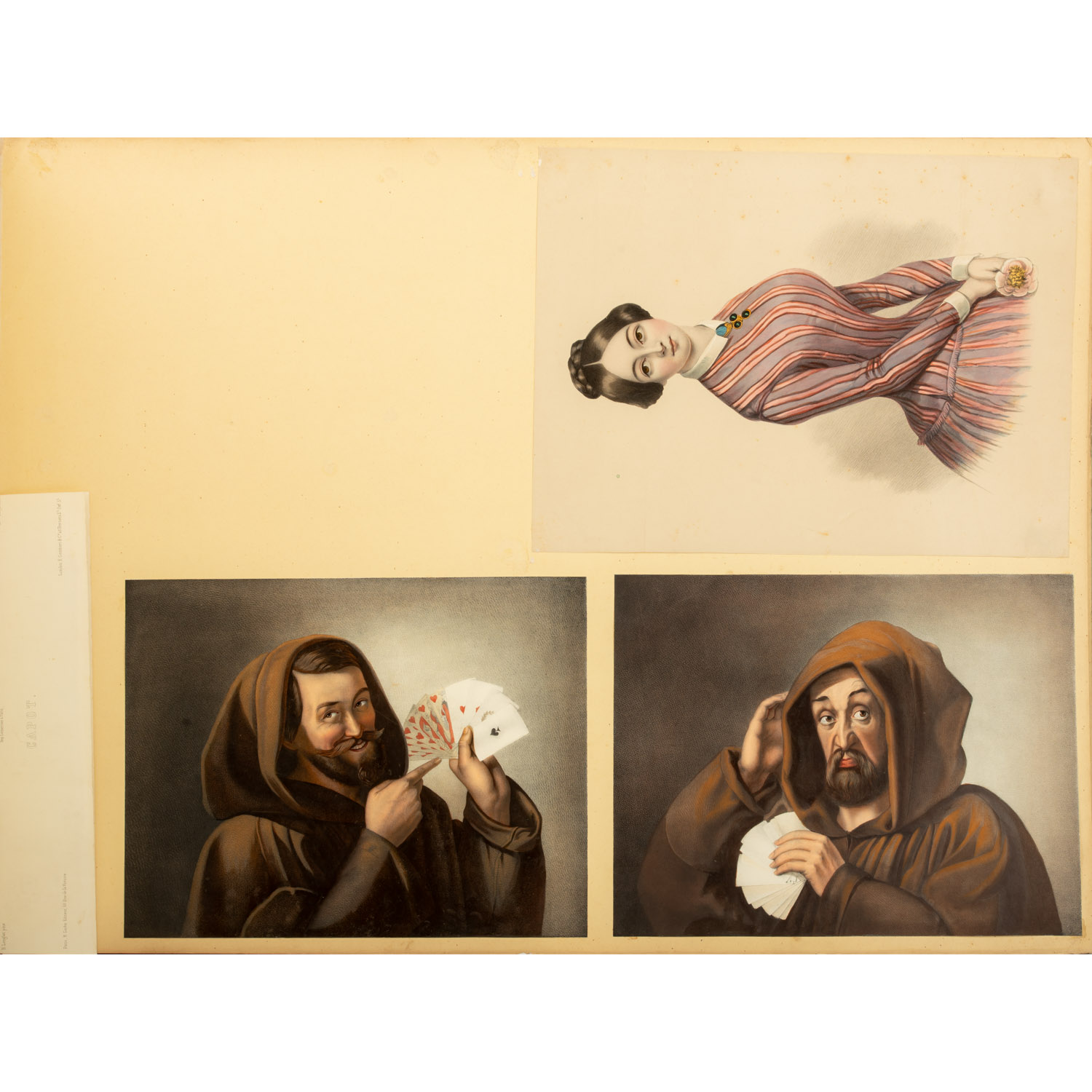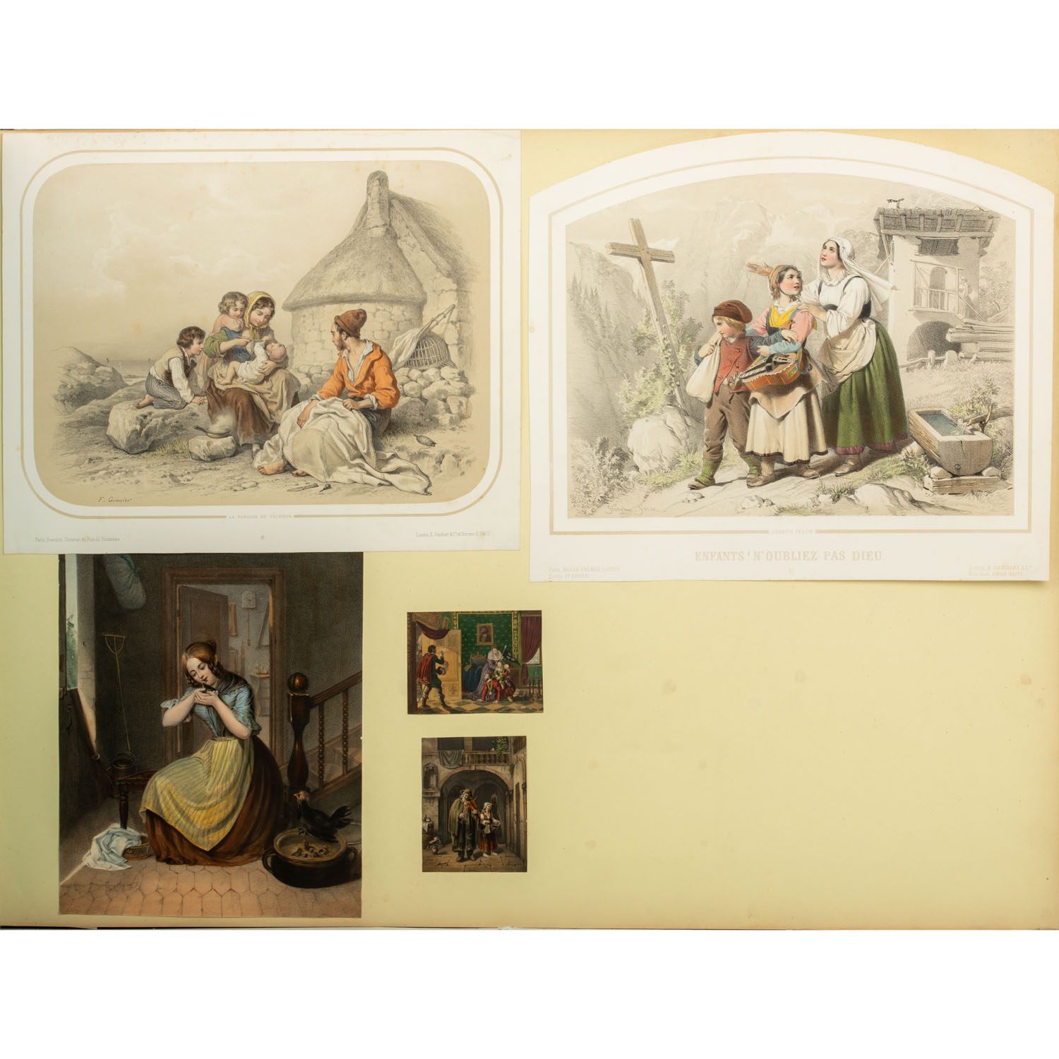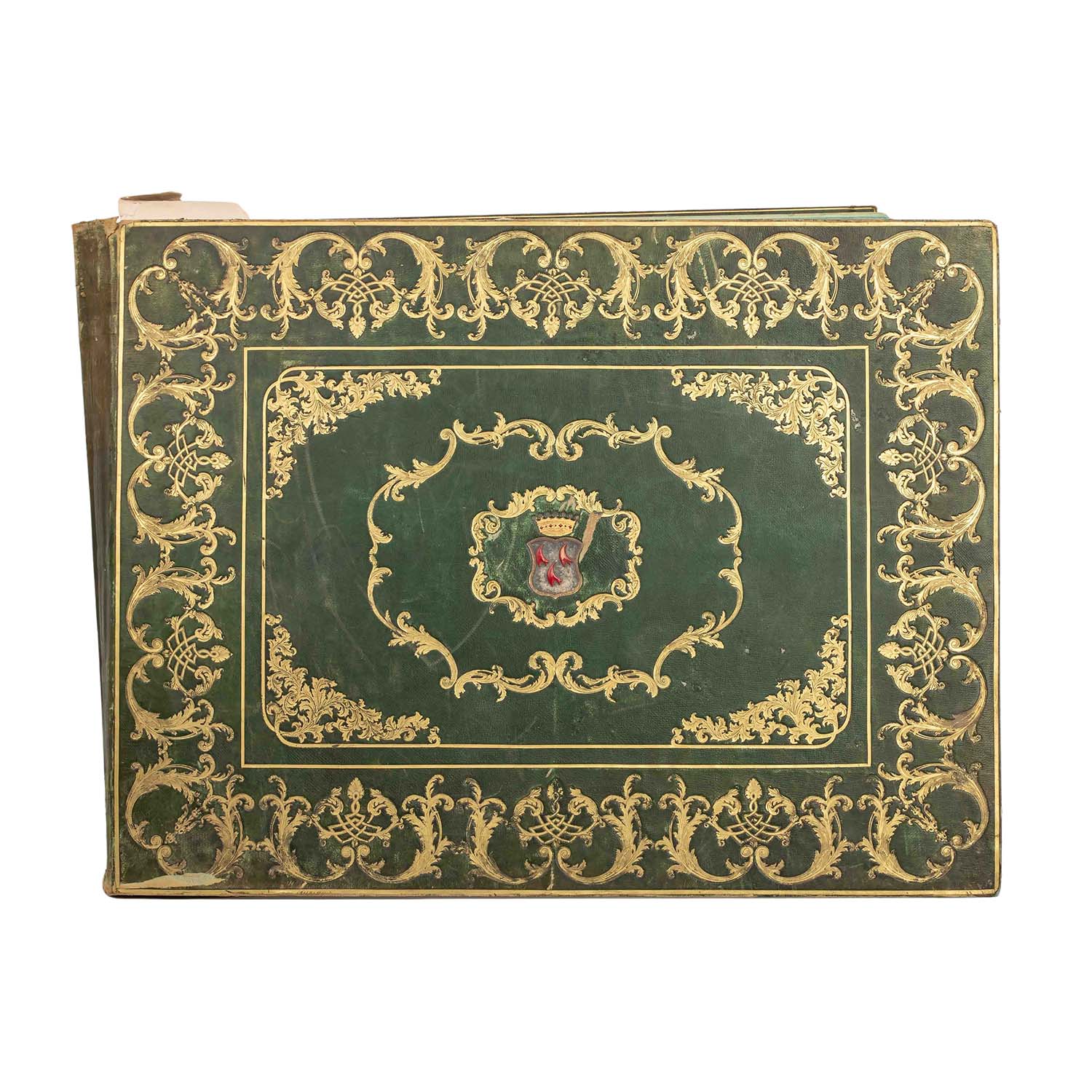 grünes Leder mit Prägearbeit, das Wappen des Adelsgeschlechts von Bussche befindet sich auf der Vorderseite. Die Mappe beinhaltet 38 Seiten mit diversen Grafiken, darunter Jagdszenen und Grafiken zur ersten Weltausstellung, Portraits und Illustrationen, HxB: Mappe ca. 53,5x72 cm. Nicht vollständig. Starke Alters- und Beriebspuren, bestoßen, an Kapitalen aufgeplatzt, fleckig, die Grafiken tlw. eingeklebt, part. beschnitten und beschädigt. ANBEI: Beschreibung und Kaufbeleg Dorotheum.