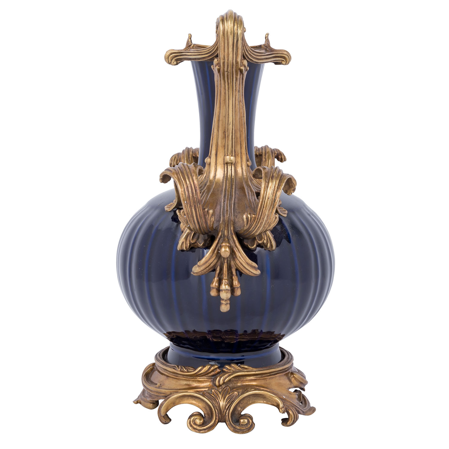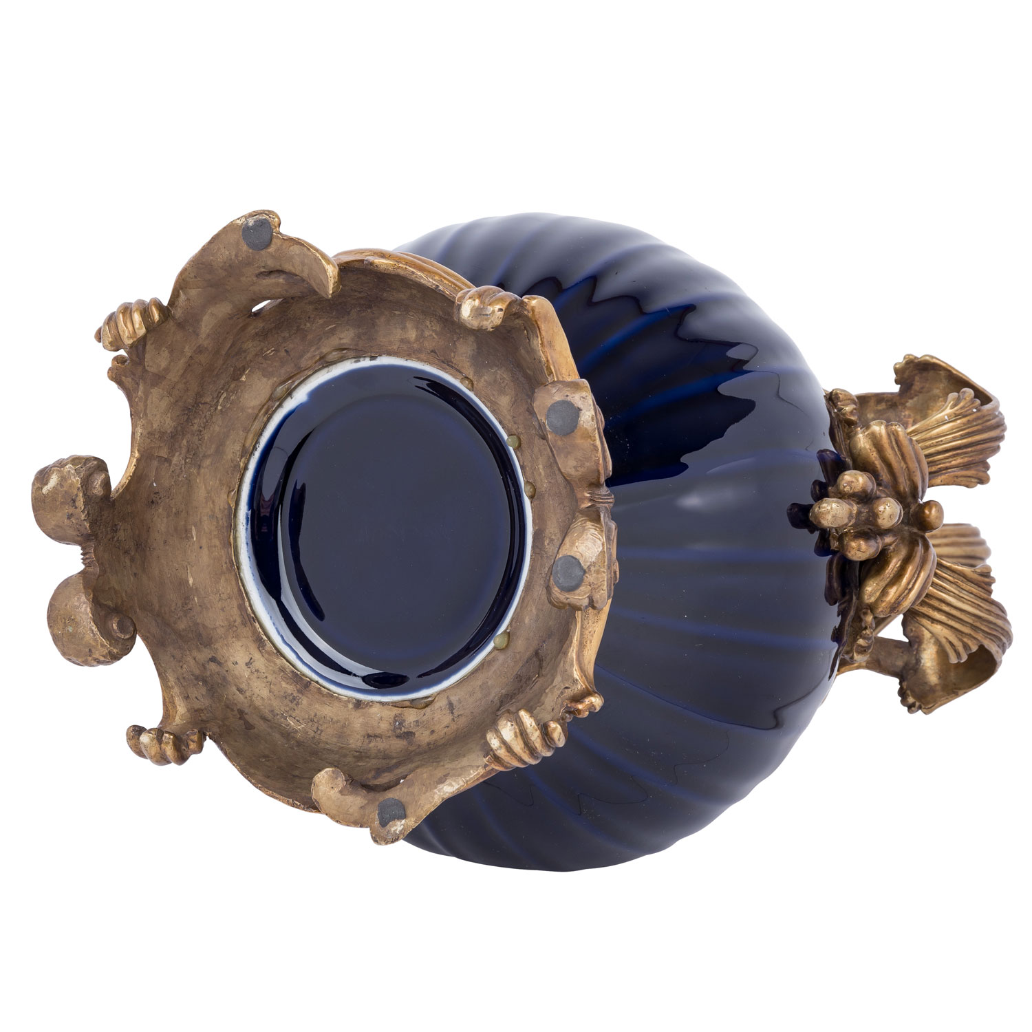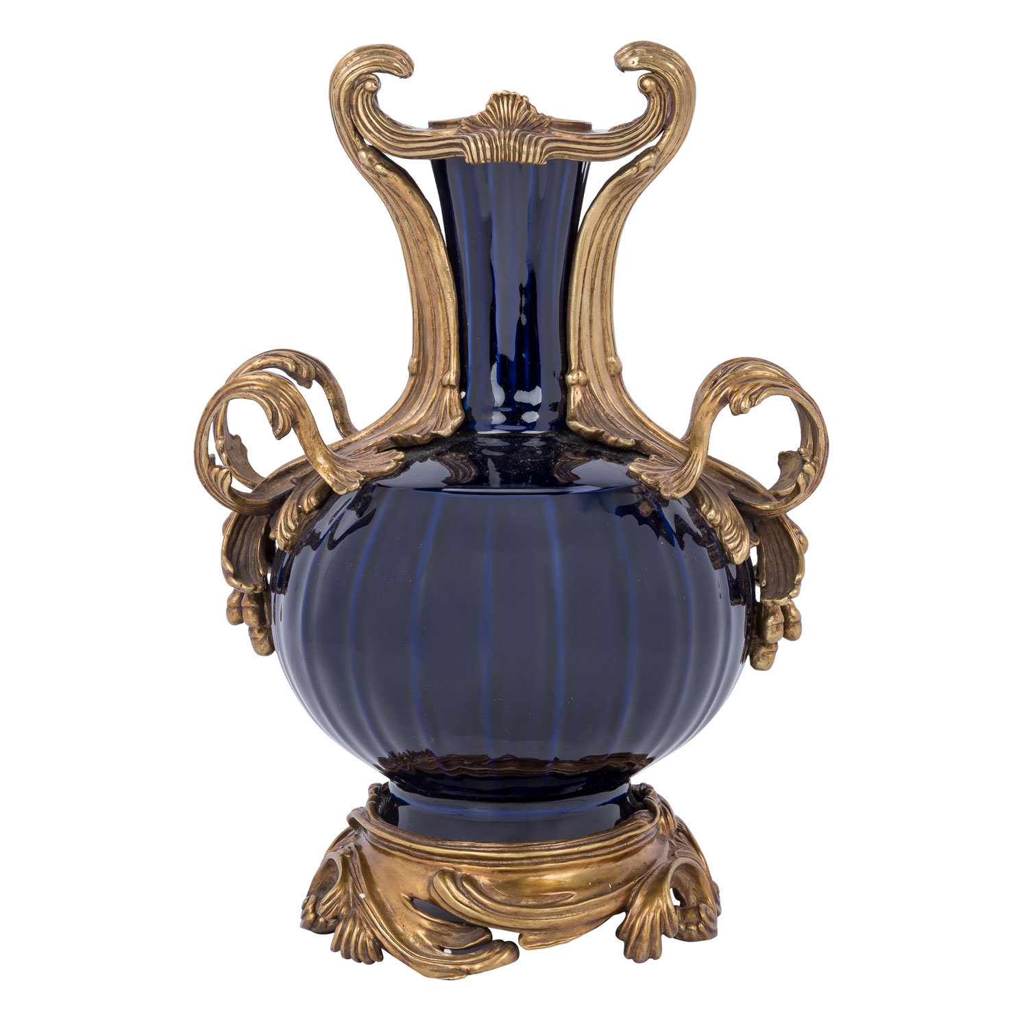 Dunkelblau glasiert und mit Messingmontur reich verziert, H: 39.