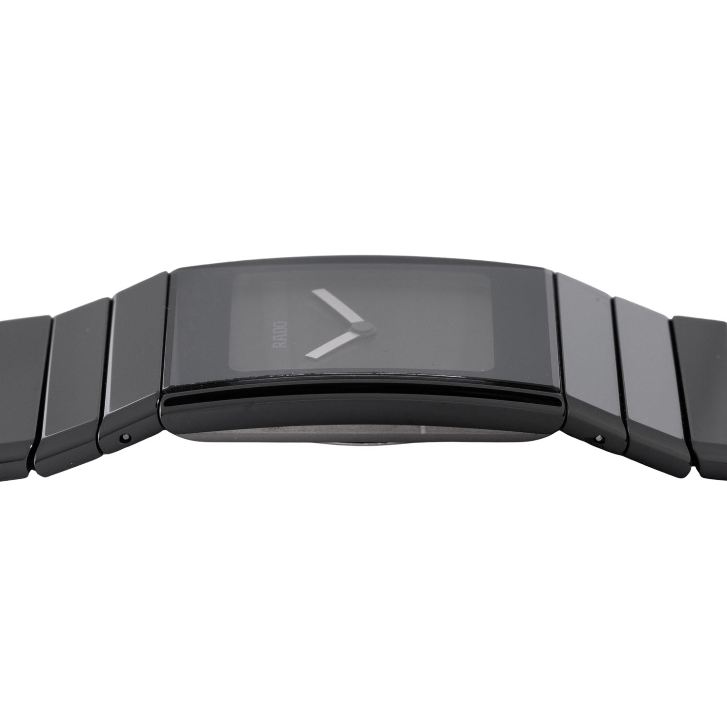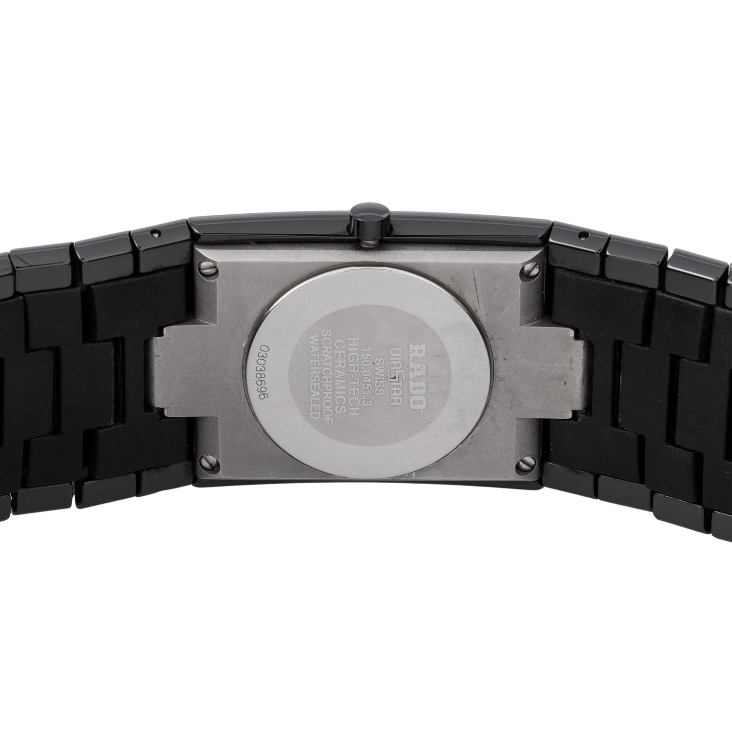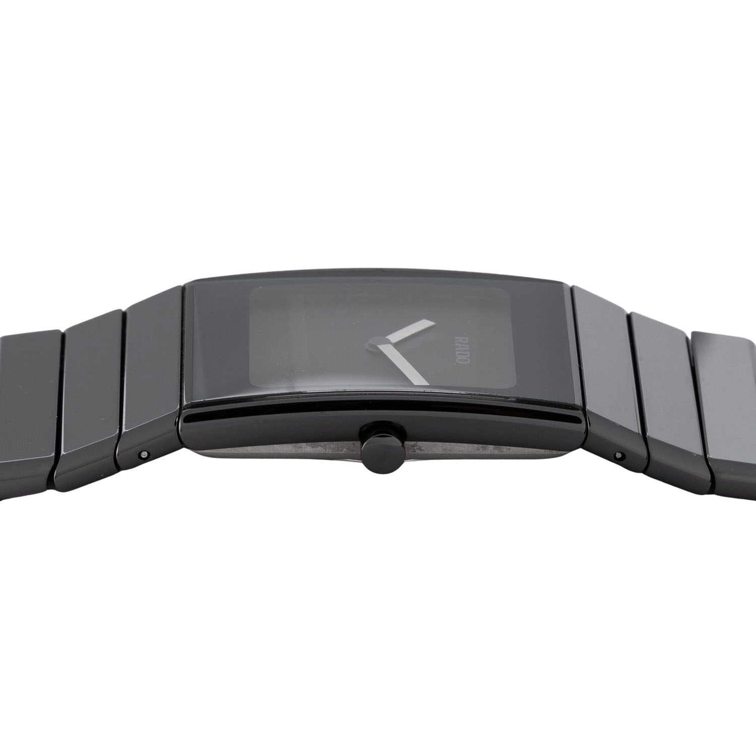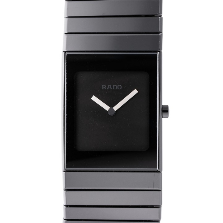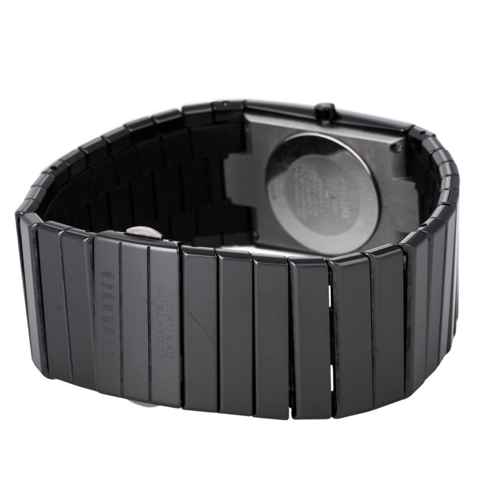 Keramik. Seriennummer 03038696. Quarzwerk in funktionsfähigem Zustand. Neue Batterie. Schwarzes Zifferblatt mit Silberfarbenen Zeigern. Rado Keramik Armband (mit Stretch) mit Faltschließe aus Titan. Guter Zustand mit Tragespuren am Gehäuse, Armband und am Glas (Kratzer an beiden Seiten). Durchmesser ca. 27 mm (gemessen ohne Krone). Passend bis zu ca. 20,5 cm Handgelenkumfang.