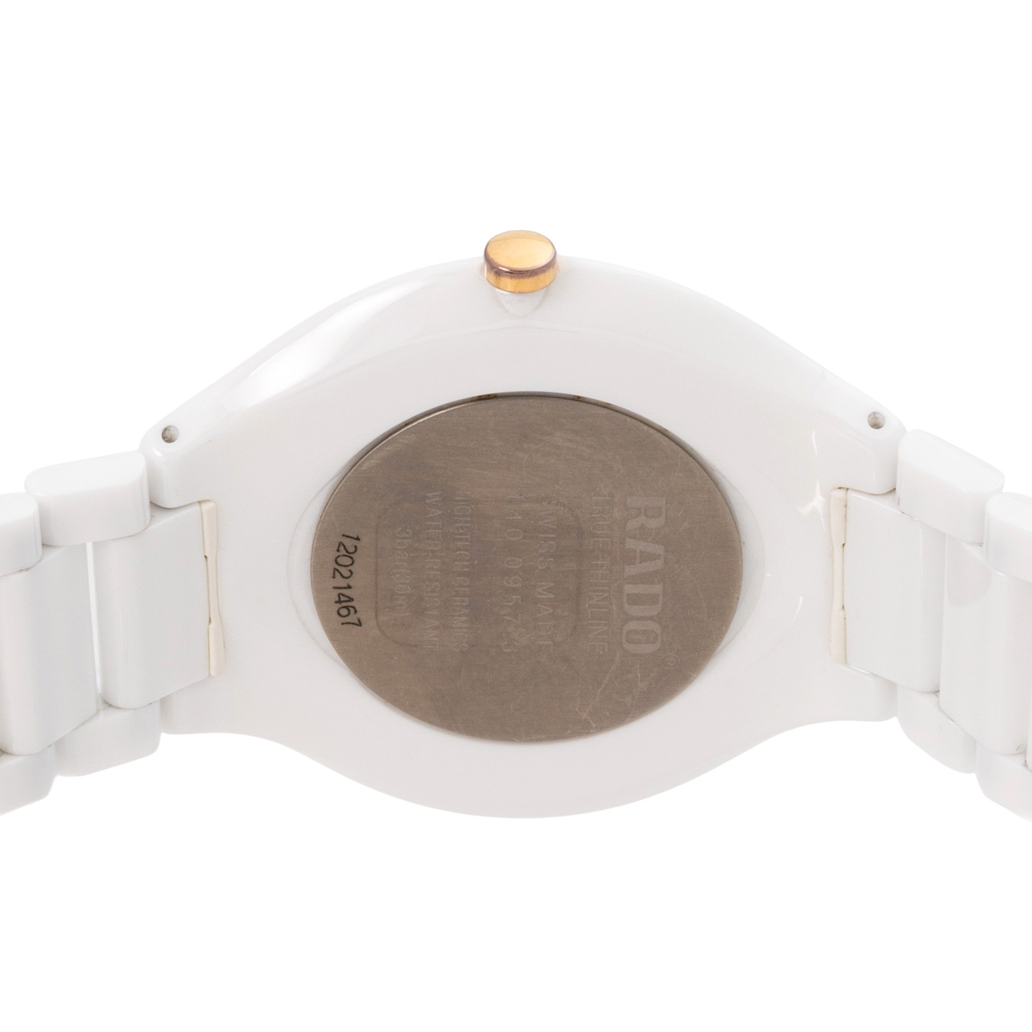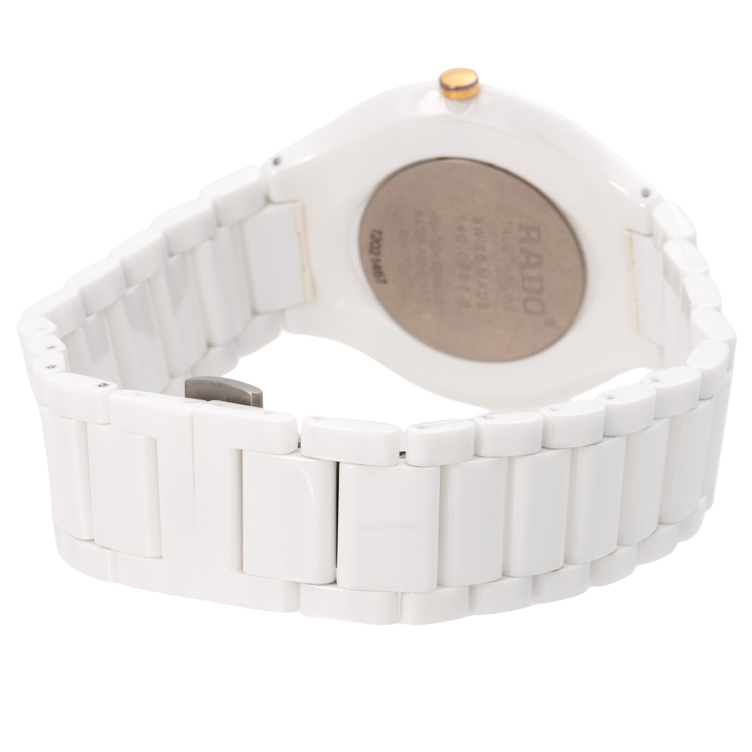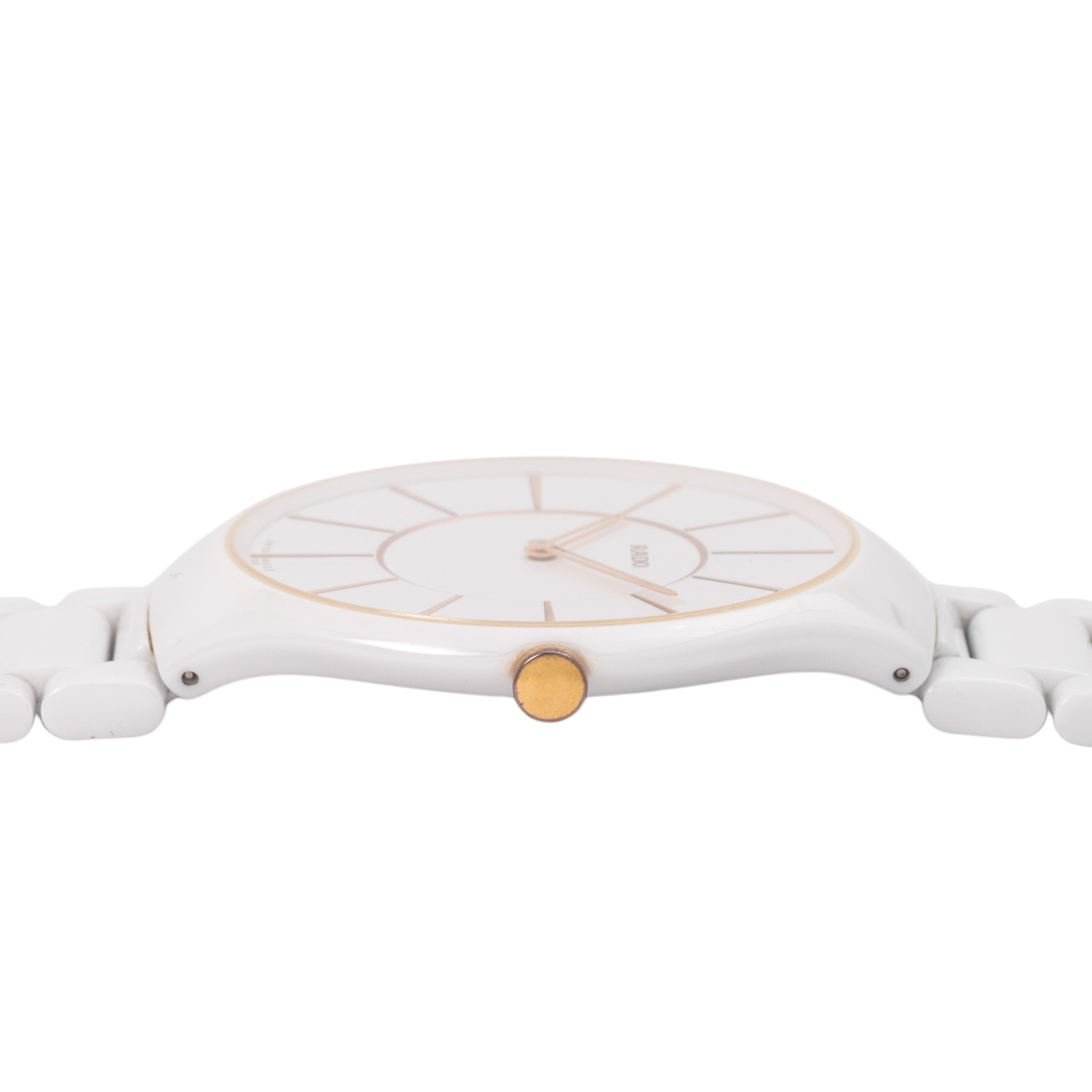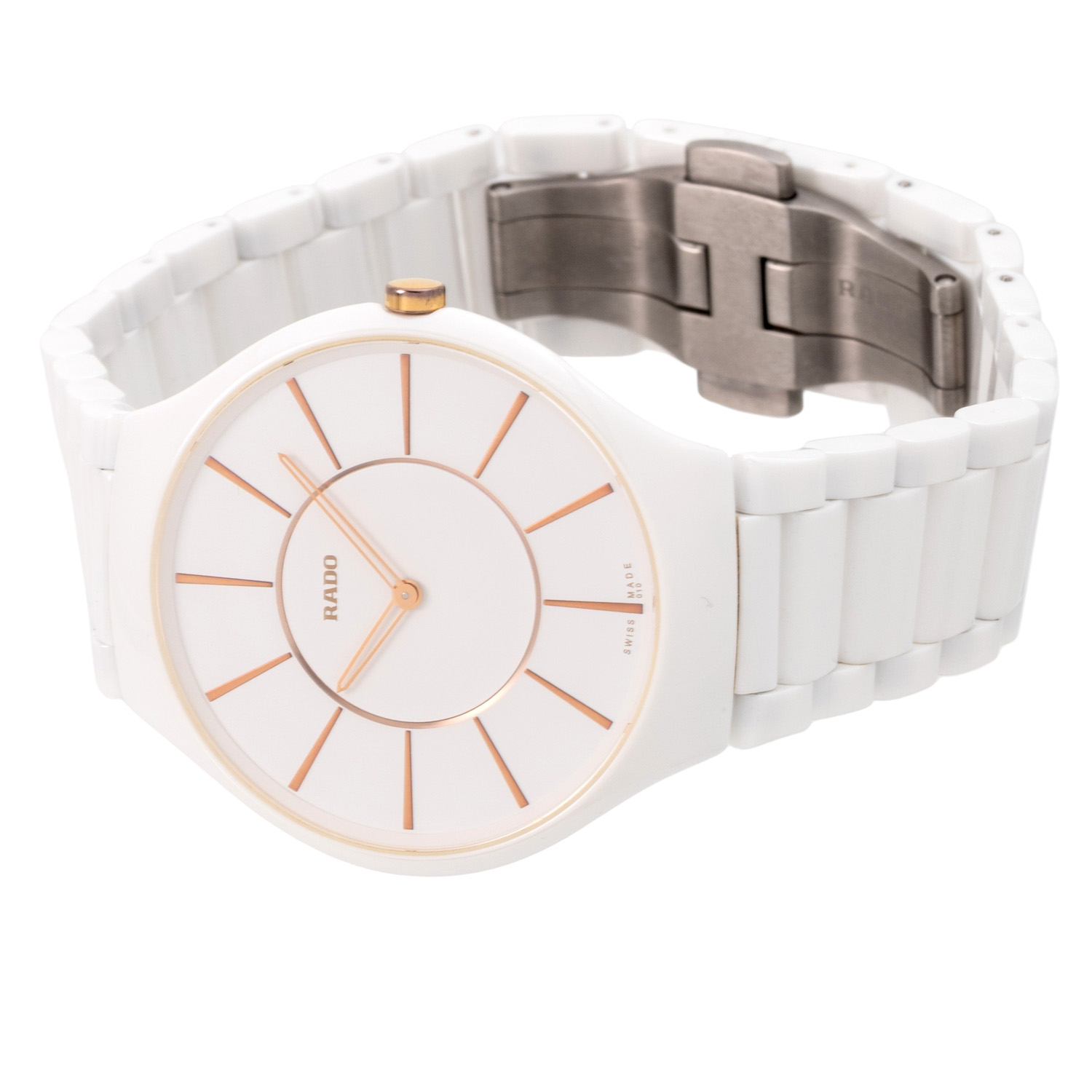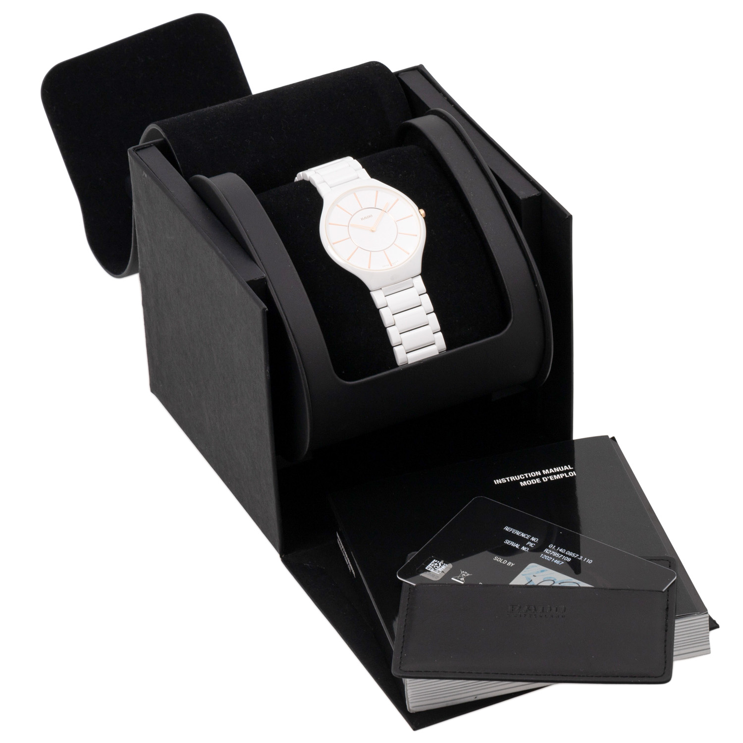 Keramik mit Titanboden, Gehäusenummer 12021467. Quarzwerk ETA Kal. 210.001 mit neuer Batterie, Werk läuft. Weißes Zifferblatt mit roséfarbenen Stabindizes. Keramik-Gliederarmband mit Butterflyschließe. Guter Zustand, leichte Tragespuren. Original Box und Papiere von 08/2012, gekauft bei Juwelier Wollnitza in Füssen, Rado Mikrofasertuch und Beschreibung anbei. Durchmesser ca. 39 mm gemessen ohne Krone. Passend bis zu einem Handgelenksumfang von ca. 19,5 cm.