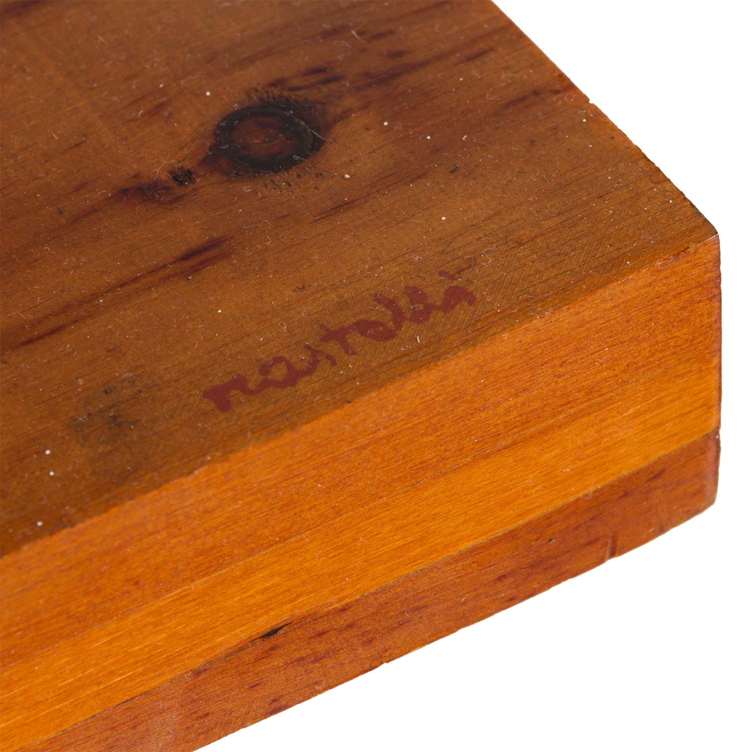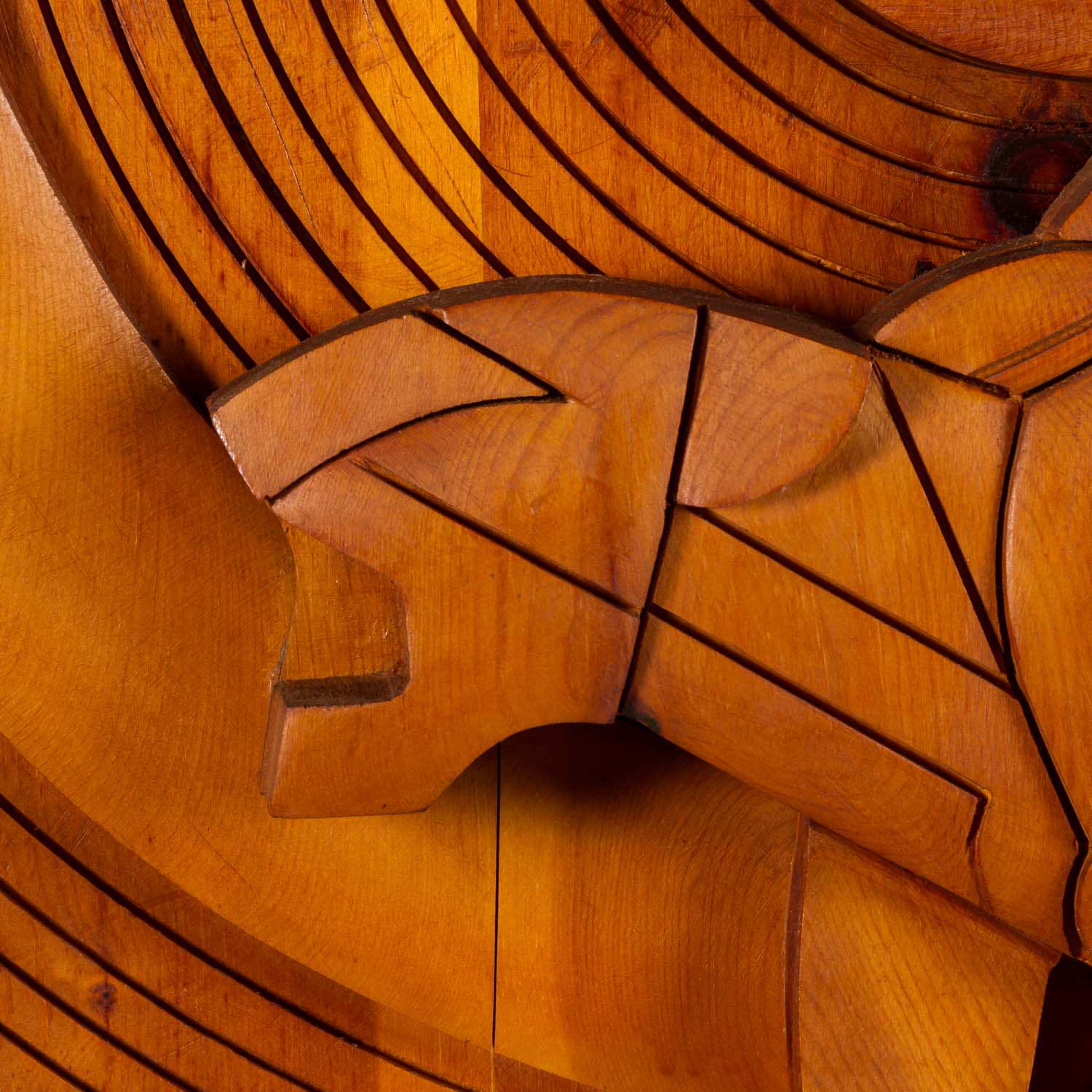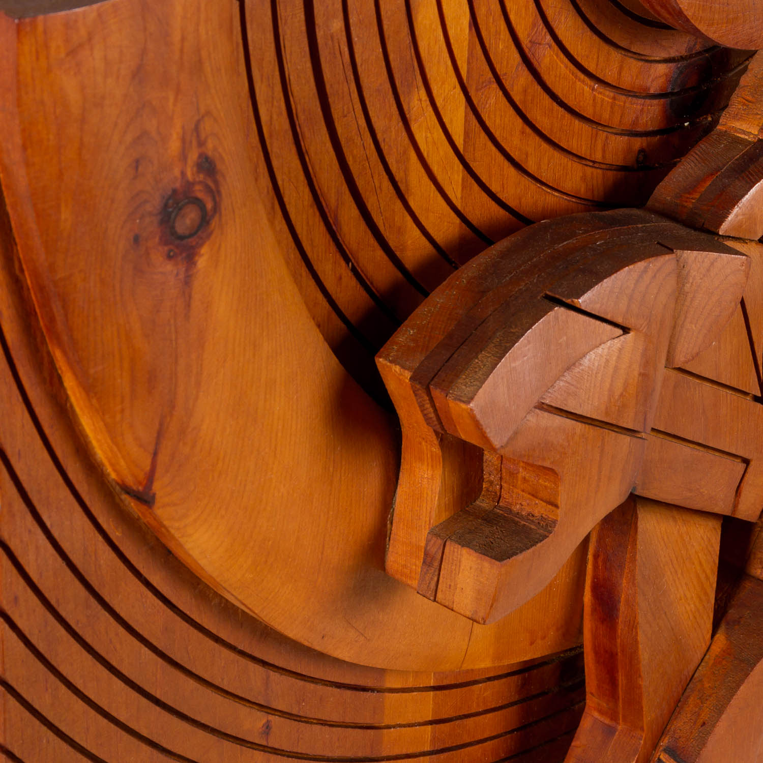 Holz geschichtet und beschnitzt, stilisierte Darstellung, auf rechteckiger Holzplinthe montiert, auf der Plinthe signiert, HxB: ca. 77x61 cm. Altersspuren, part. Trocknungsrisse. PROVENIENZ: 1987 bei Galerie Architektur und Wohnbau, Burgstetten erworben. NICHT FÜR VERSAND GEEIGNET - BITTE NUR ZUR ABHOLUNG.