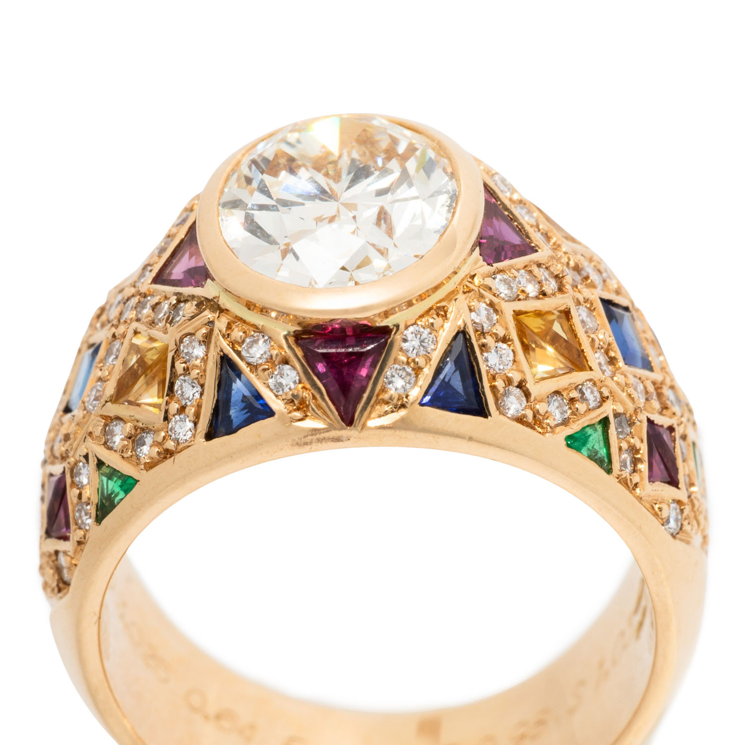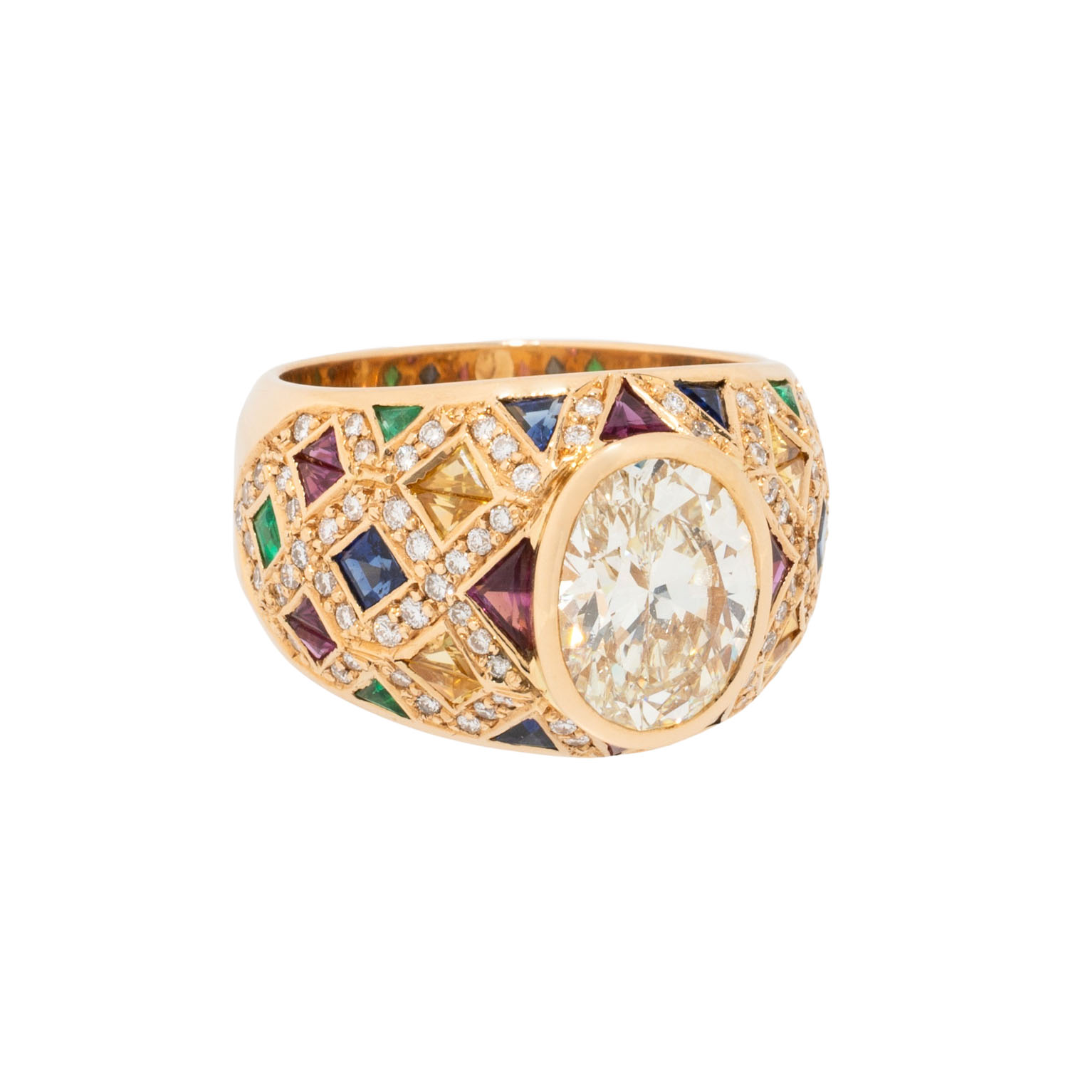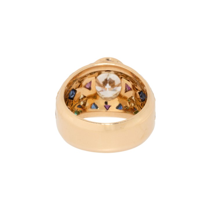 (grav.) ca. LGW (J)/ VVS, weitere Brillanten zus. ca. 0,64 ct (grav.) gute Farbe u. Reinheit, Rubine, Saphire und Smaragde im Trillant -und Carreeschliff zus. ca. 2,27 ct (grav.), GG 18K, 16,1g. RW: 56, 20./21. Jh., leichte Tragespuren.