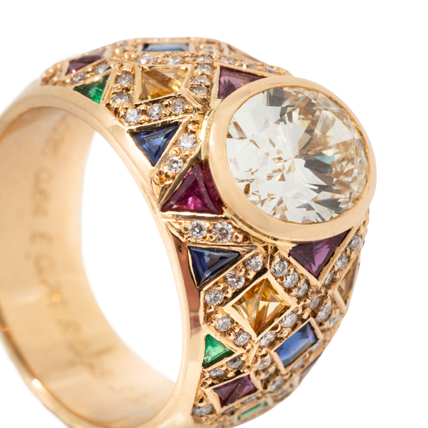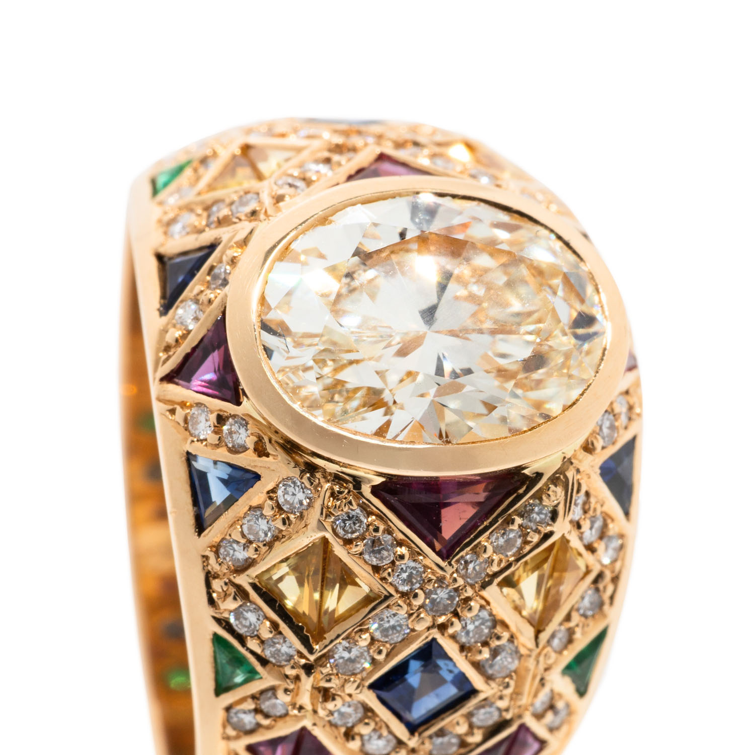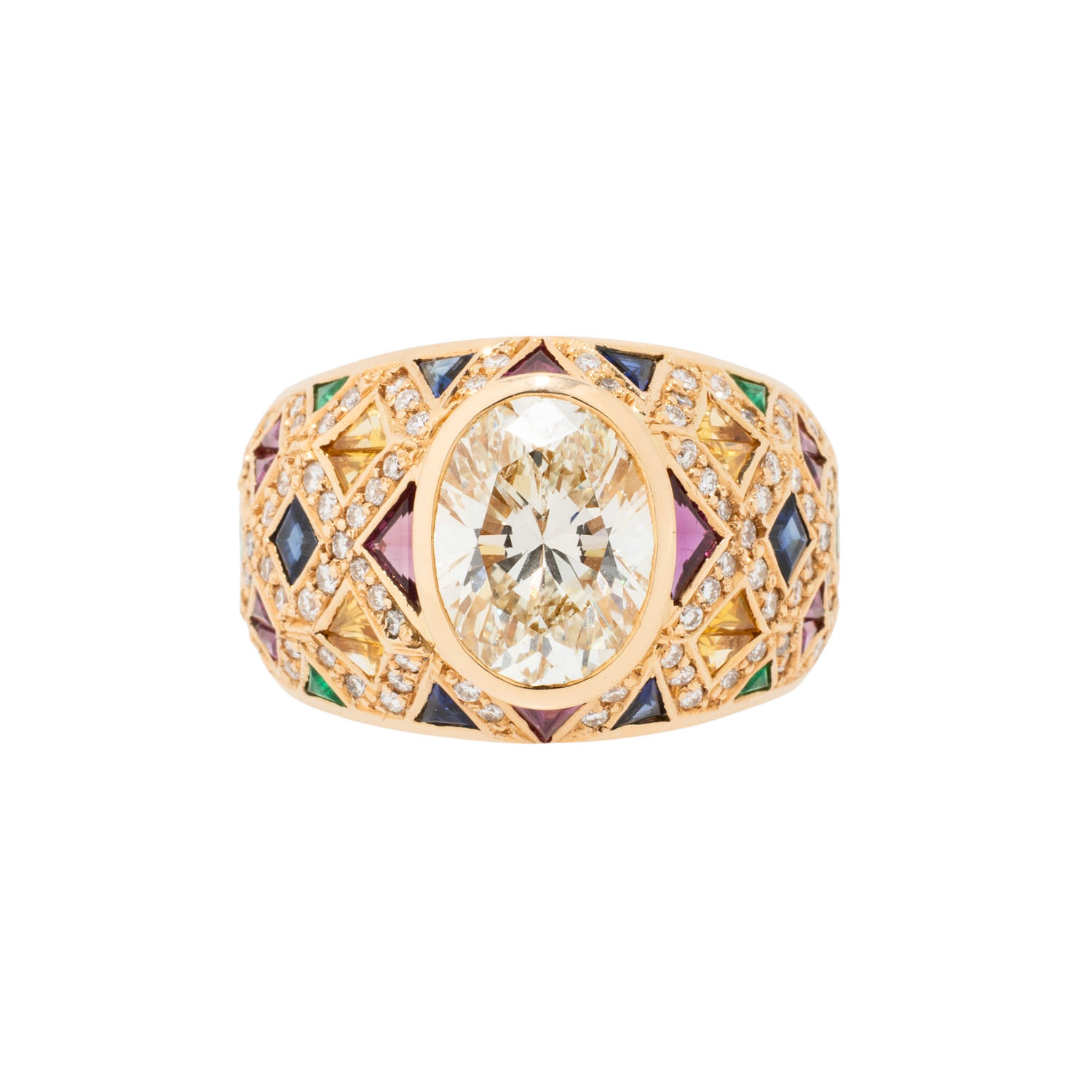 (grav.) ca. LGW (J)/ VVS, weitere Brillanten zus. ca. 0,64 ct (grav.) gute Farbe u. Reinheit, Rubine, Saphire und Smaragde im Trillant -und Carreeschliff zus. ca. 2,27 ct (grav.), GG 18K, 16,1g. RW: 56, 20./21. Jh., leichte Tragespuren.