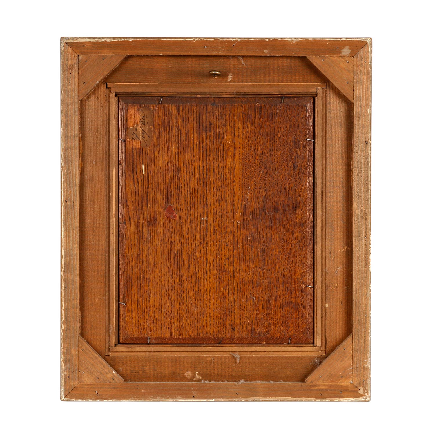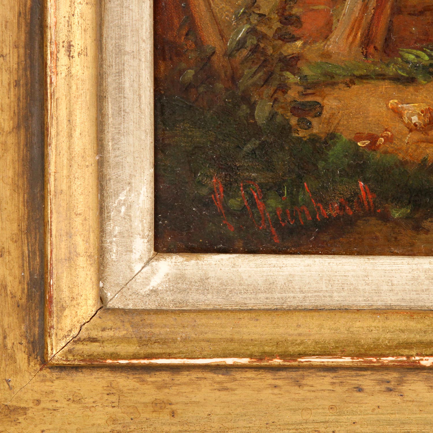 REINHARDT, LOUIS (Plauen 1849-1870 Traunsee), "Vor dem Hühnerstall", unten links signiert 'L. Reinhardt', Öl auf Holz, HxB: 27x22 cm. Leicht krakeliert, min. Rahmenadbruck. Mit Rahmen.