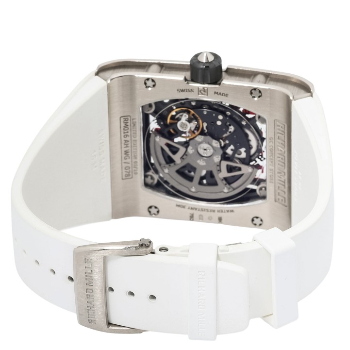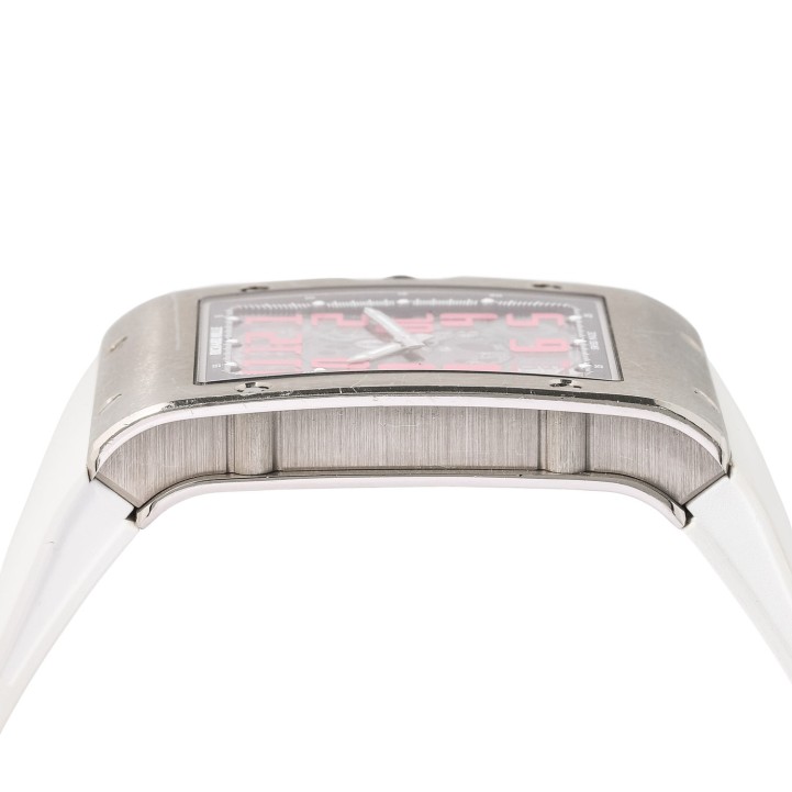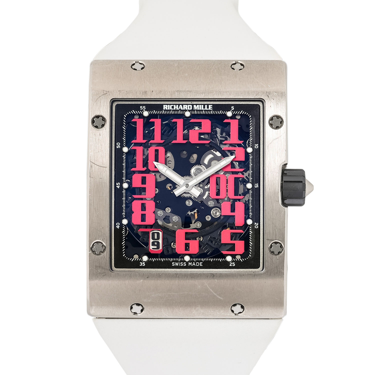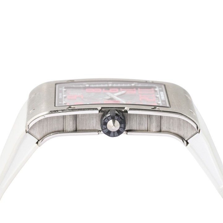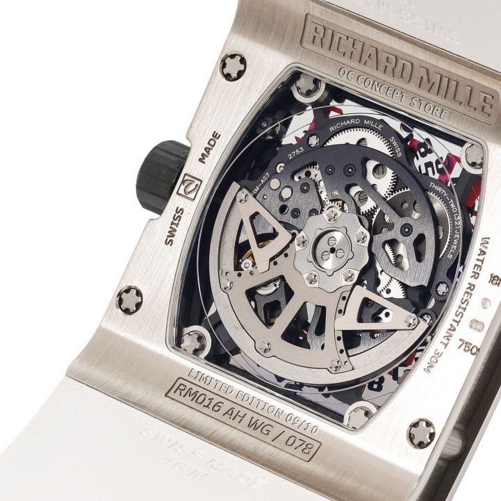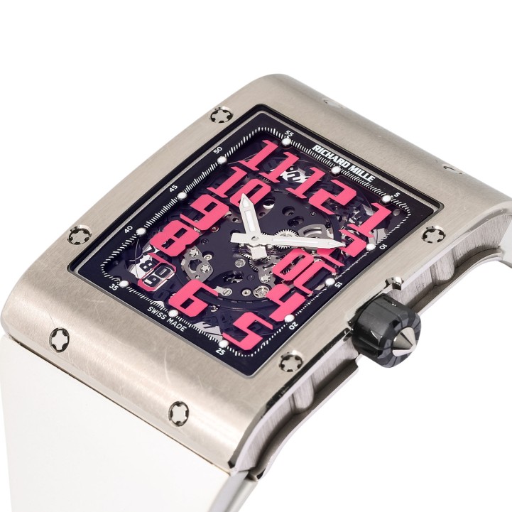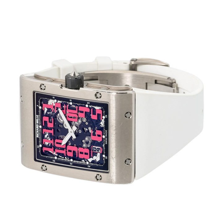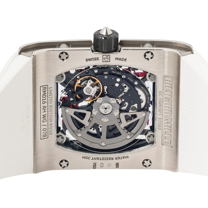Weißgold 18K, Krone aus Keramik, Gehäuseboden mit Sichtfenster, limitierte Auflage Nr. 9 von nur 10 Stück weltweit, hergestellt anlässlich der Eröffnung des OC Concept Store in New Yorl City 2010. Skelettiertes Automatic-Werk Kal. RM-AS7 mit 2 Federhäusern und 32 Lagersteinen, sehr gute Gangwerte (+3s/Tag, 271° Amplitude). Zifferblatt aus Saphirglas mit pinken arabischen Zifffern, übergoße Datumsanzeige auf Saphirglasscheibe, Leuchtzeiger. Originales Richard Mille-Kautschukband mit Butterfly-Faltschließe in Titan. Guter Zustand, sichtbare Gebrauchsspuren an Gehäuse und Armband. Durchmesser ca. 38 mm gemessen ohne Krone.