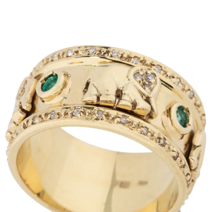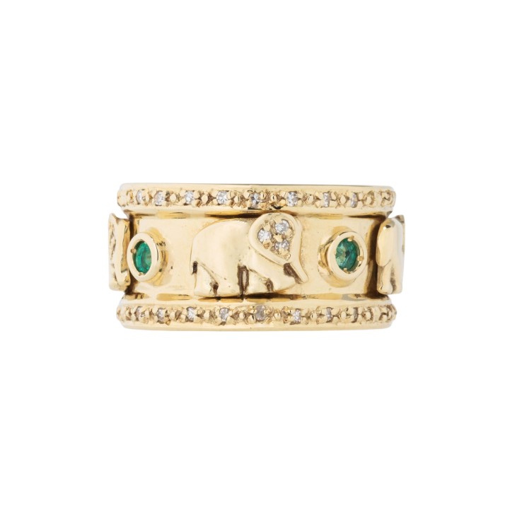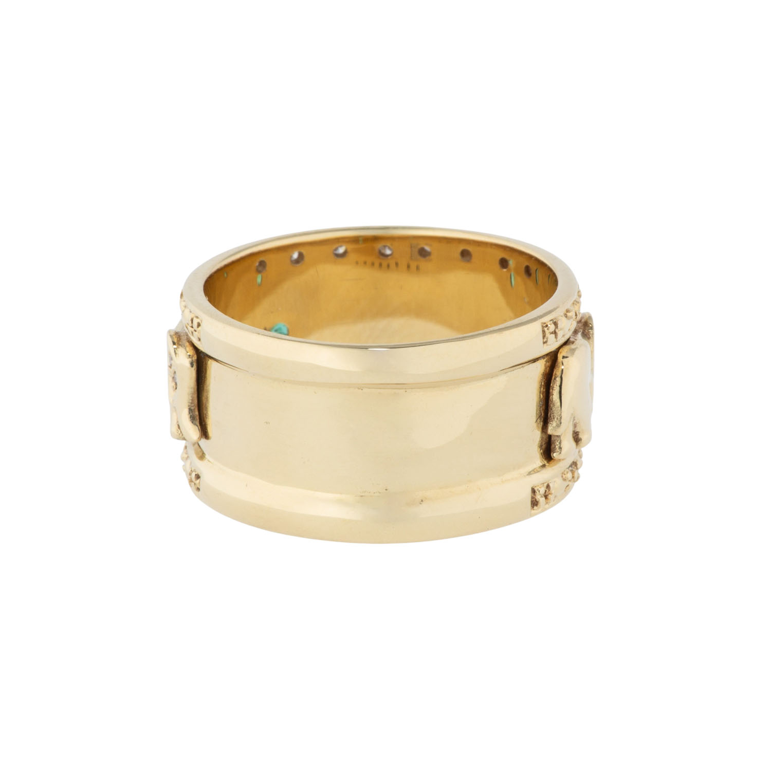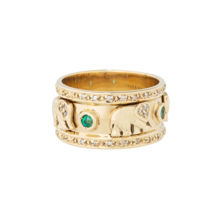 rund facettiert, D: ca. 2,5 mm, 27 Achtkantdiamanten, ca. 0,08 ct, GG 14K, 9 g, RW: 55, B: 10,6 mm, Ende 20. Jh., leichte Tragespuren.