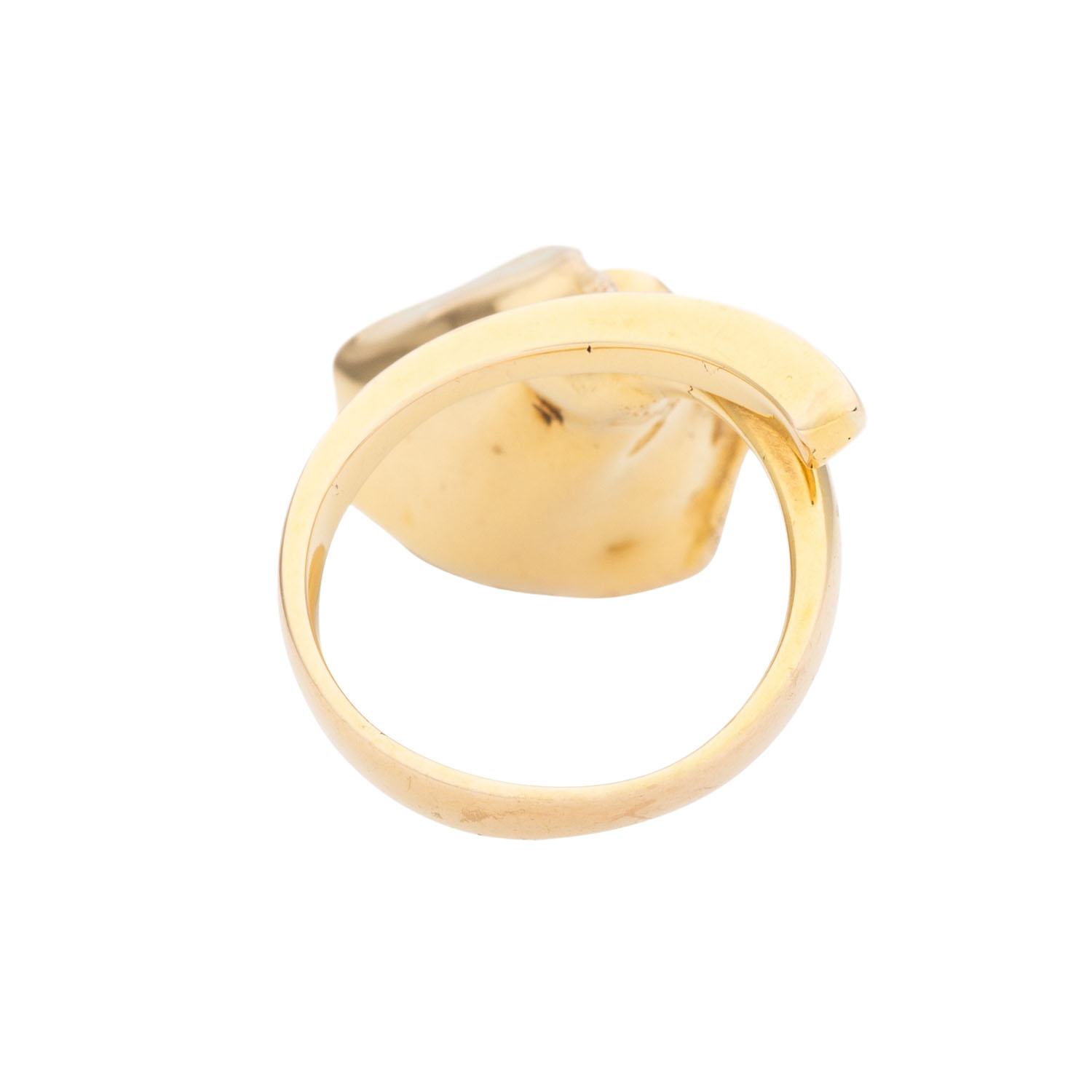 in heller Ceylonfarbe, GG 14K, 9,7 g, Ring: RW: 53, offene Ringschiene, B: ca. 3,6 - 25,4 mm, innen mit Gussporen, 2. H. 20. Jh., leichte Tragespuren, mit Herstellerpunze, Darstellung einer Callablüte.